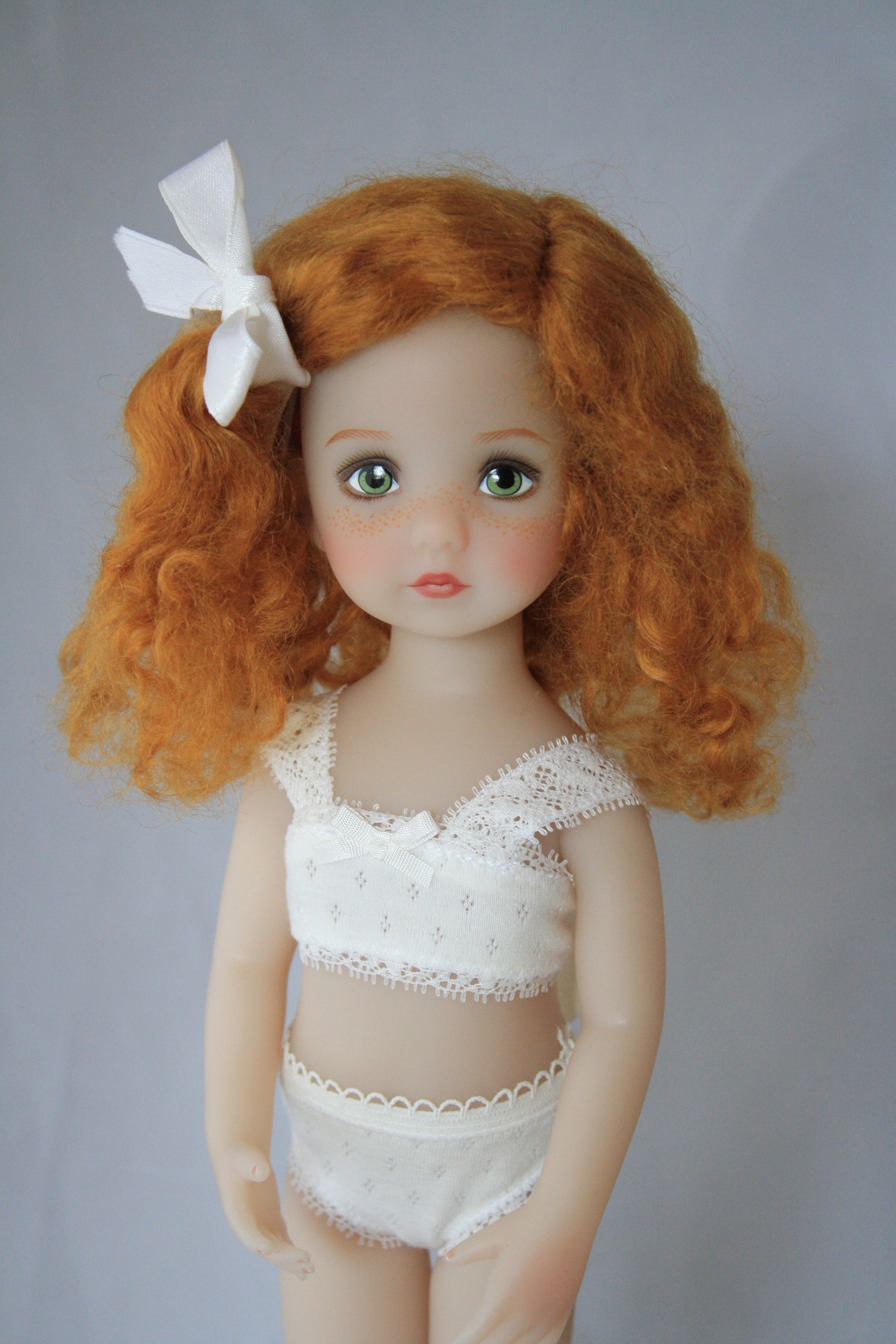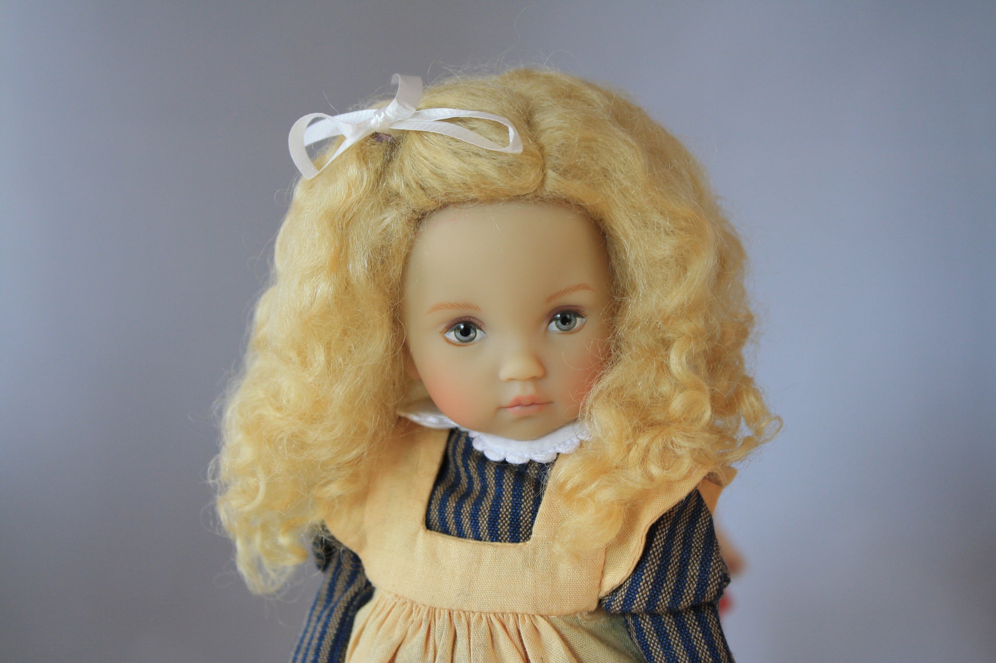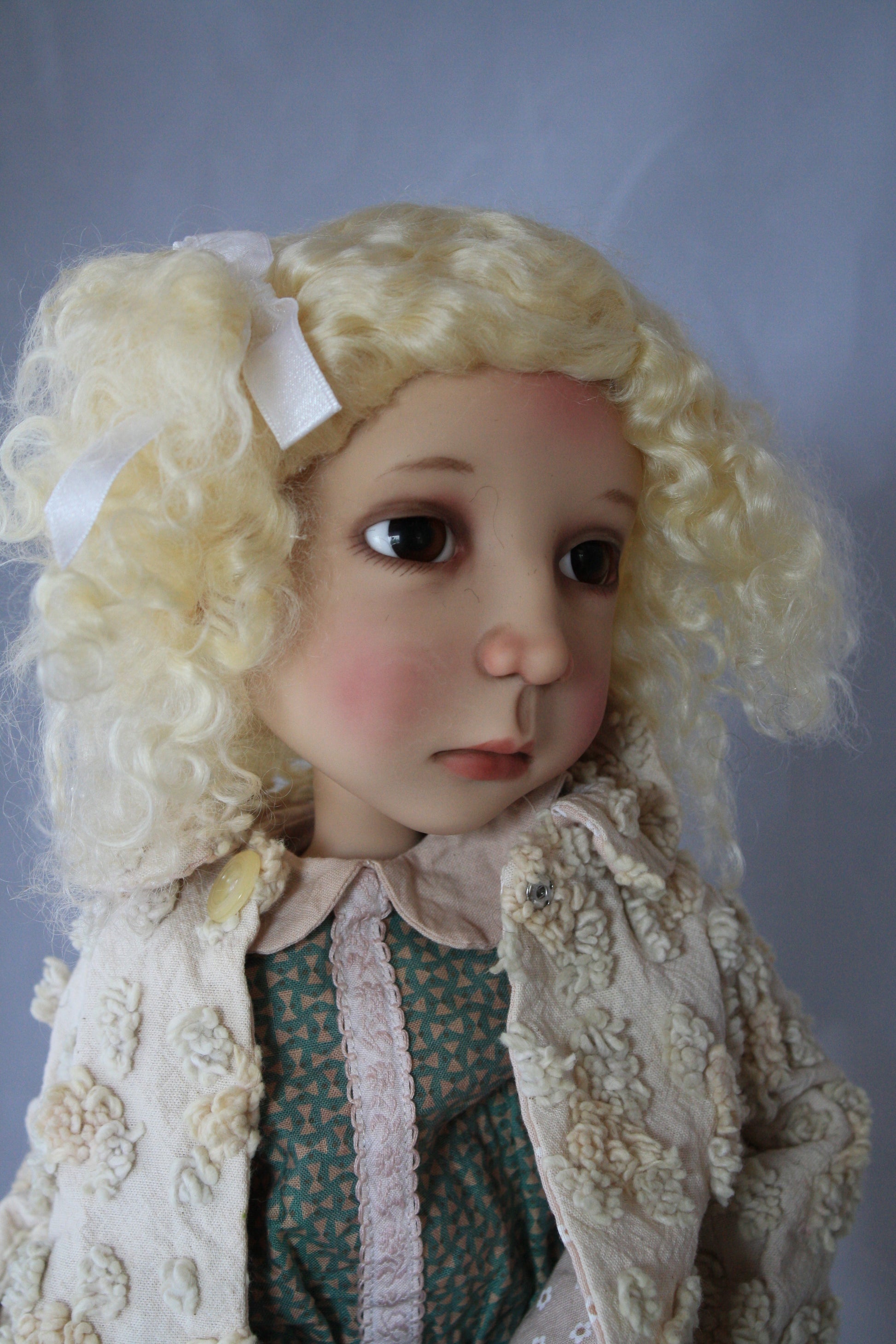 This is a sweet little wig. Pulled to the side with a bow. It has very soft curls.