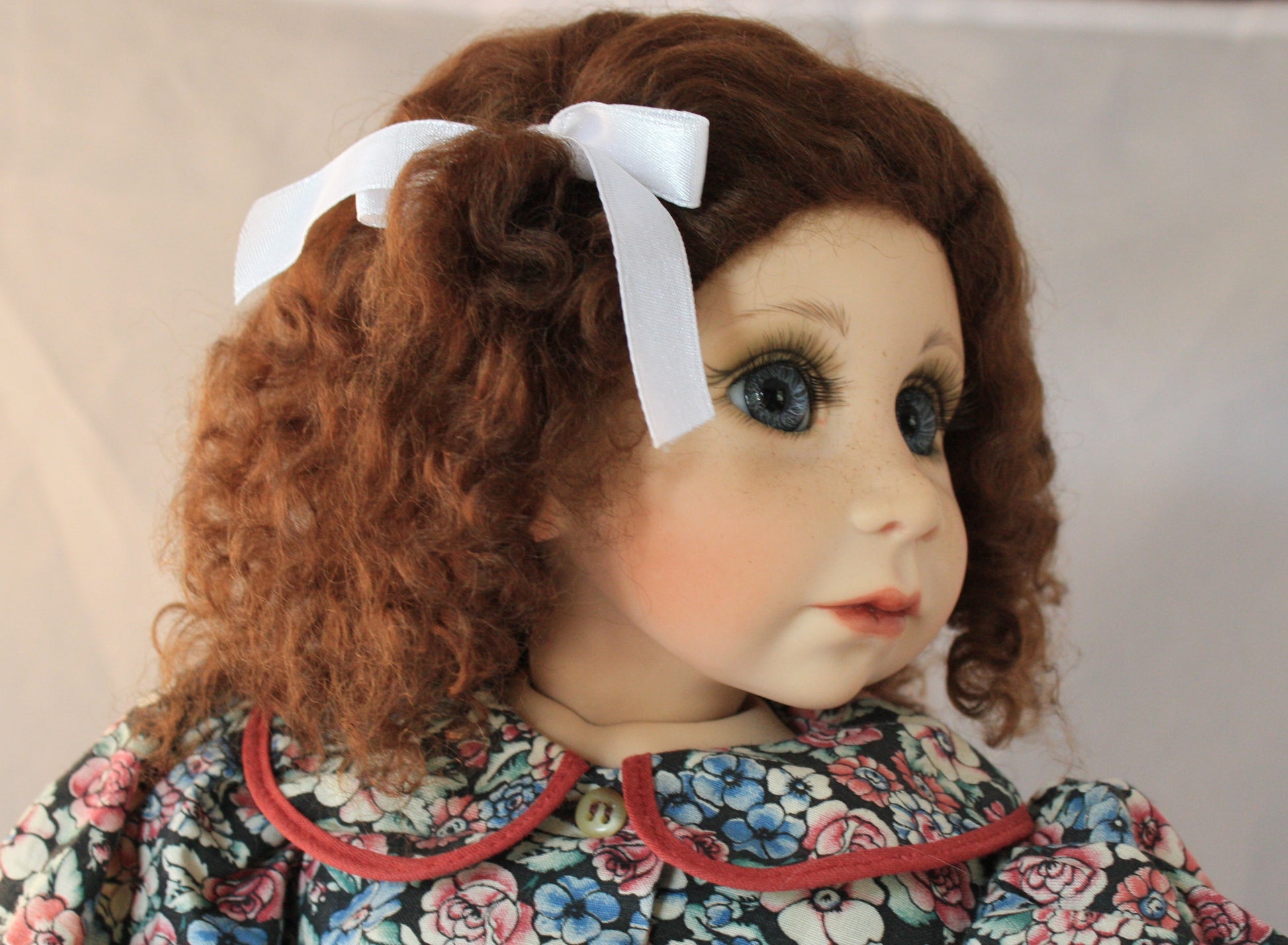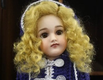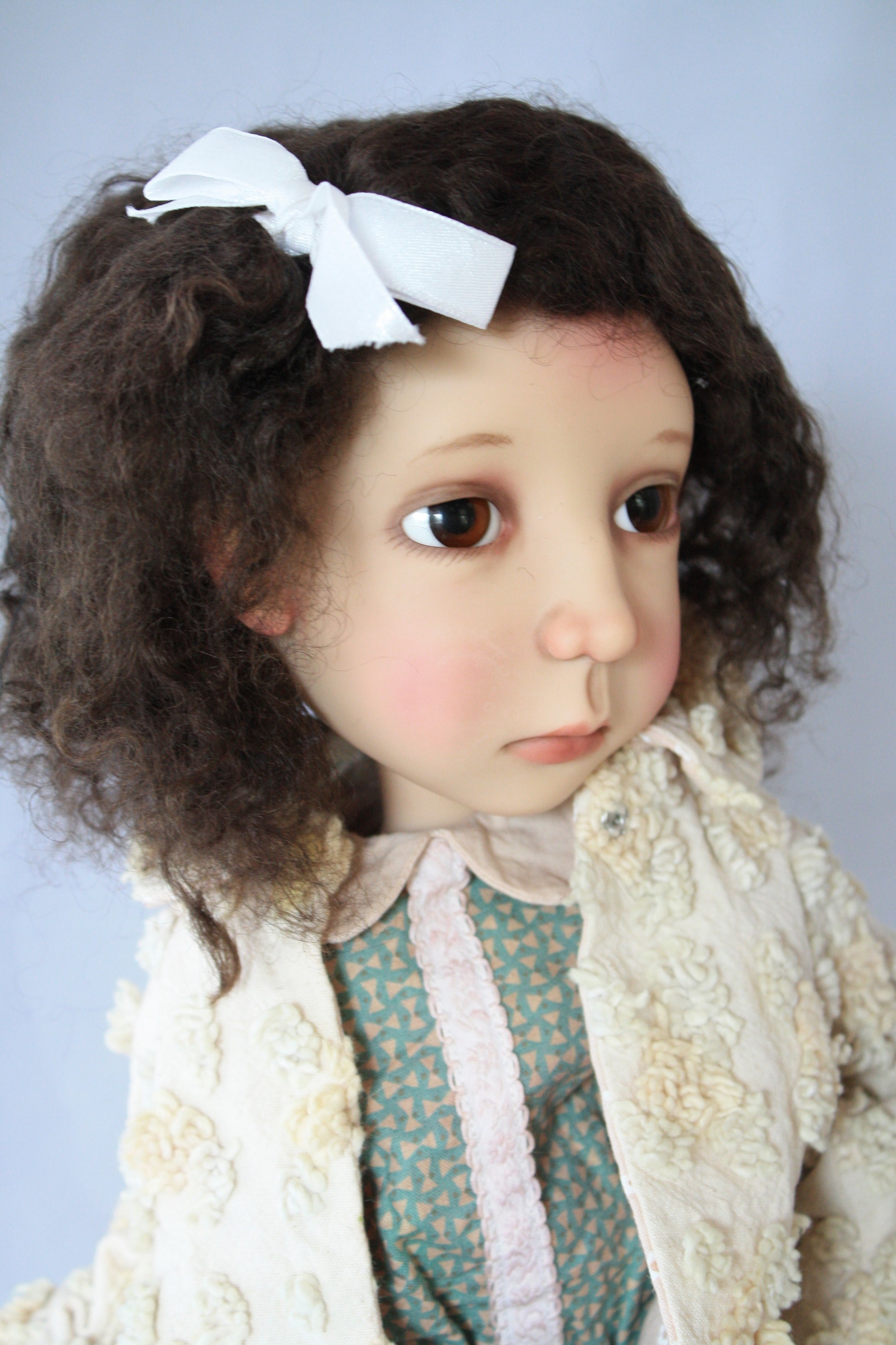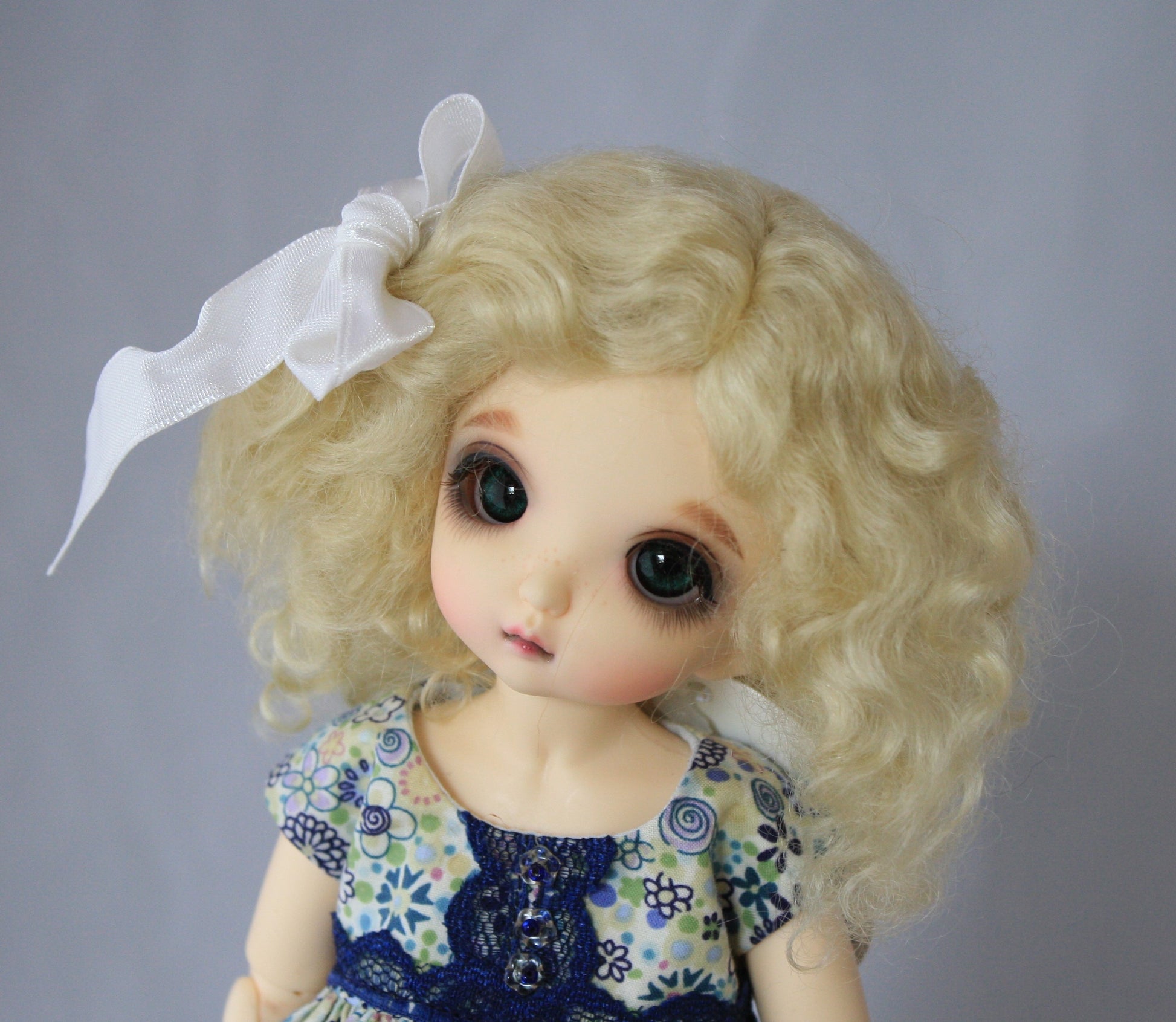 This is a sweet little wig. Pulled to the side with a bow. It has very soft curls.