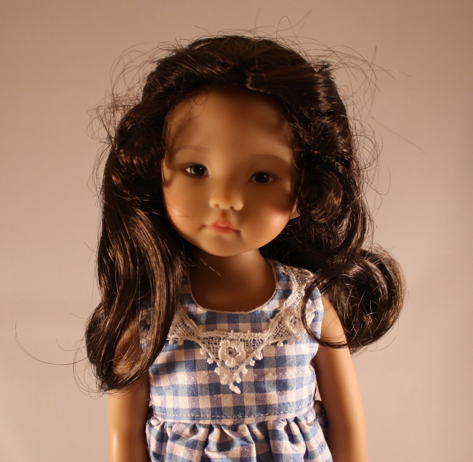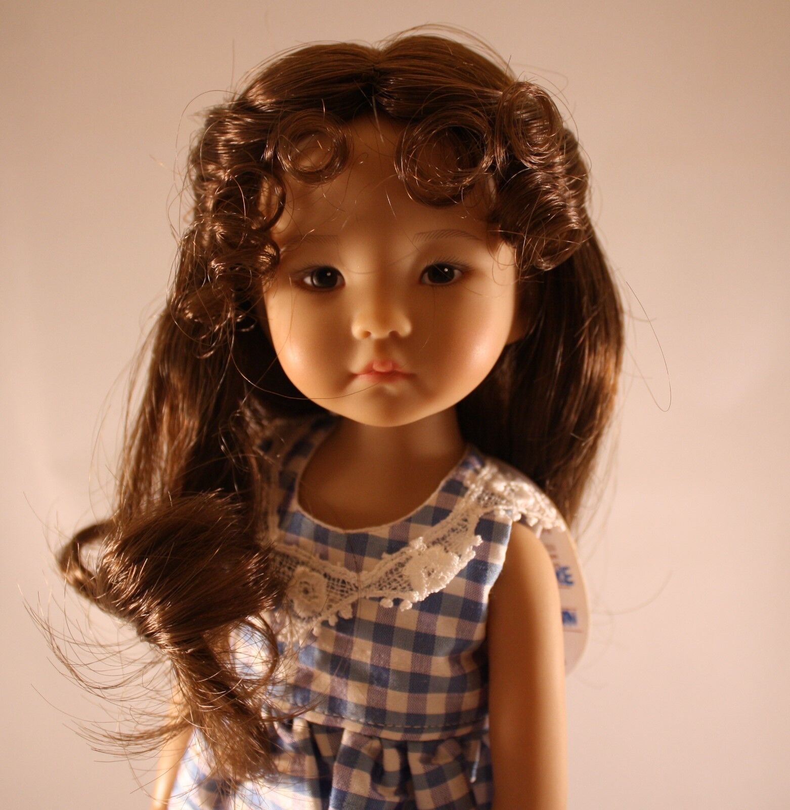 This is a long wavy wig pulled up at the sides. It has little tendrils around the face and is made of synthetic fibers.