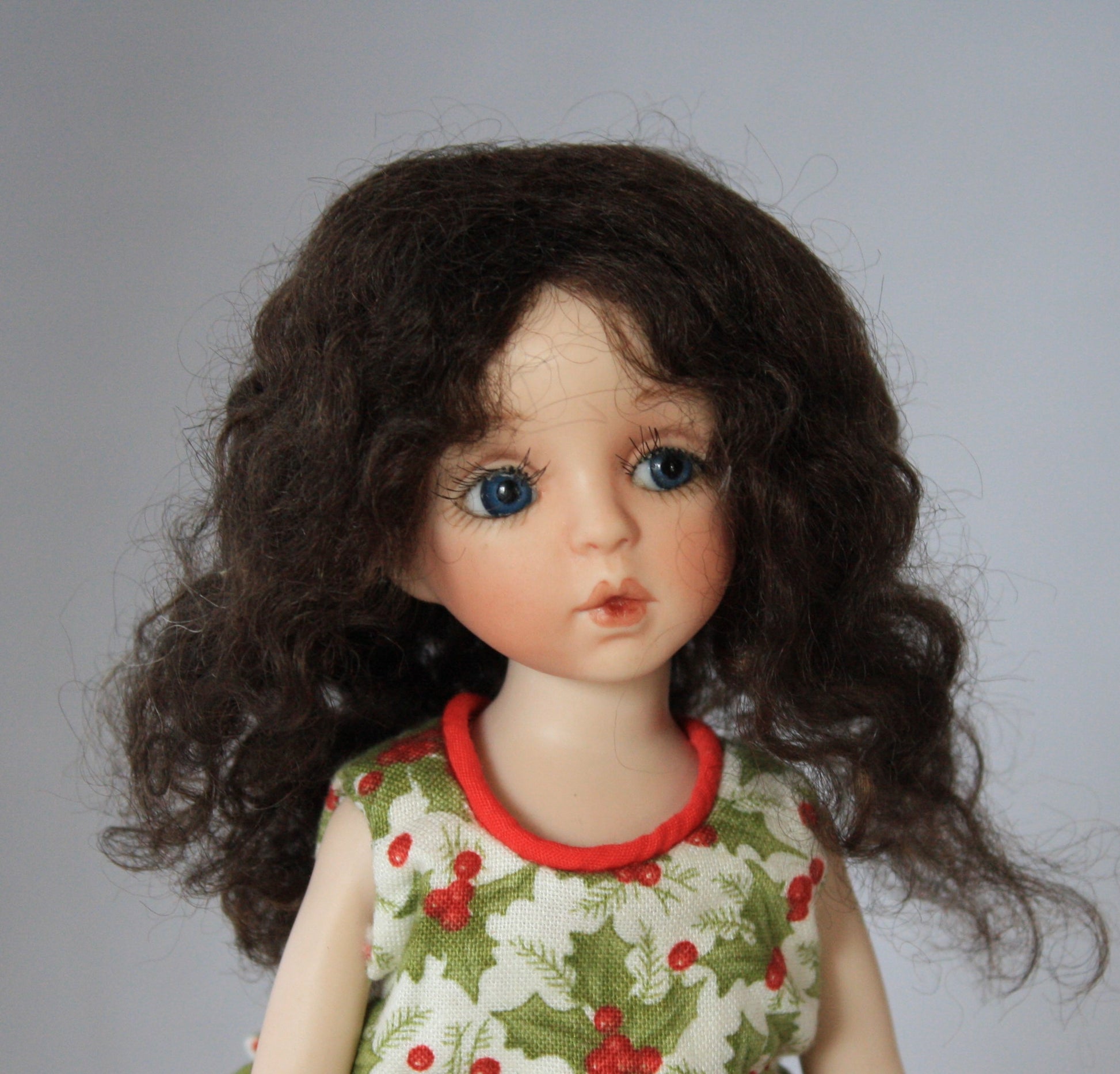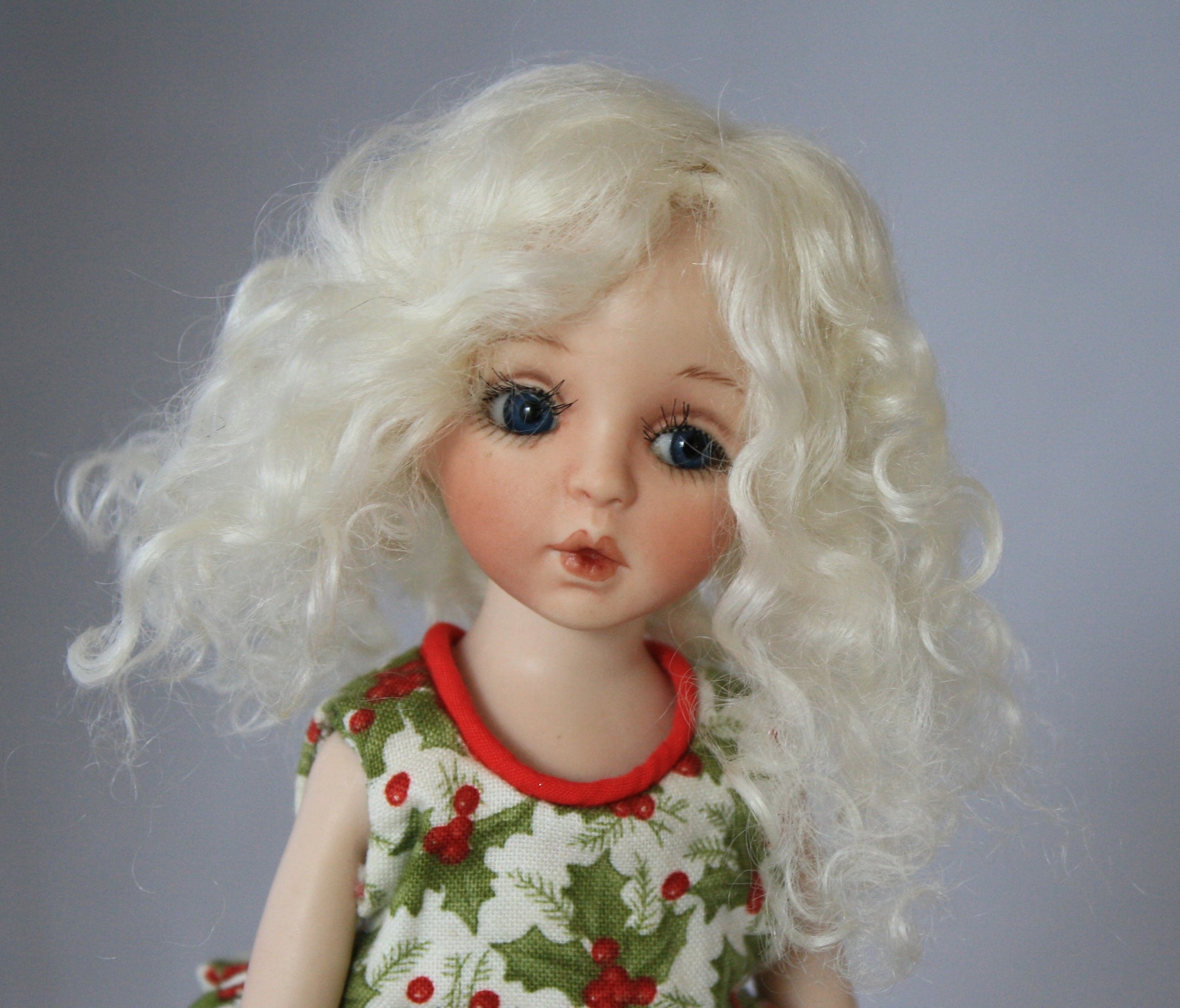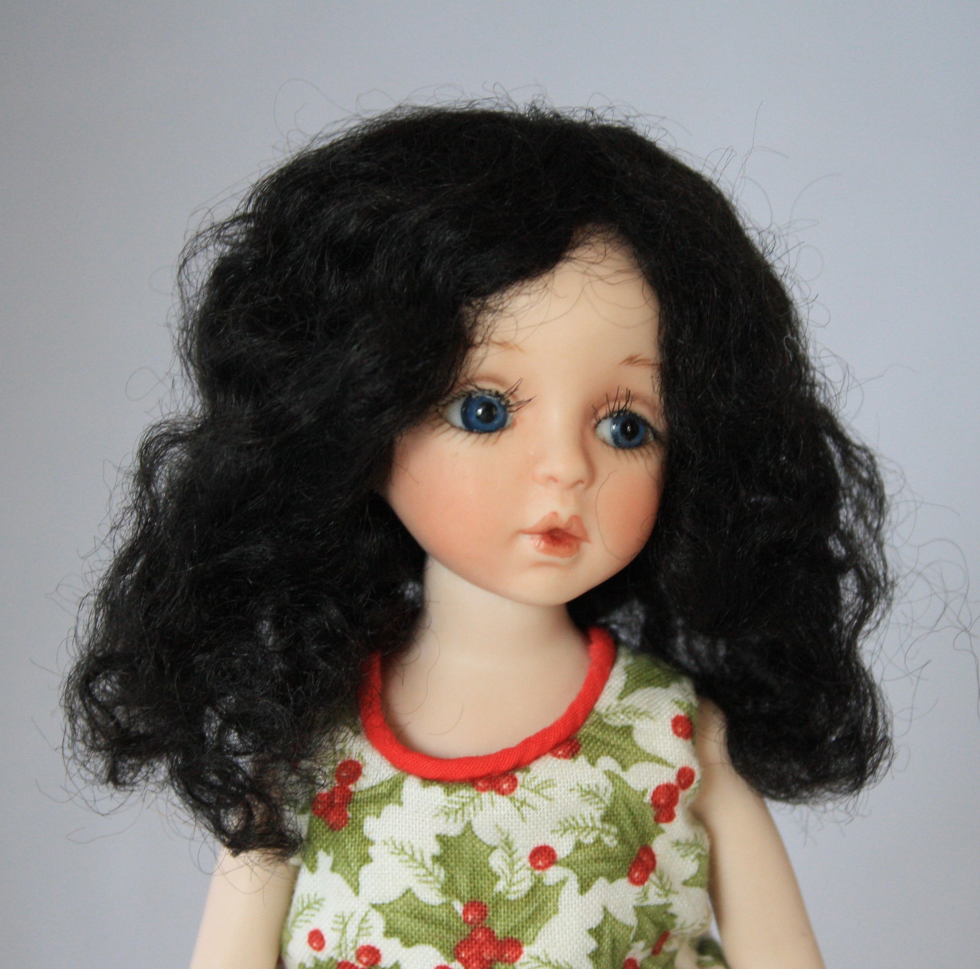 Claire style mini mohair wig comes in all available sizes and colors. She has long flowing hair with soft curls.