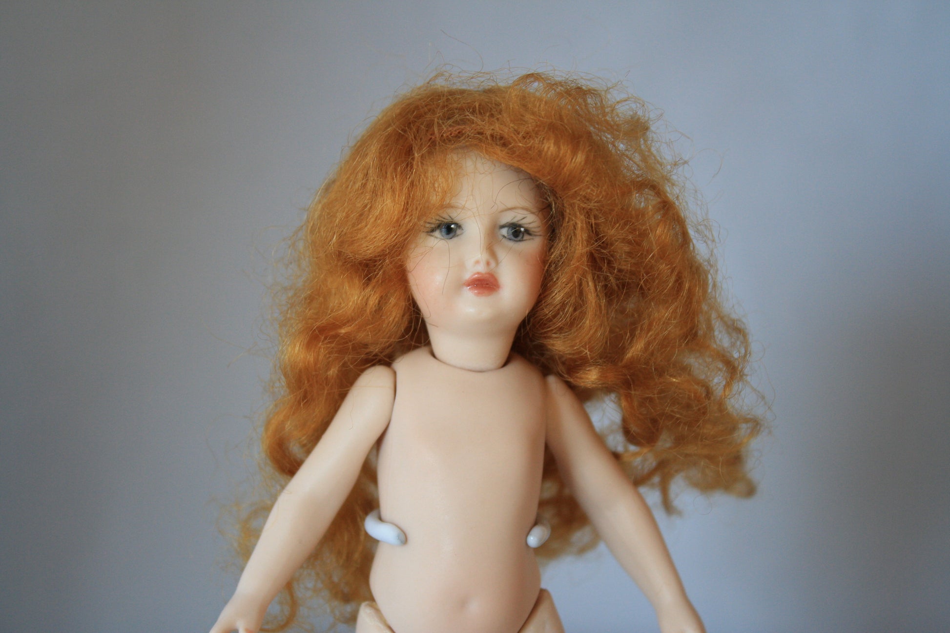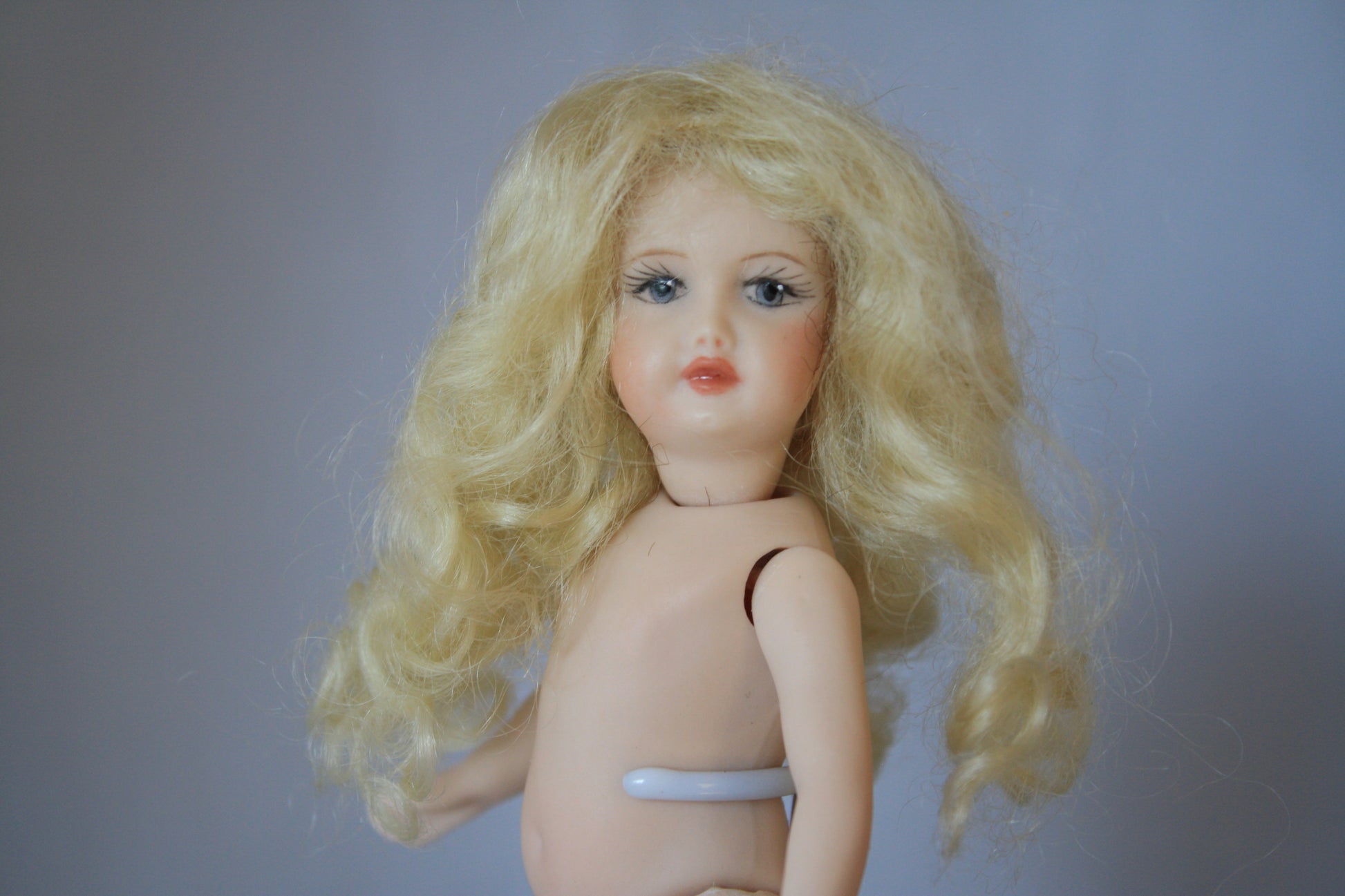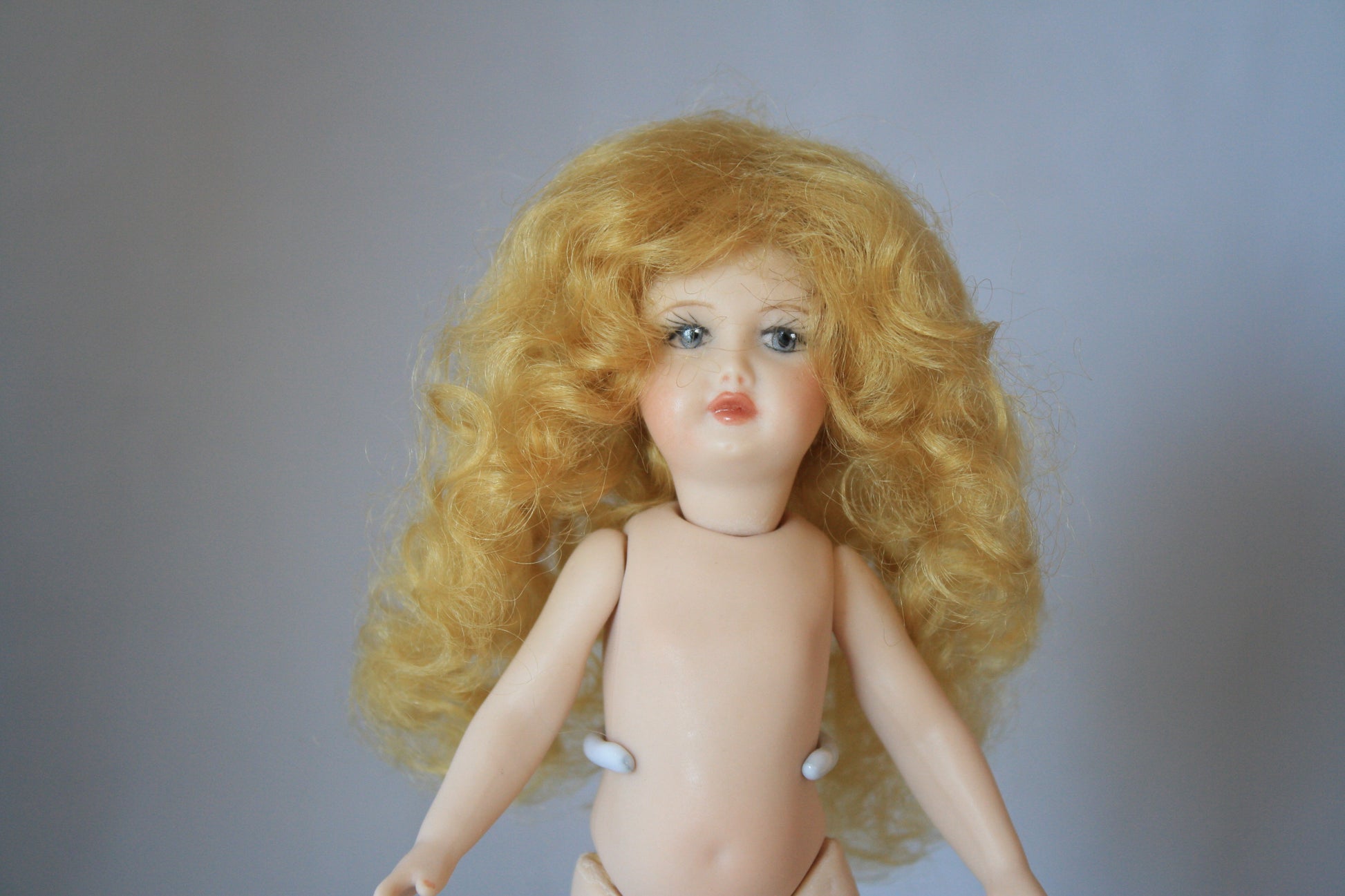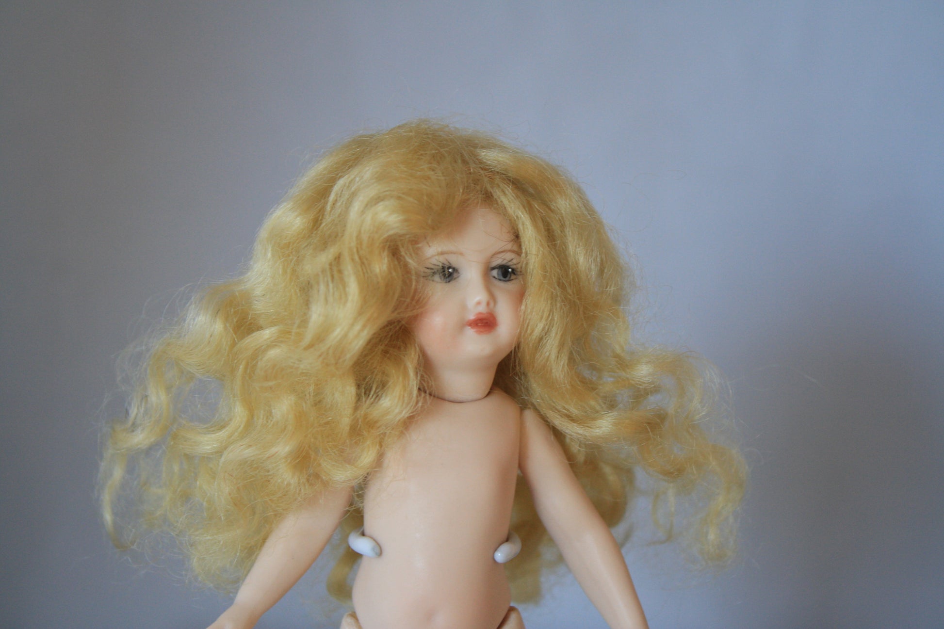 Claire style mini mohair wig comes in all available sizes and colors. She has long flowing hair with soft curls.