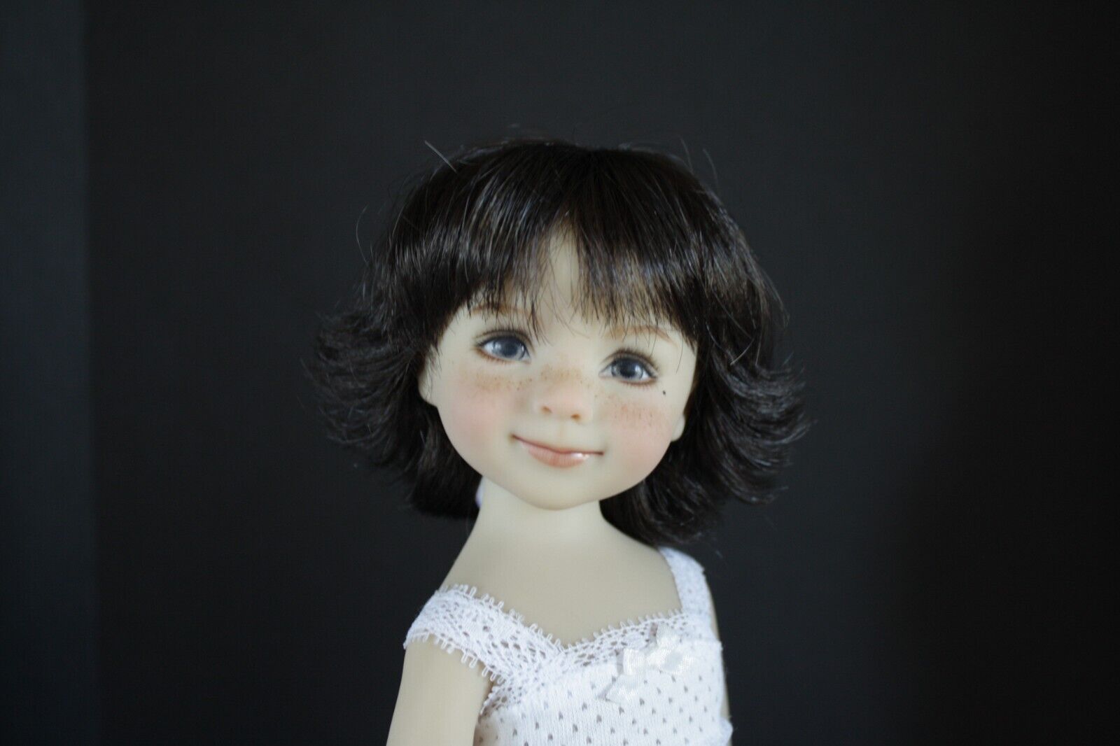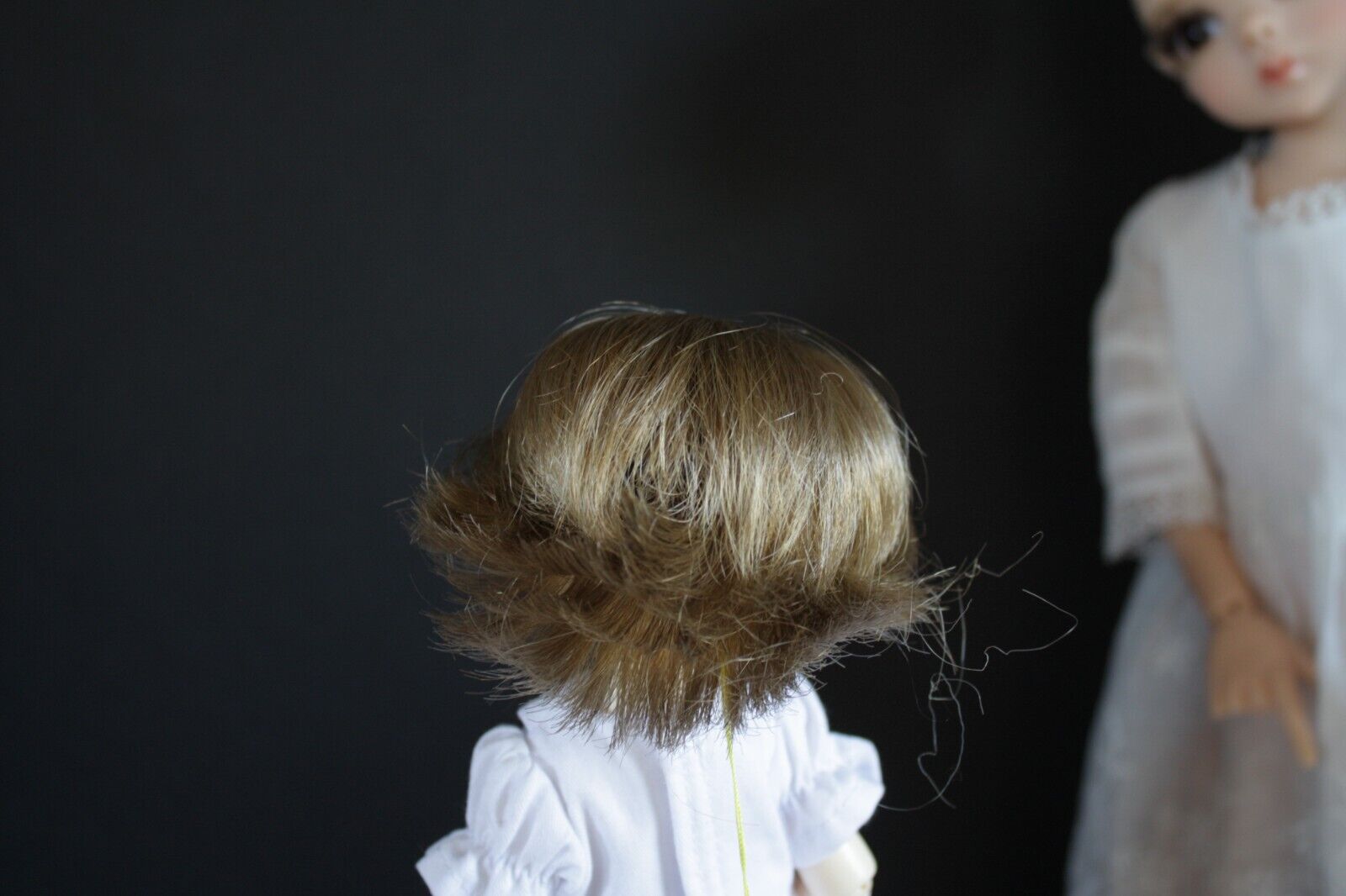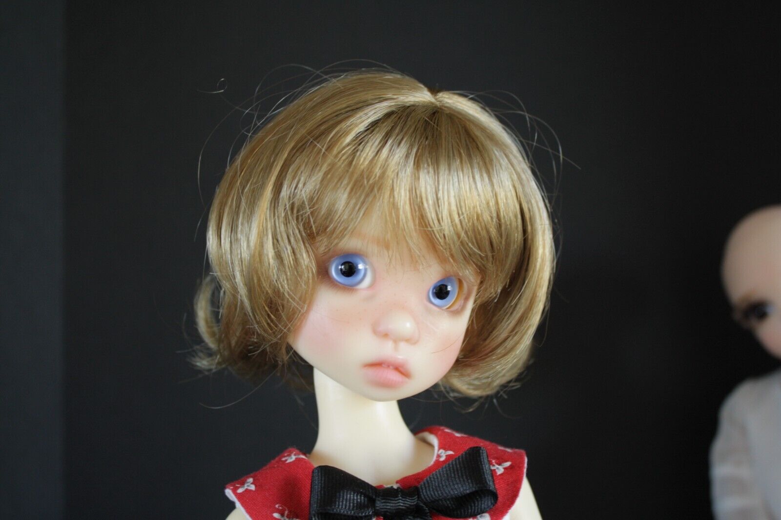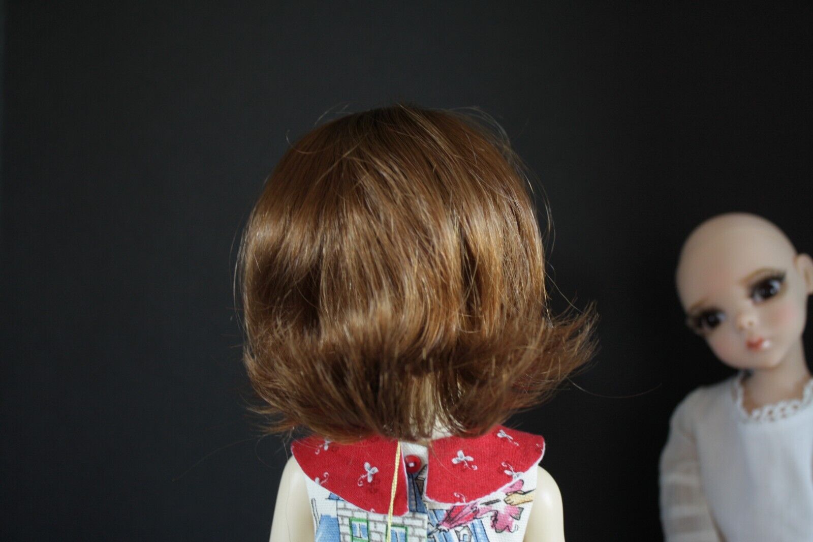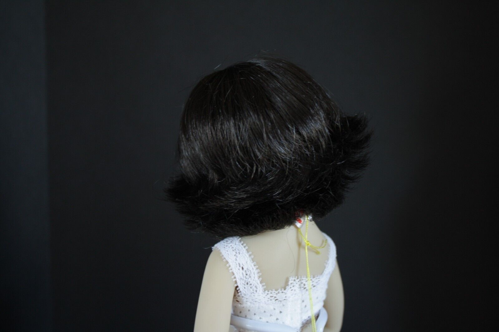 Very cute style. Short with long bangs the ends flip up. This wig has a full stretchy cap.