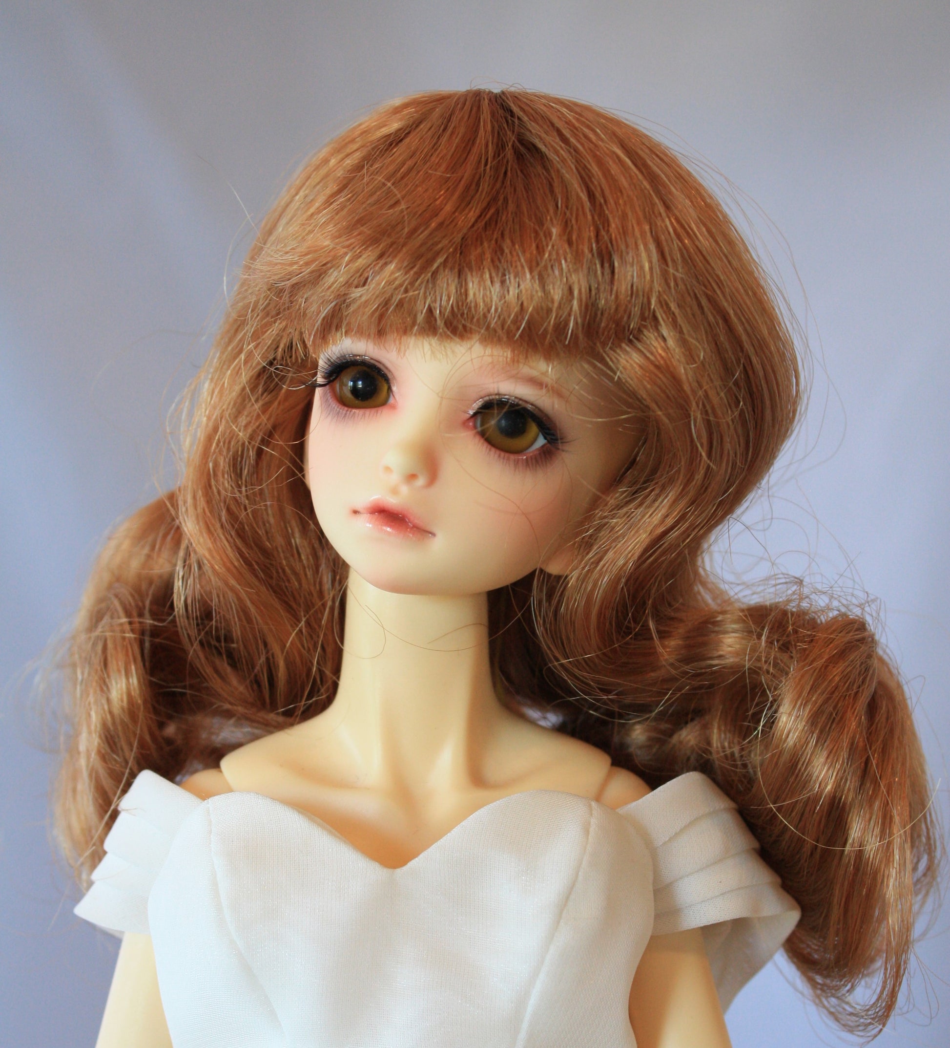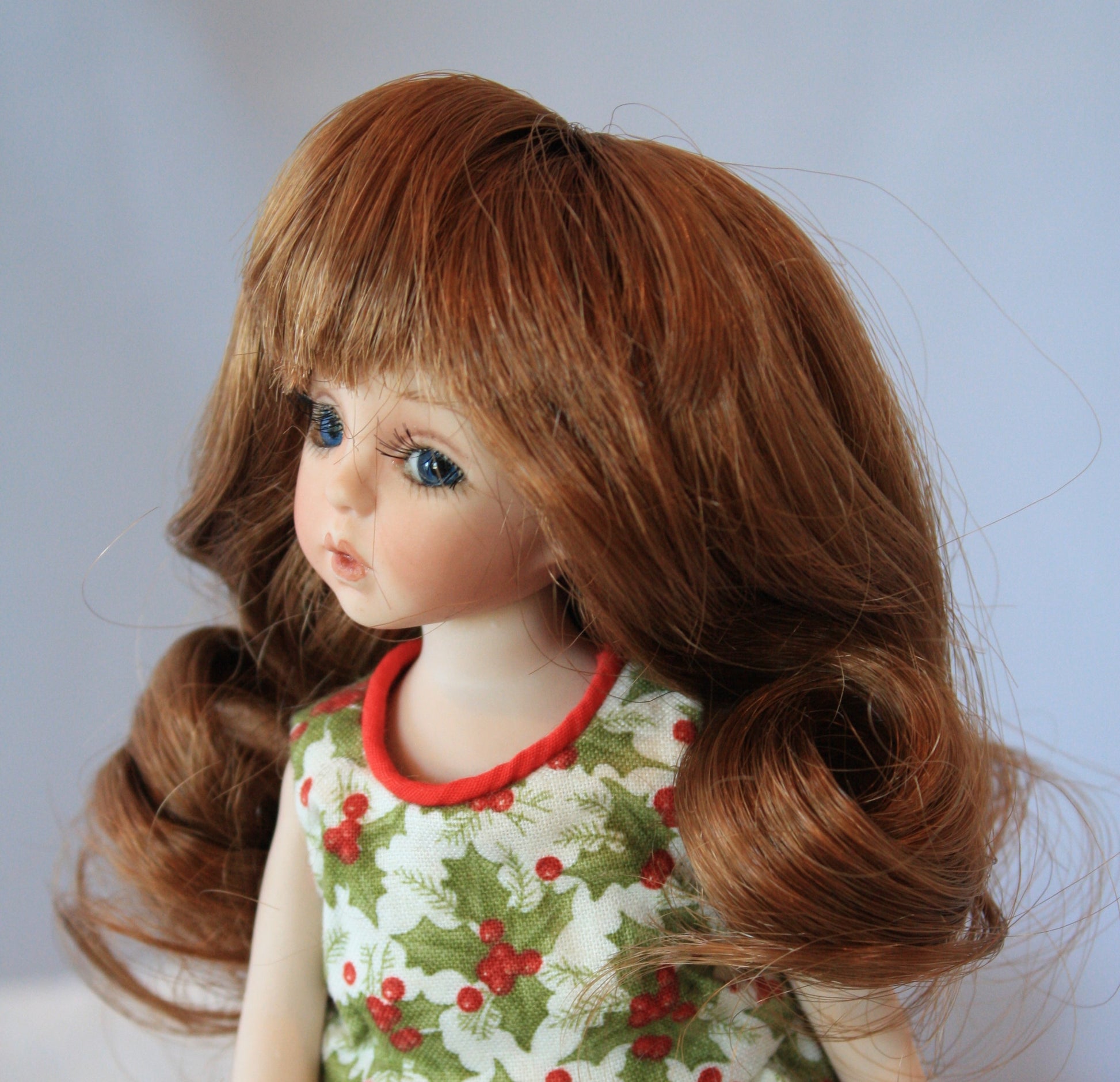 The Denise style synthetic wig has soft wavy hair below the shoulders with bangs caressing the forehead.