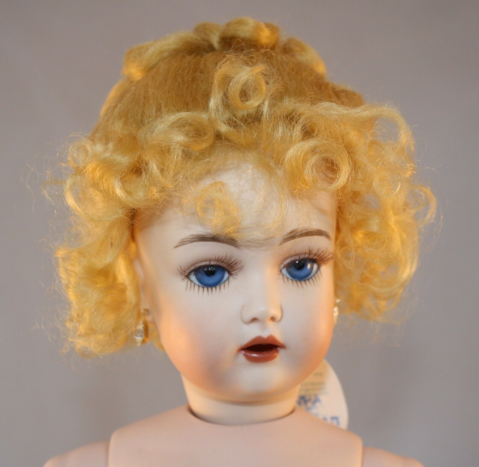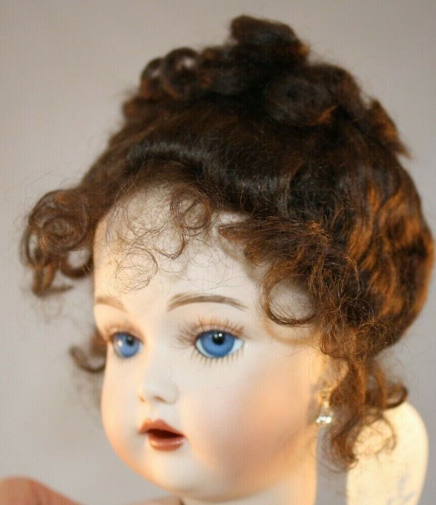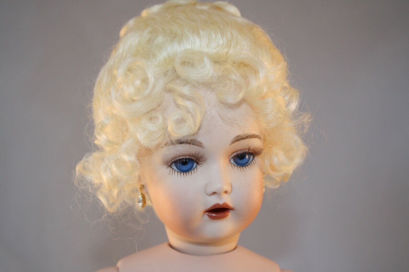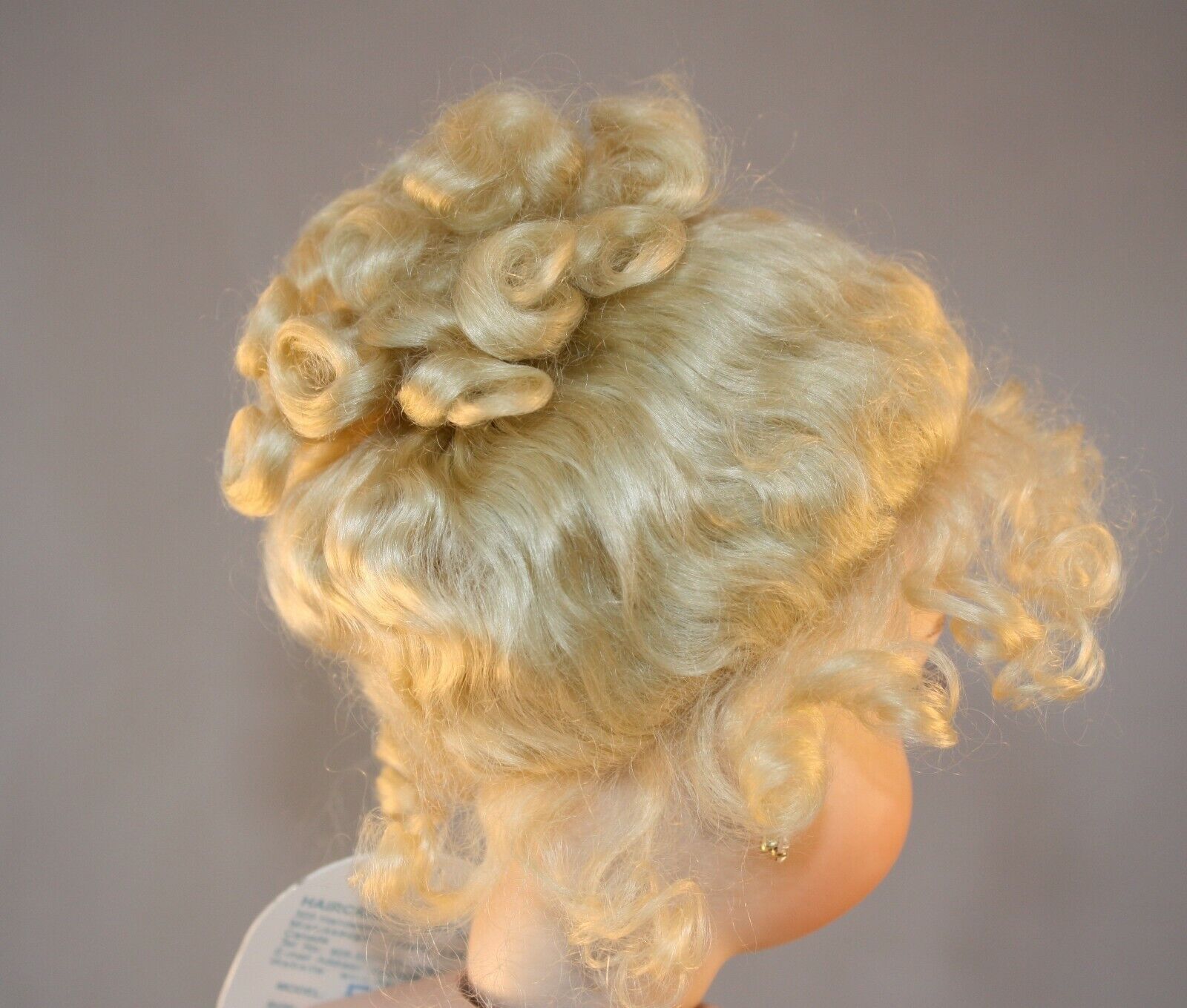 Elvira is an upsweep wig with tiny curls for bangs. It has a top knot full of little curls with