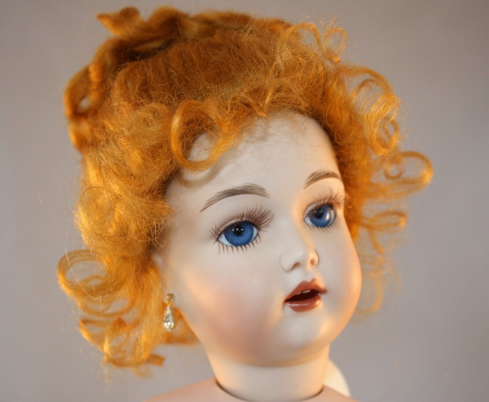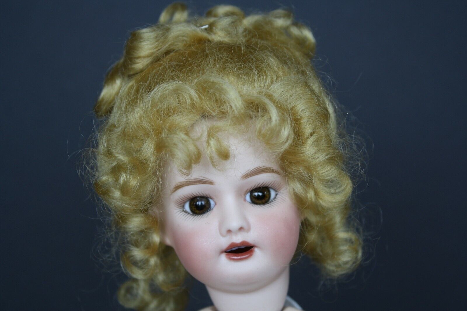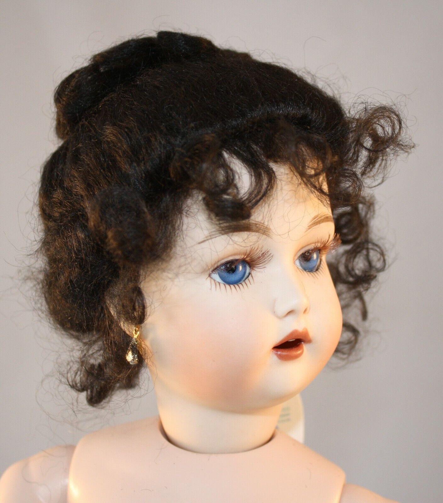 Elvira is an upsweep wig with tiny curls for bangs. It has a top knot full of little curls with