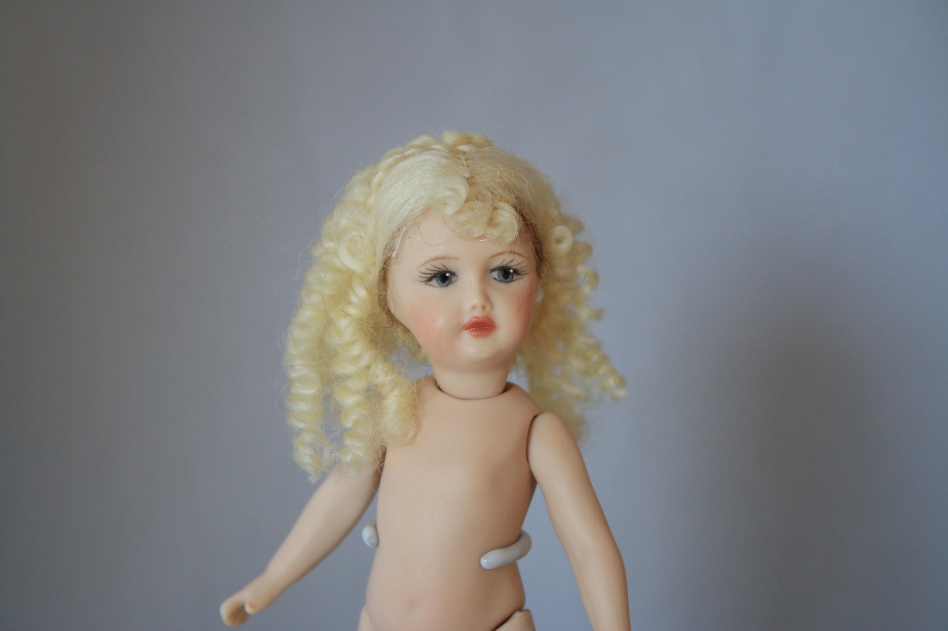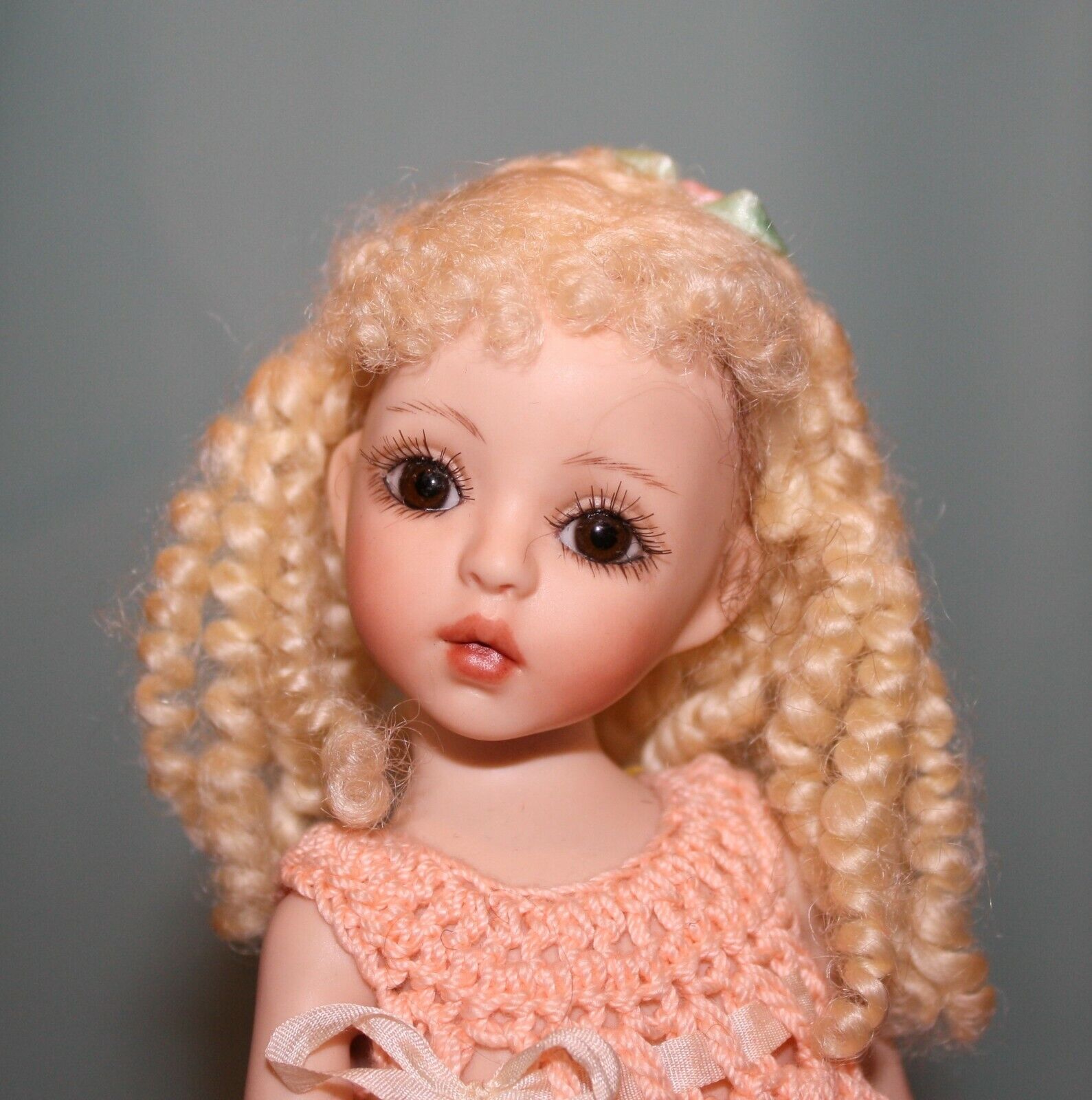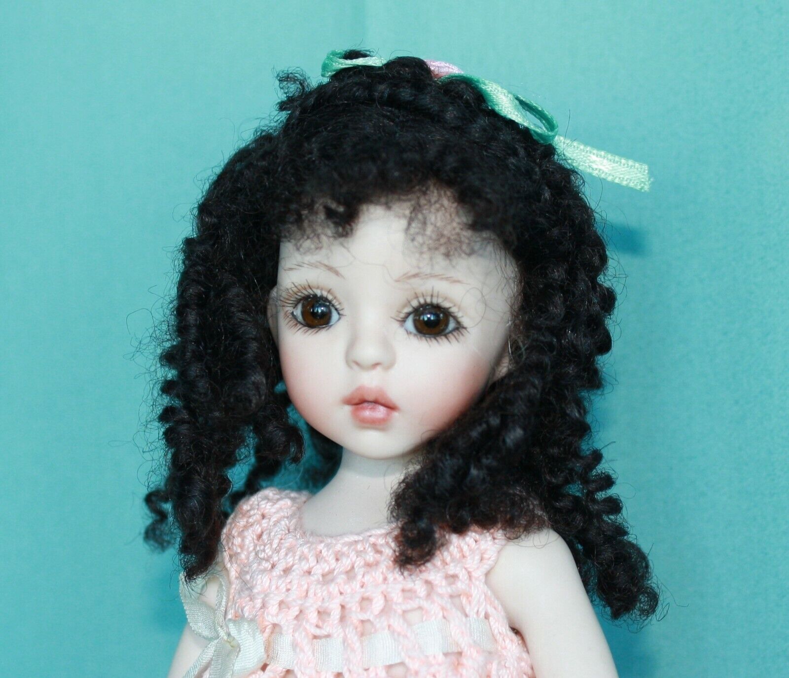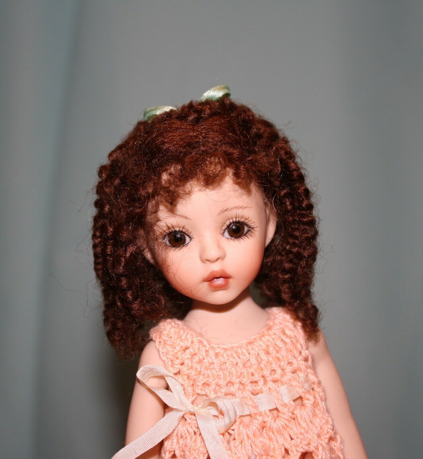 Jeanette style mini mohair wigs come in all the available sizes and colors. She has long tightly curled hair tied with a bow. Her curly bangs adorn her forehead.