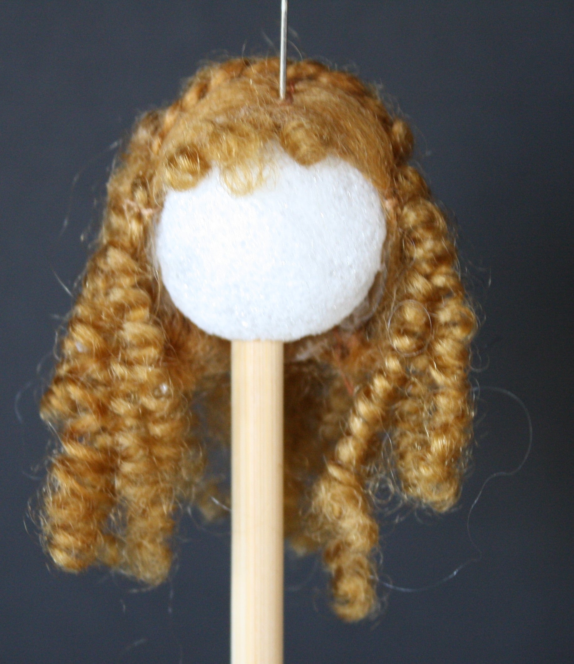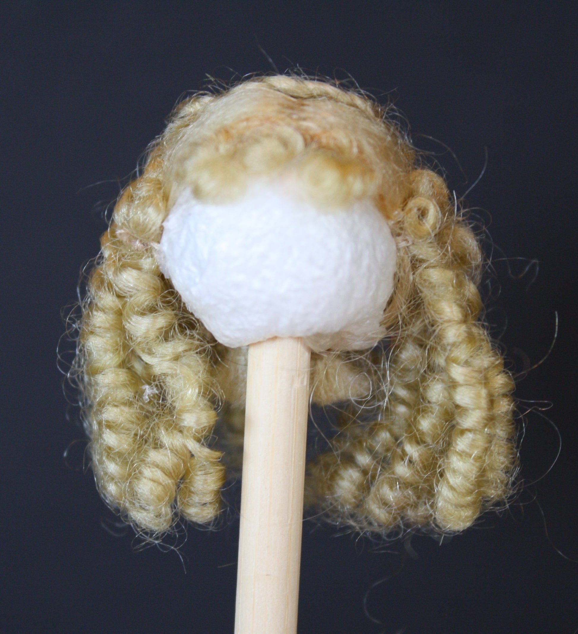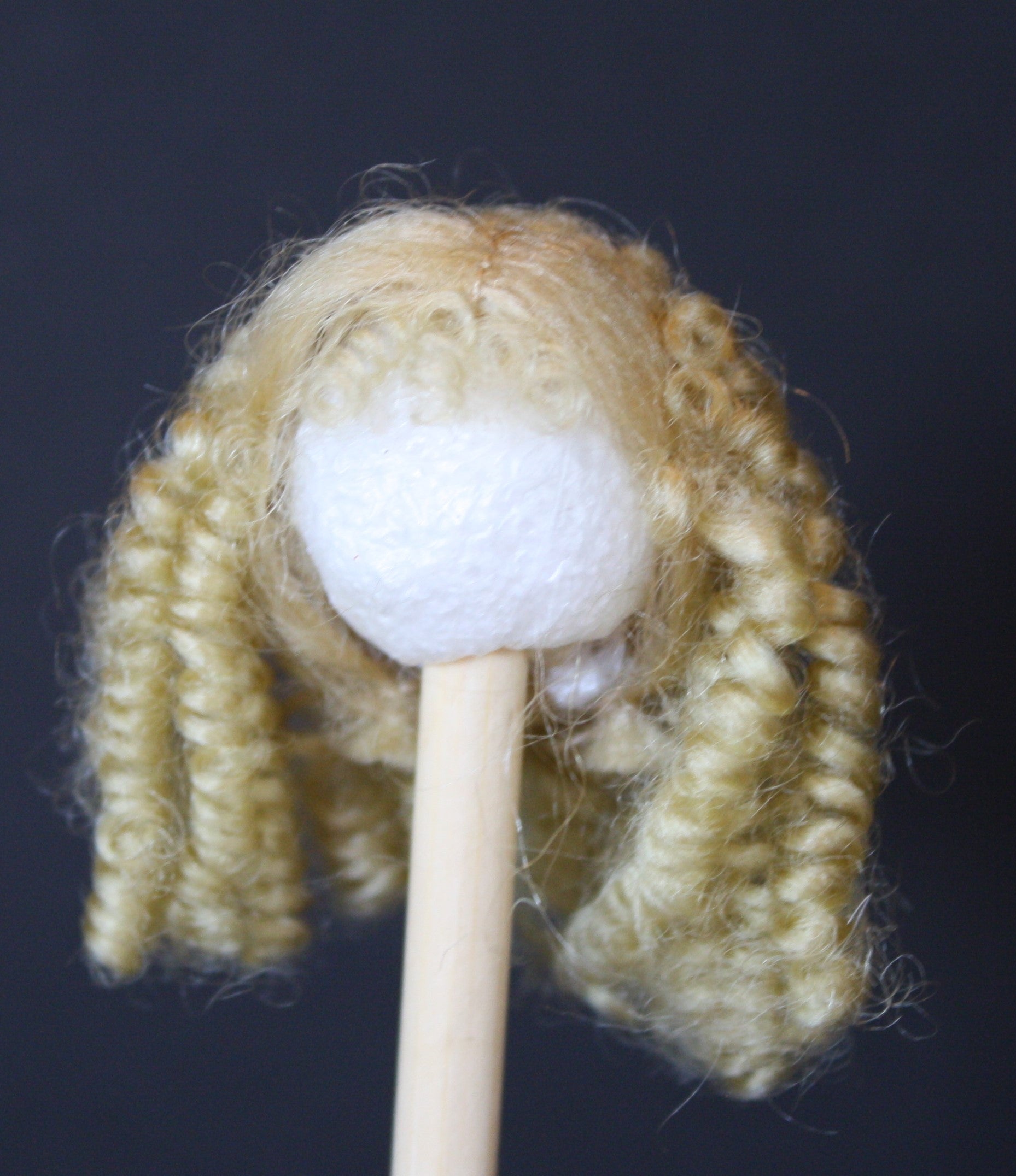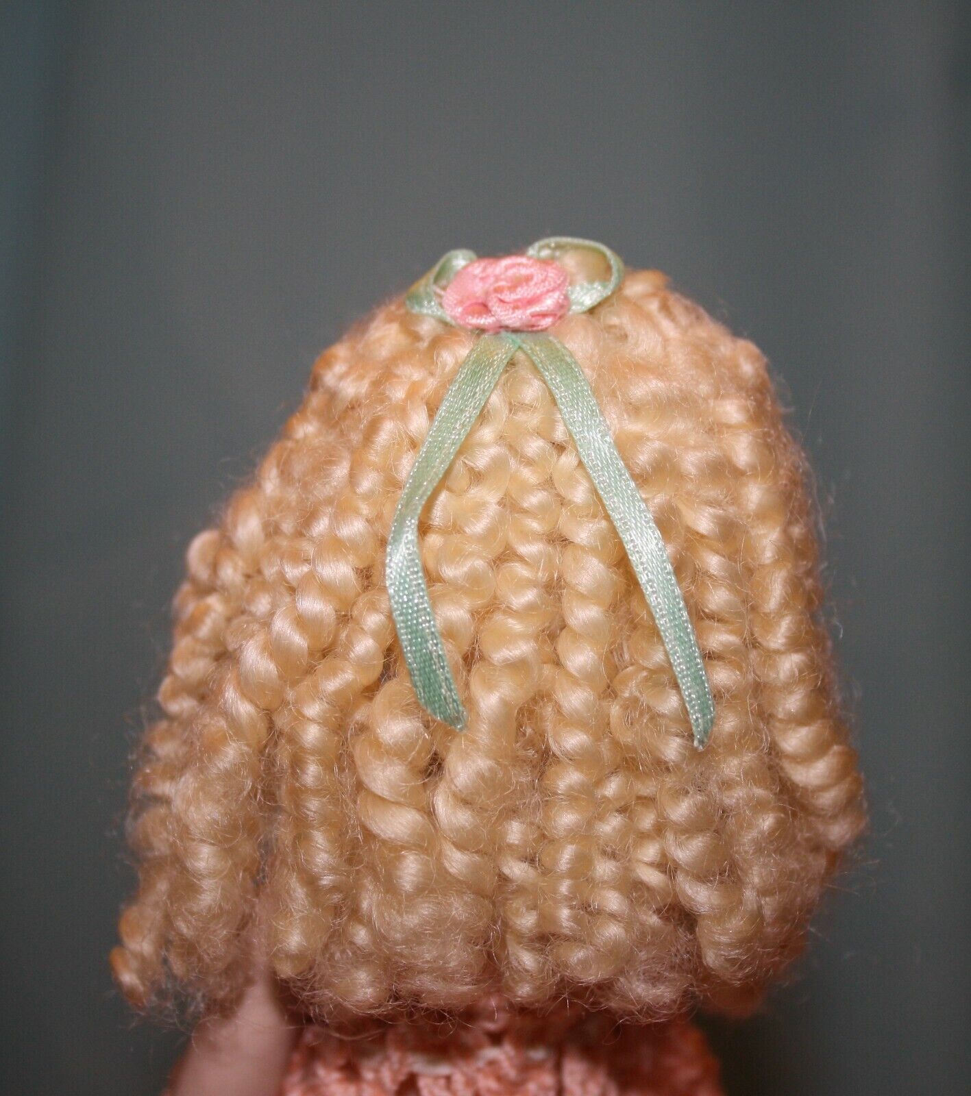 Jeanette style mini mohair wigs come in all the available sizes and colors. She has long tightly curled hair tied with a bow. Her curly bangs adorn her forehead.