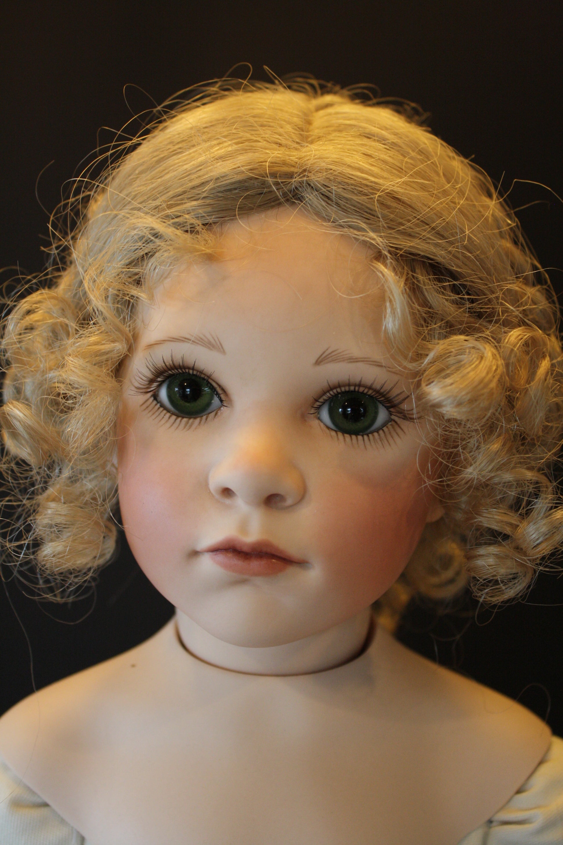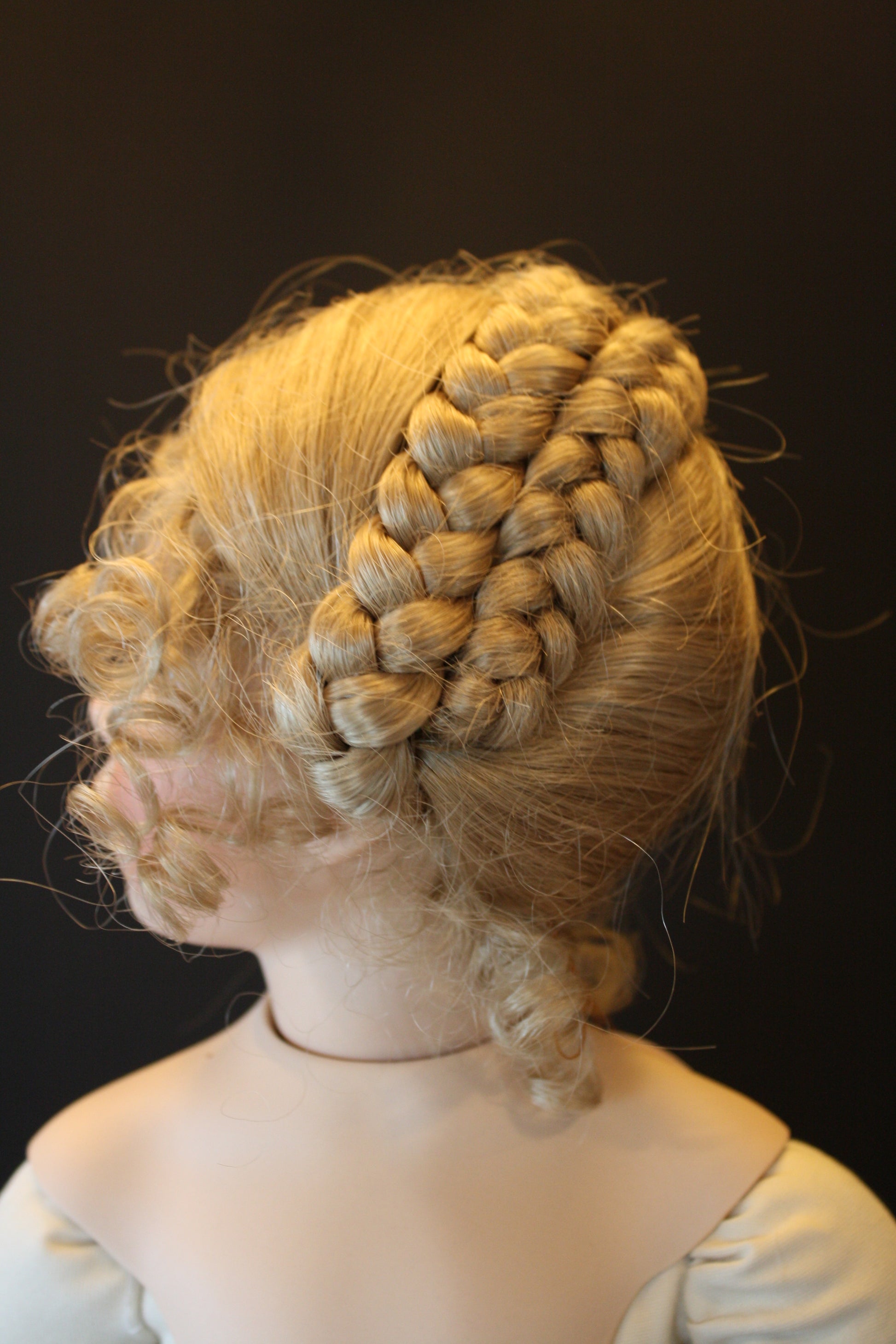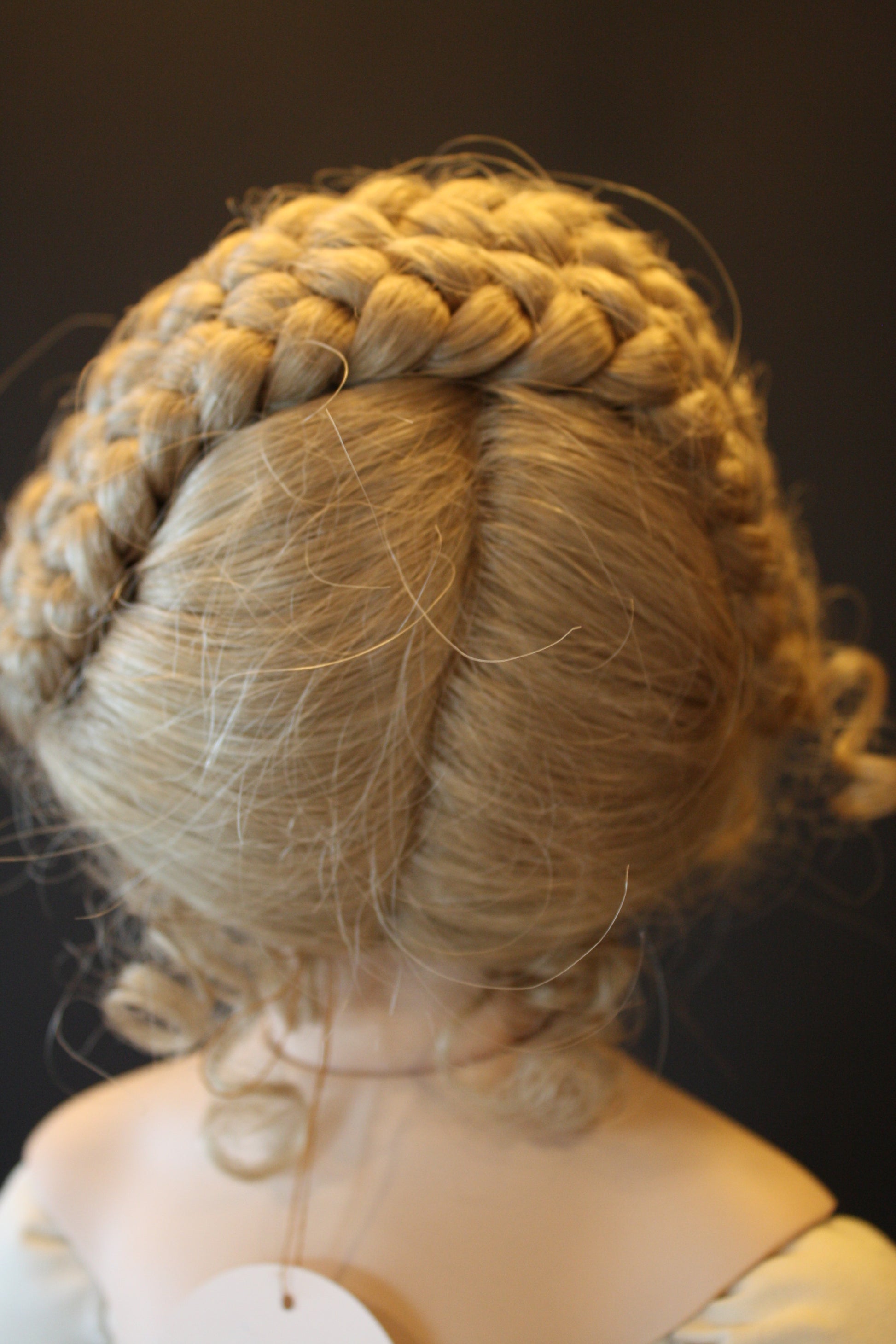 Cute wig has center part with a double braid across the top of the head. Soft curls frame the face and neck.