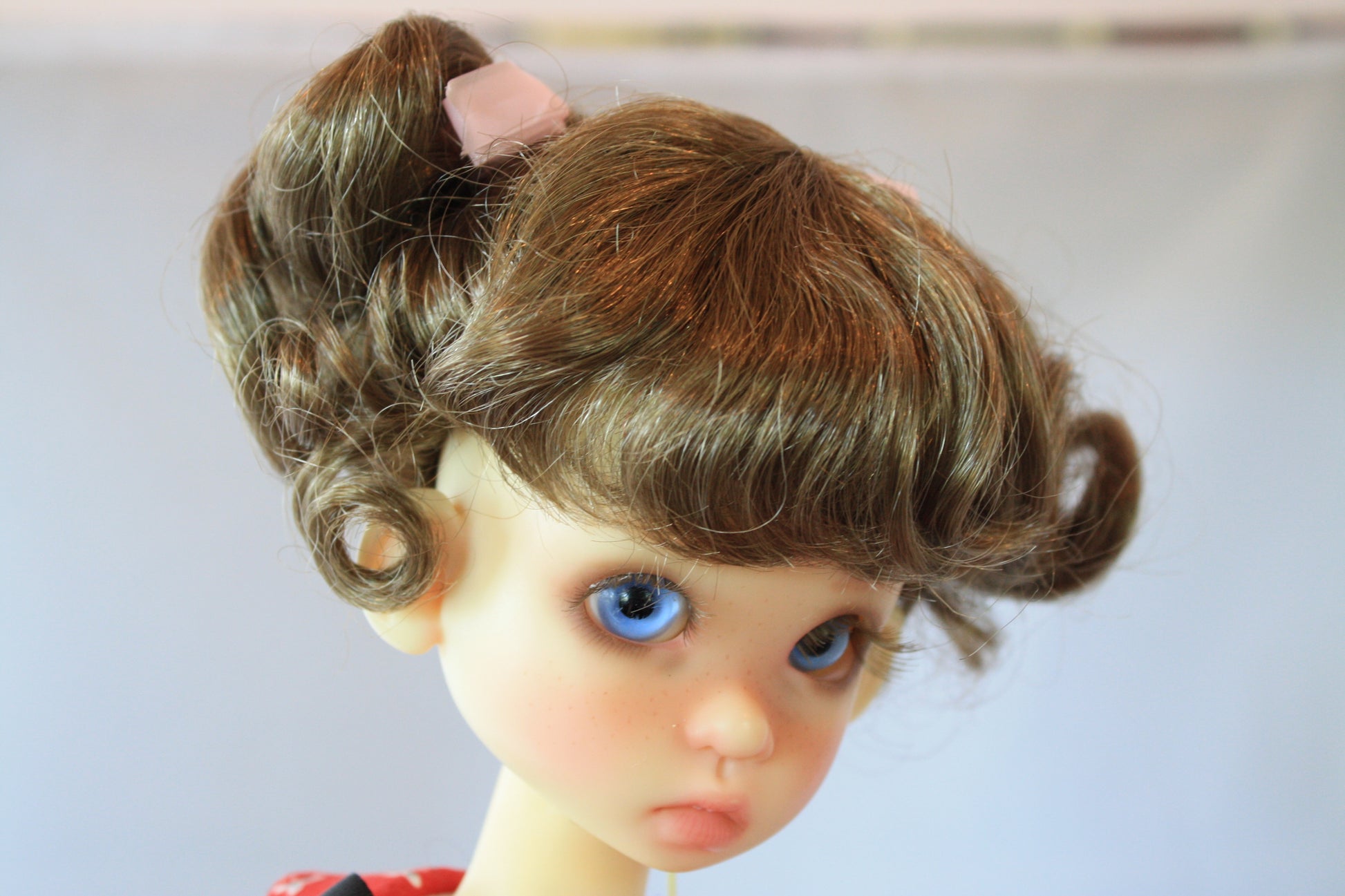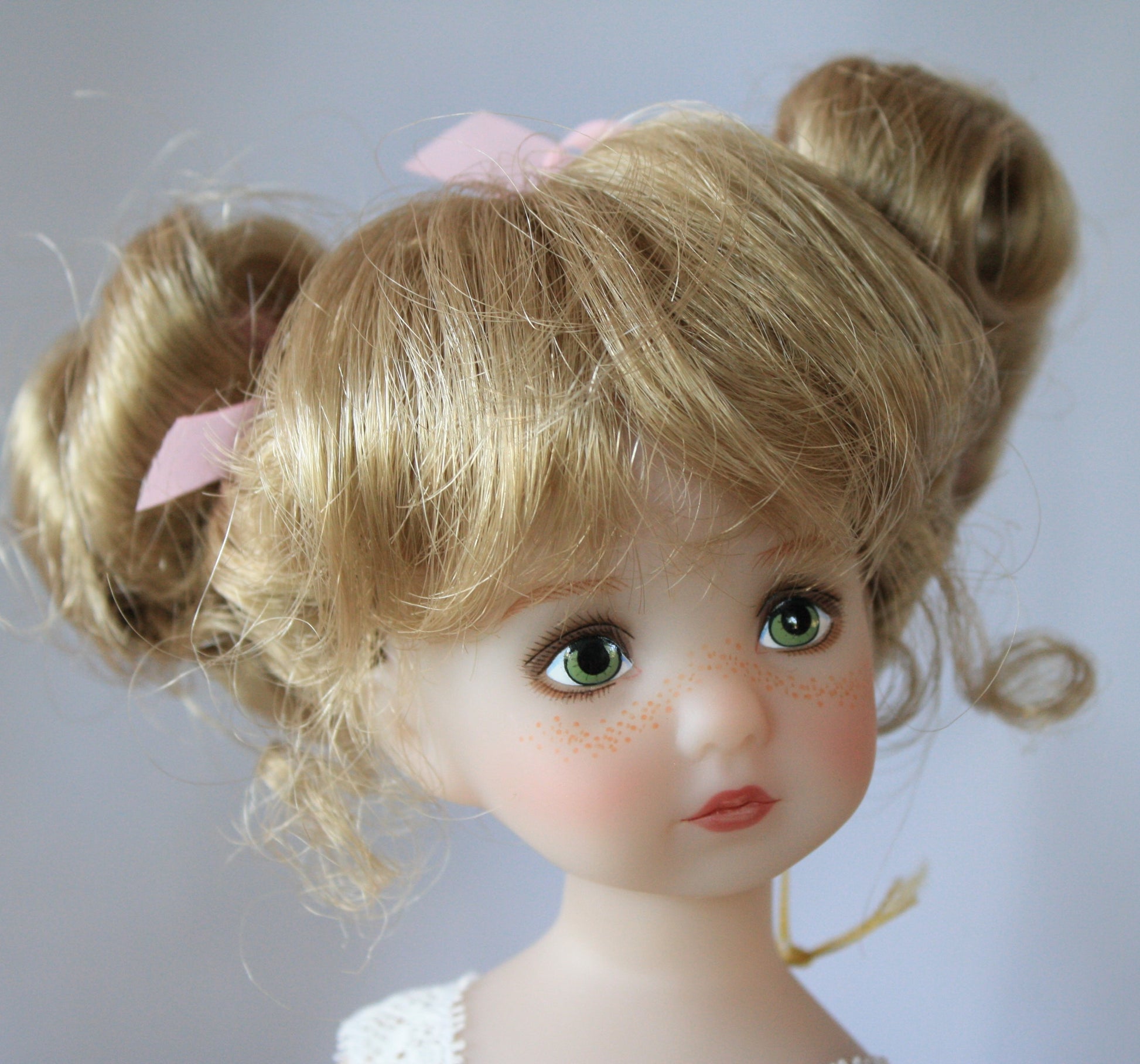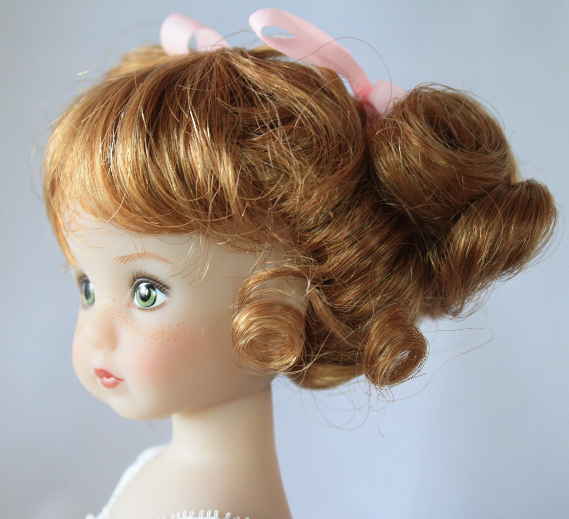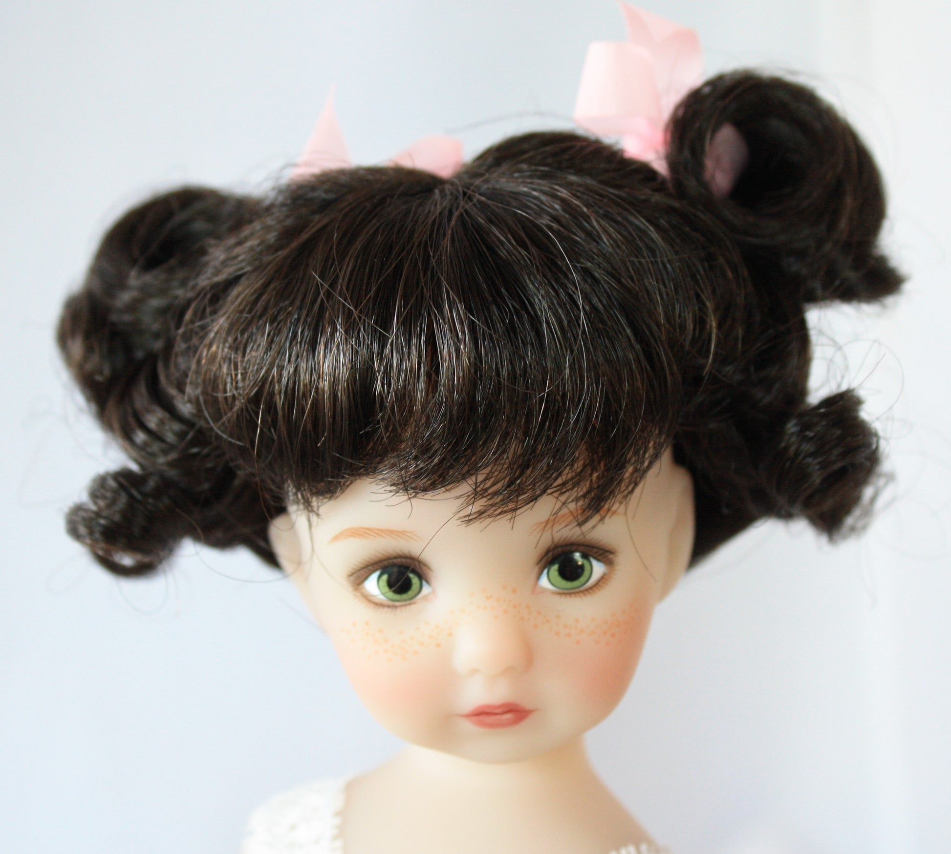 This doll wig has 2 little ponytails tied up in bows. It has tendrils at the sides by the ears and soft wavy bangs.