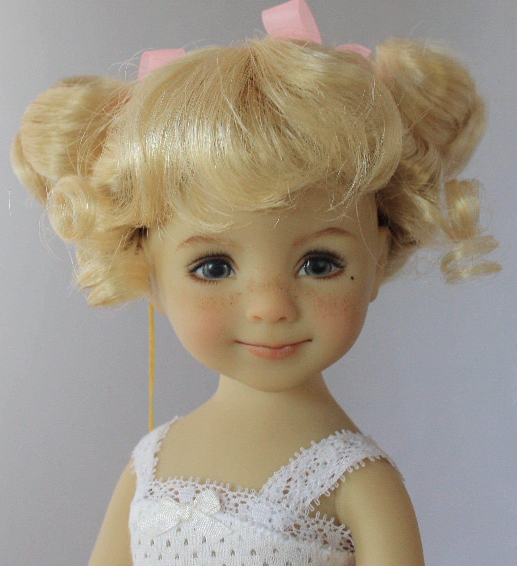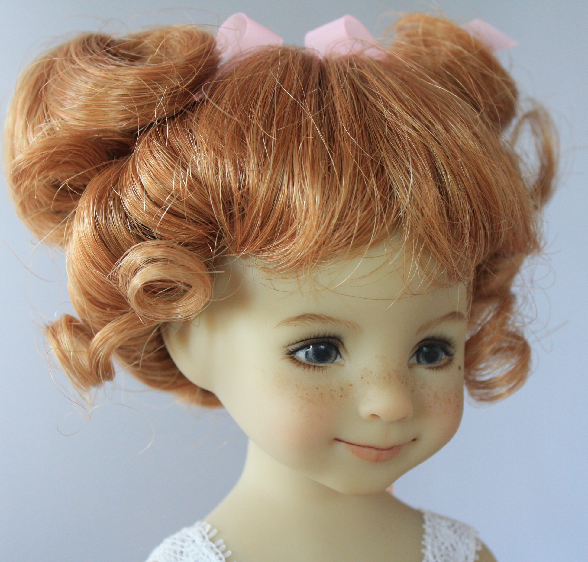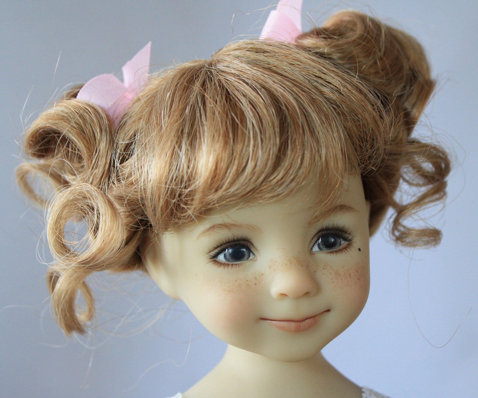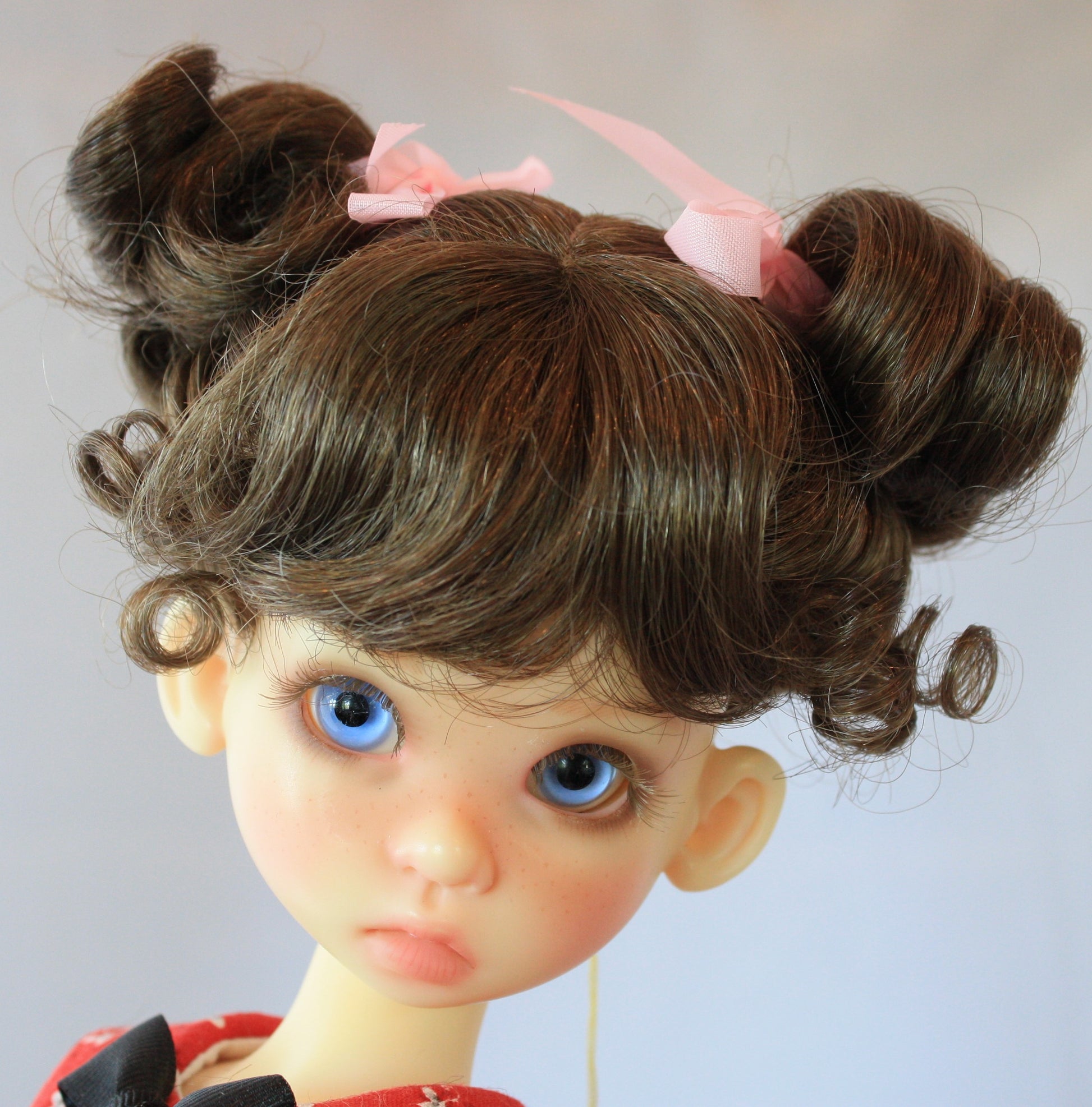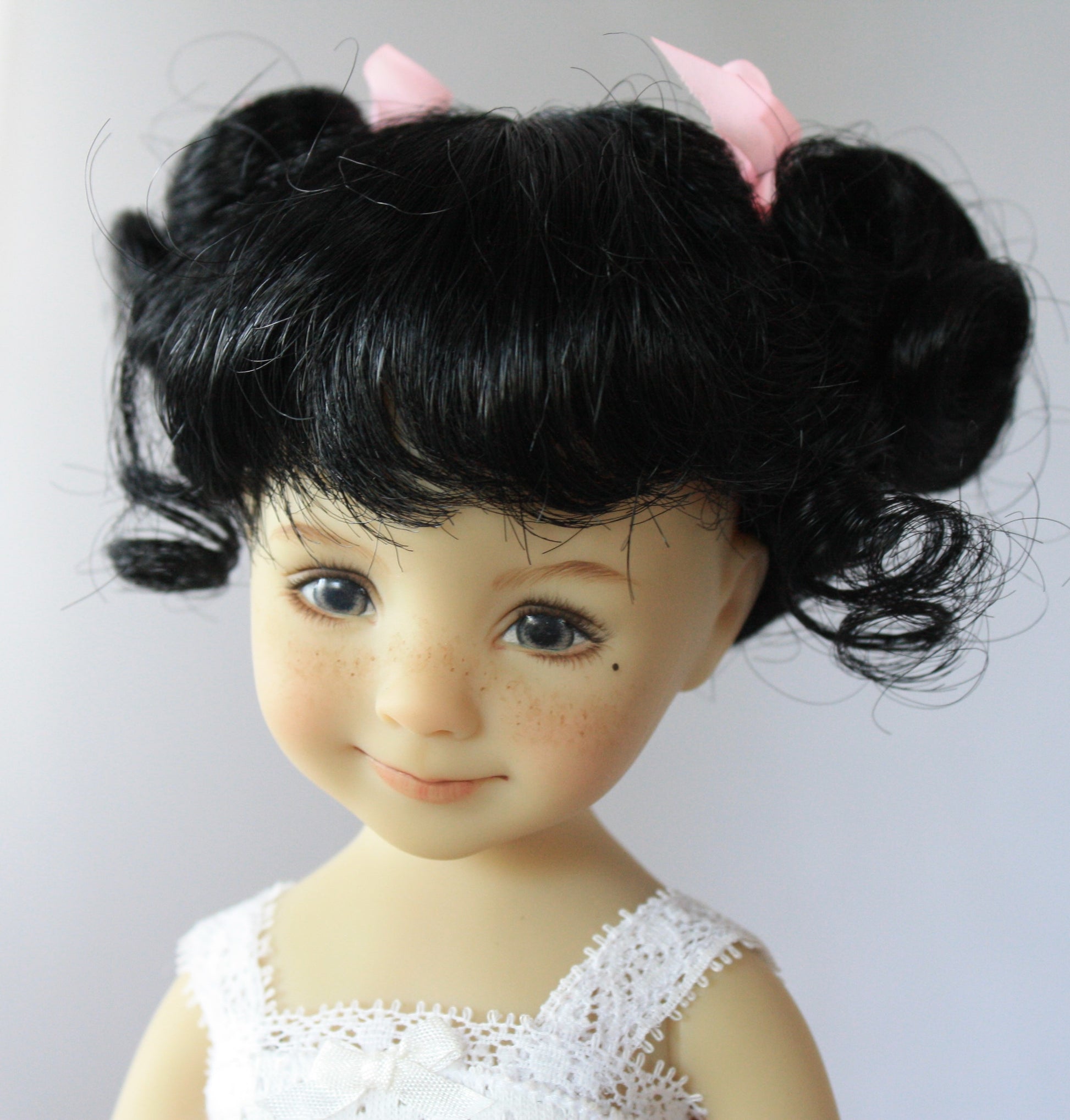 This doll wig has 2 little ponytails tied up in bows. It has tendrils at the sides by the ears and soft wavy bangs.