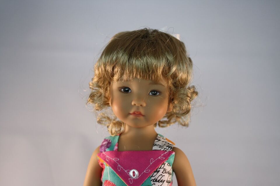 Cutest swept up wig. Has bangs with little tendrils at sides and back. Lots of curls pulled up in a white ribbon.