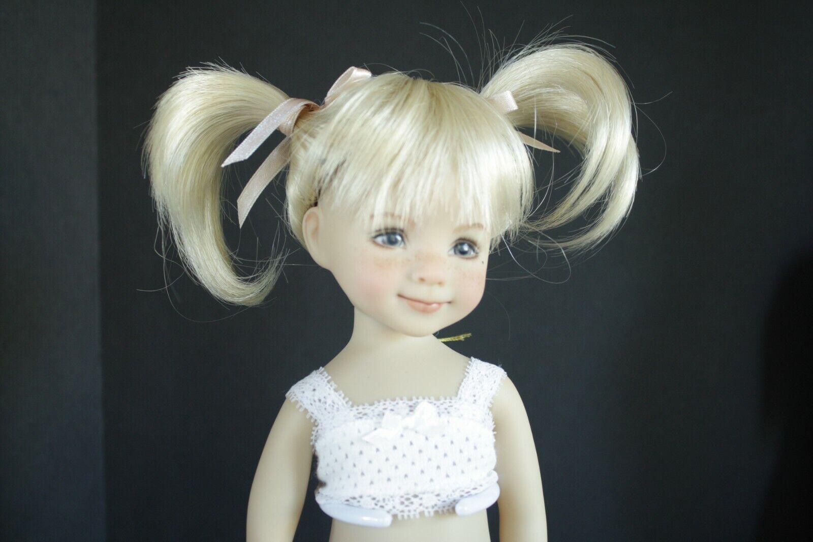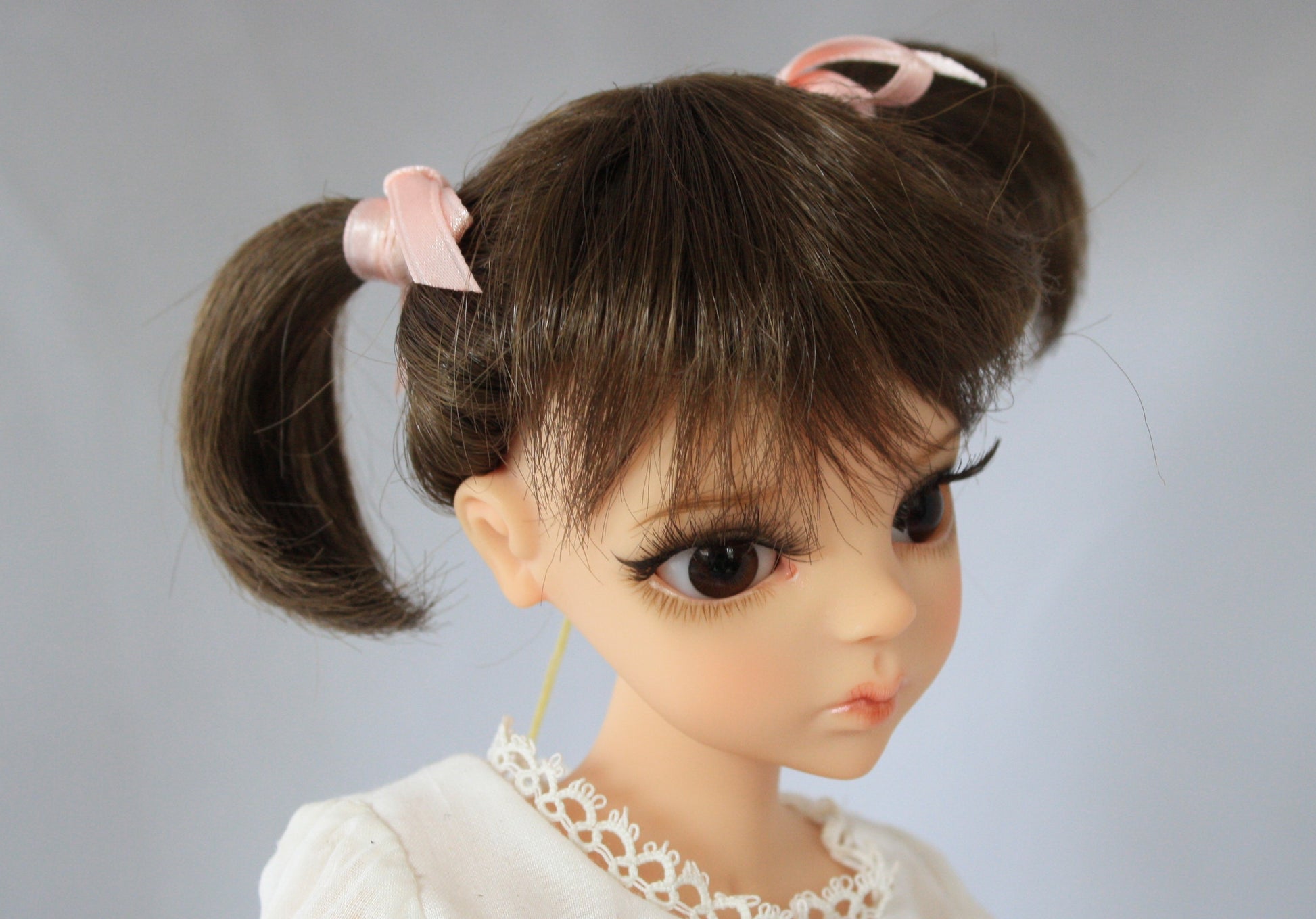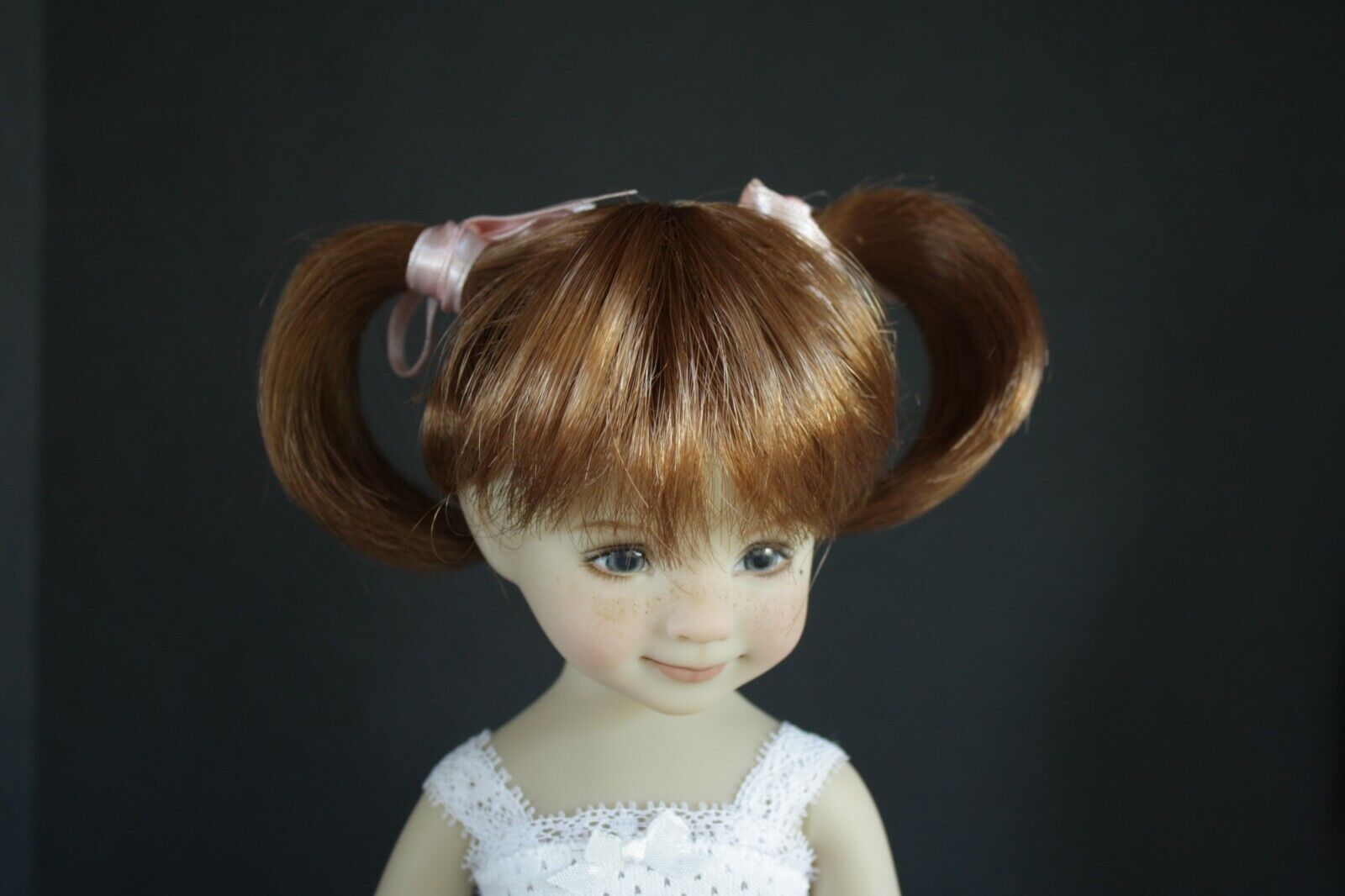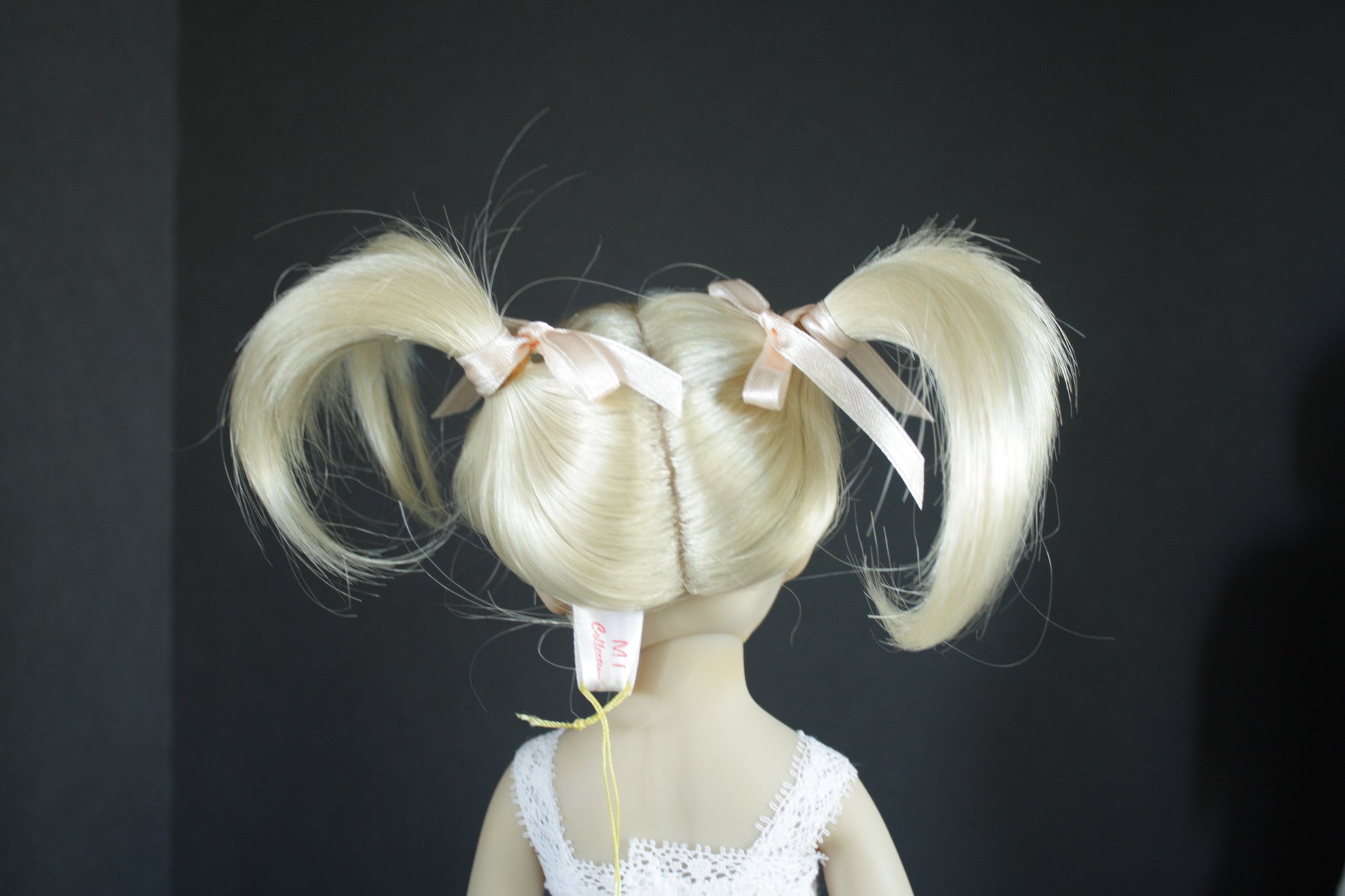 Cute little wig. Has two ponytails tied with pink bows. Has nice, feathered bangs. This wig is best worn with a silicone wig cap or Velcro dots.