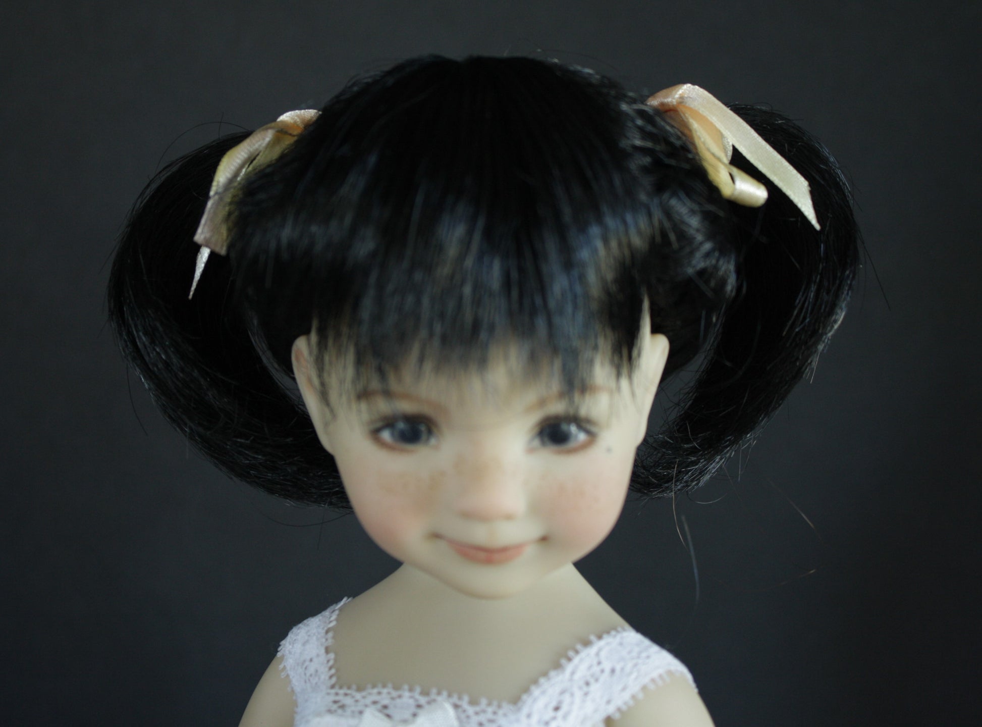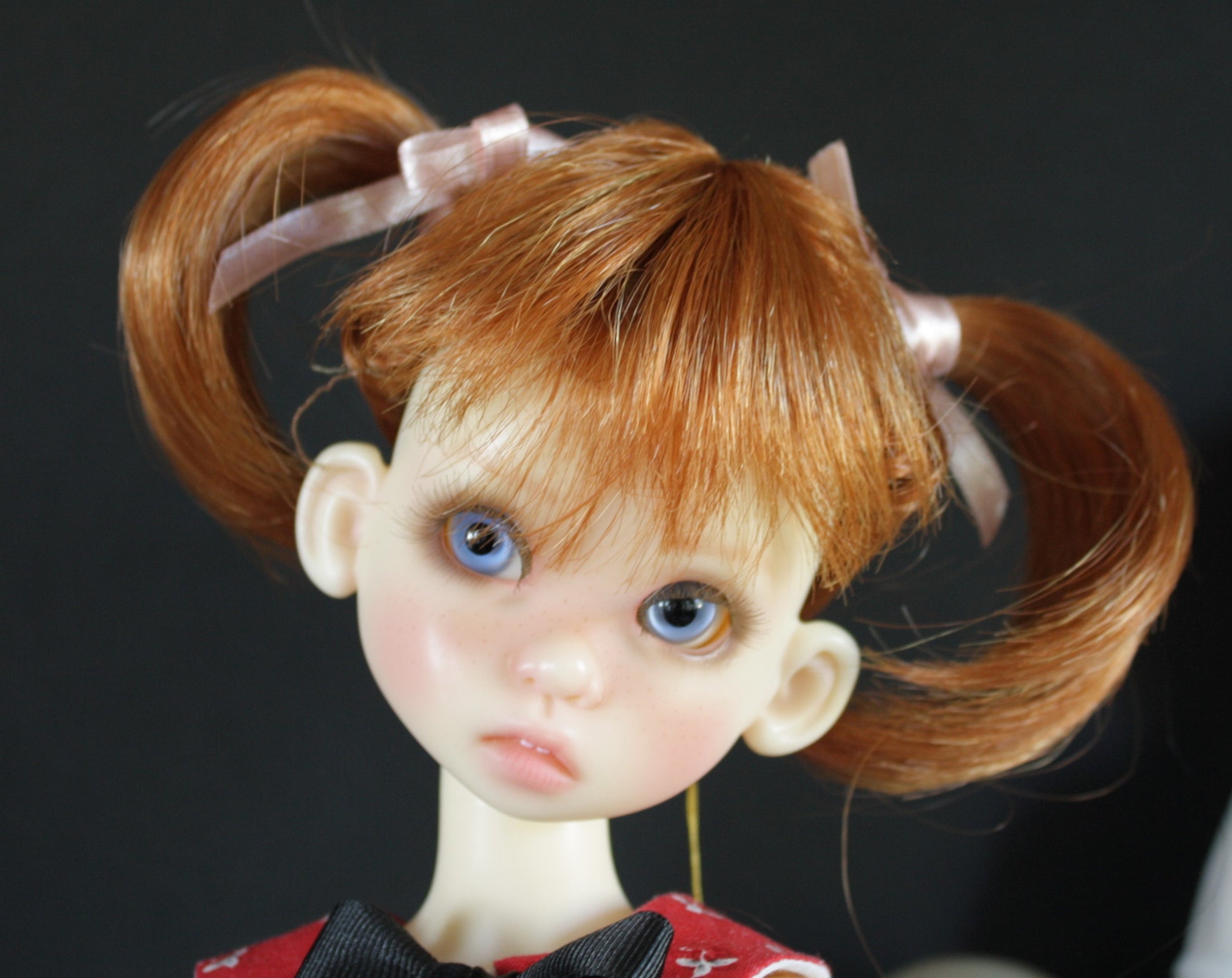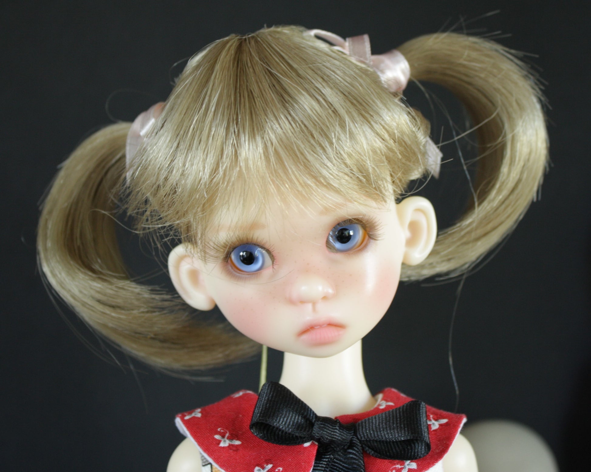 Cute little wig. Has two ponytails tied with pink bows. Has nice, feathered bangs. This wig is best worn with a silicone wig cap or Velcro dots.