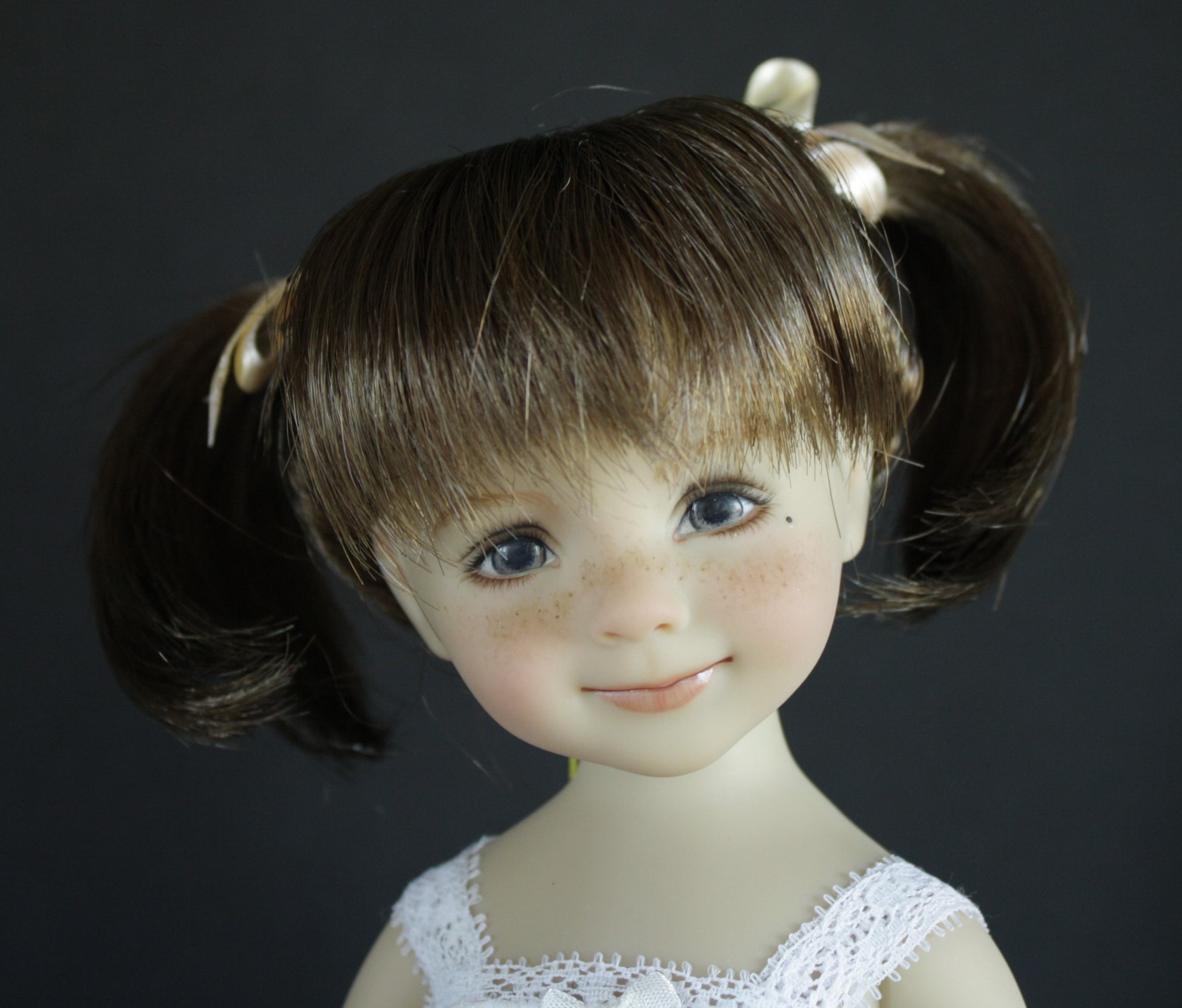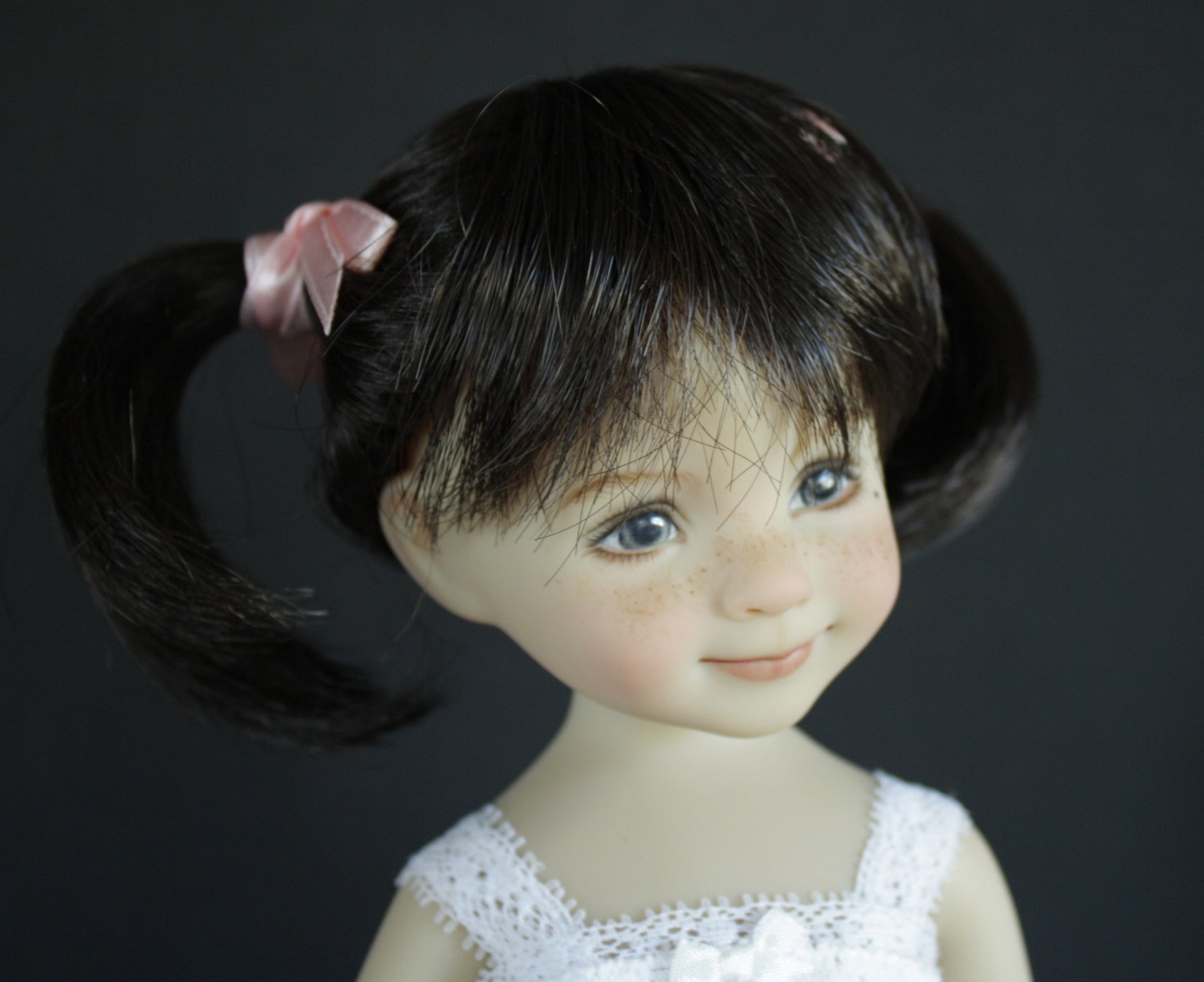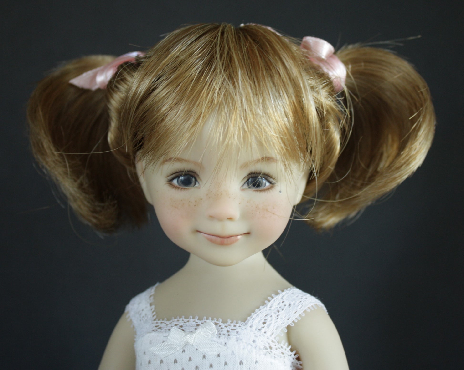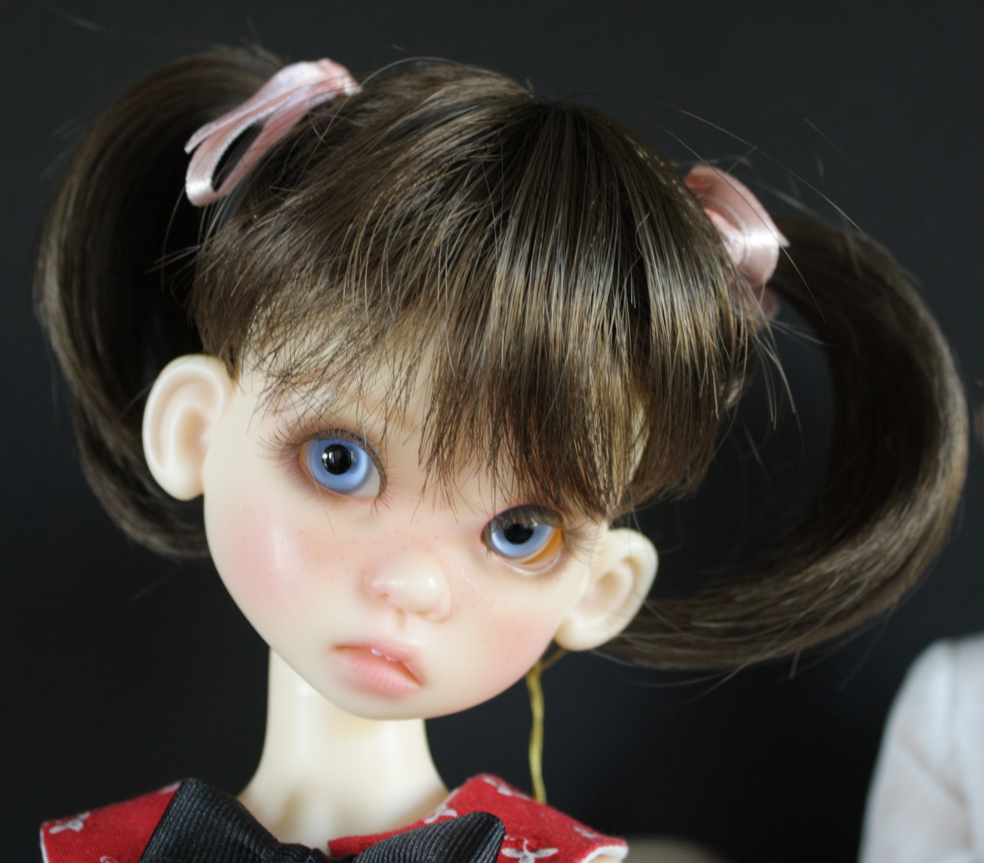 Cute little wig. Has two ponytails tied with pink bows. Has nice, feathered bangs. This wig is best worn with a silicone wig cap or Velcro dots.