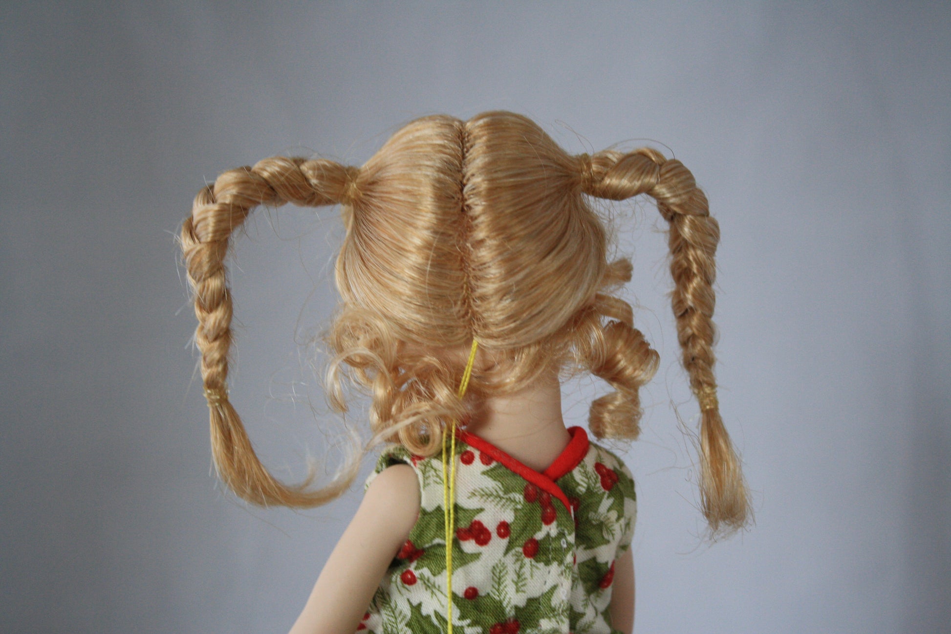 This cute little synthetic mohair wig is parted in the center with 2 adorable ponytails on either side of the head. This Polly style wig has wispy little bangs adorning the forehead of your favorite doll. This would really look great on a little girl doll.