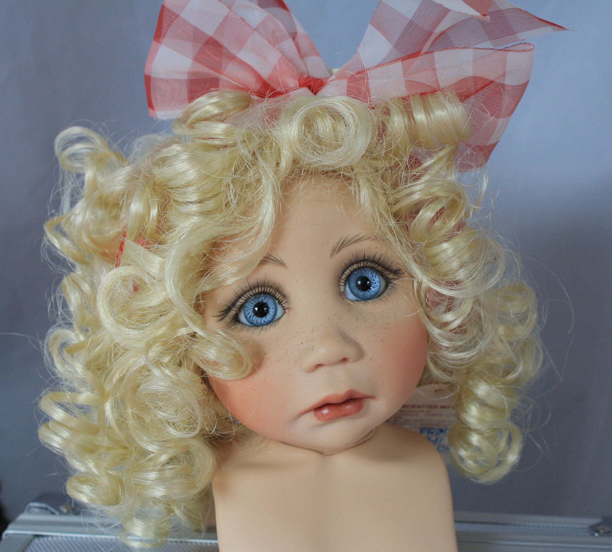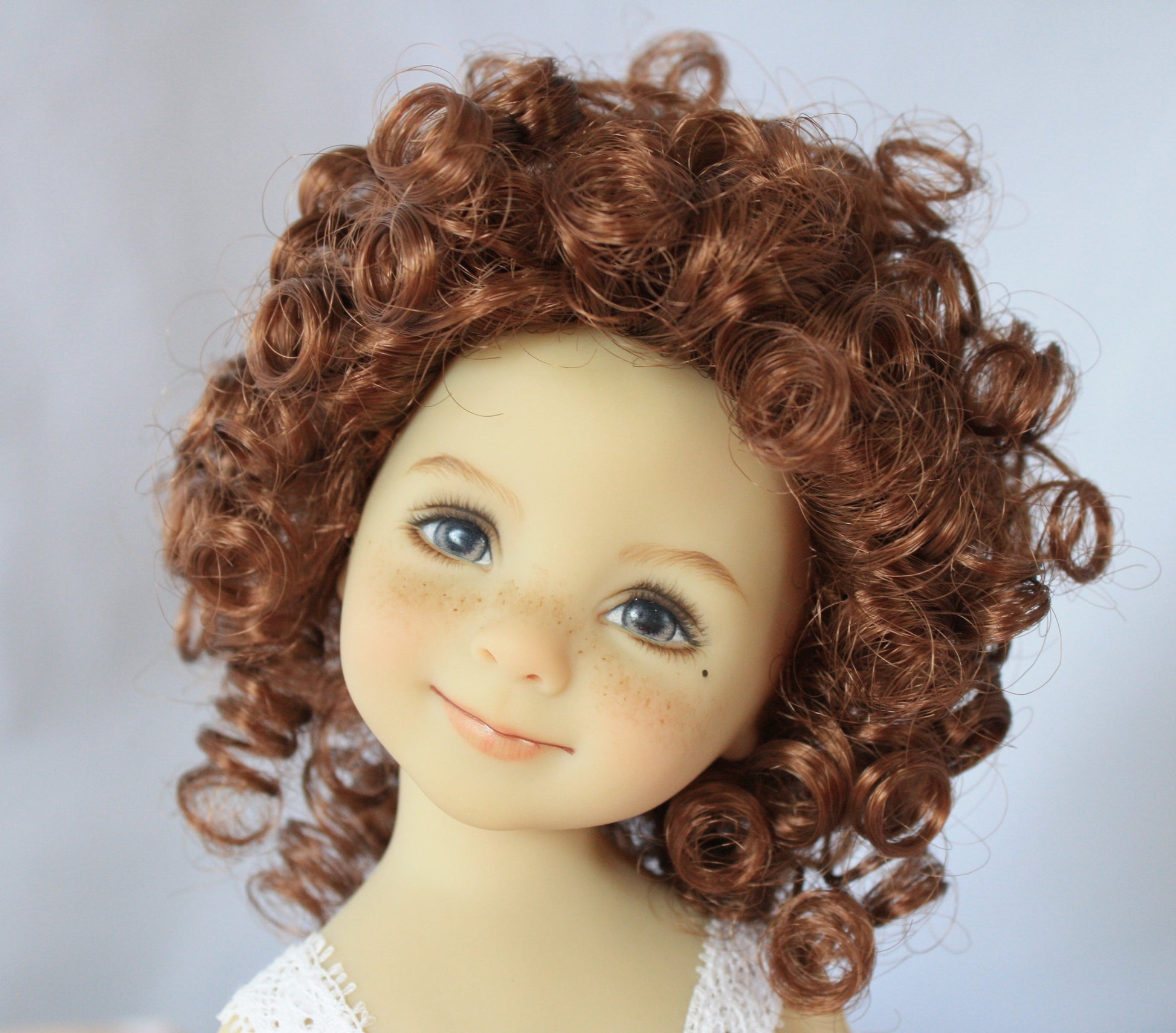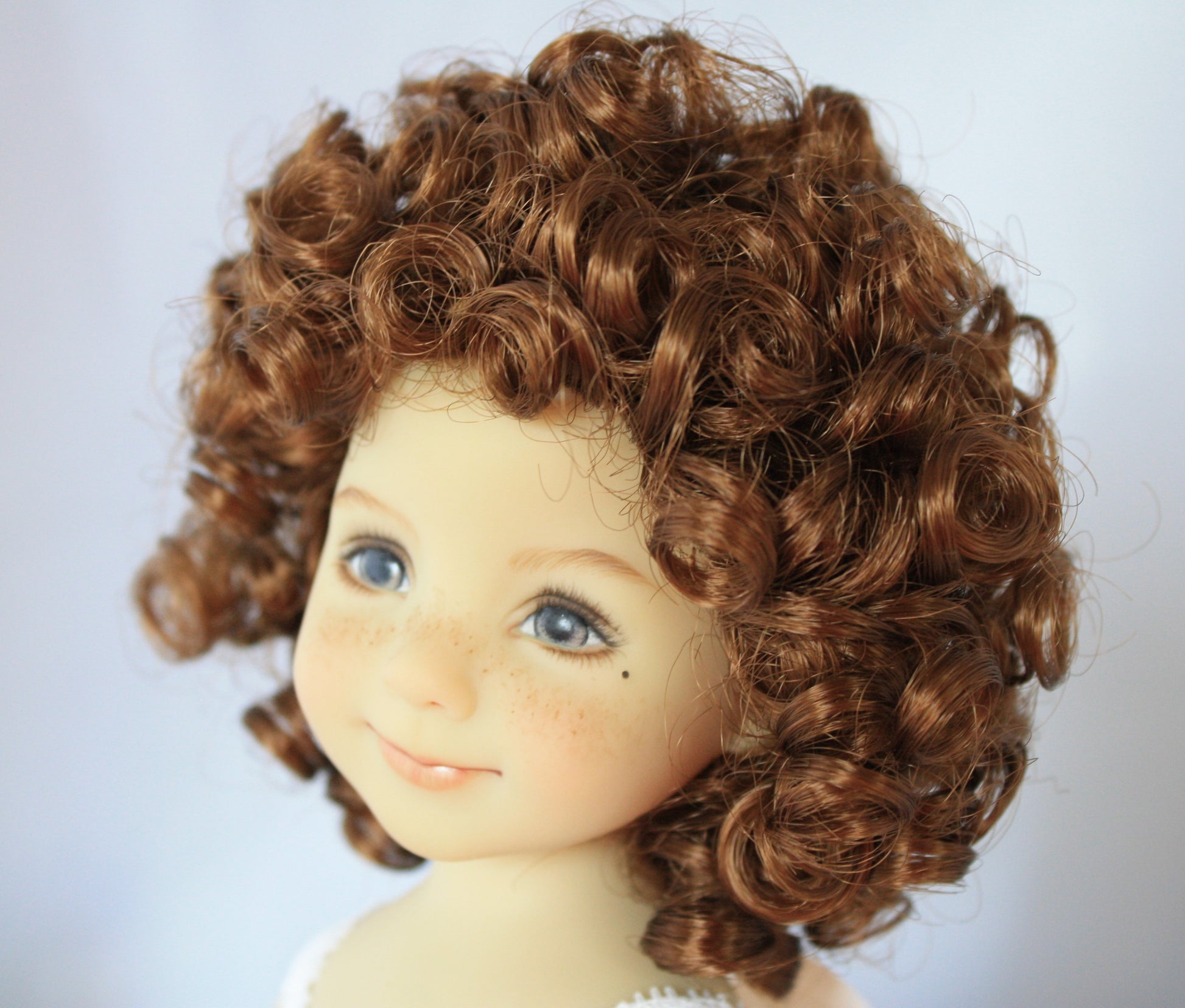 Primy has curls all over the head. I have shown here a few ways to style the wig. Tied back with a headband and bow. Also pulled up for a completely different look. Bows not included. Full stretch wig cap.