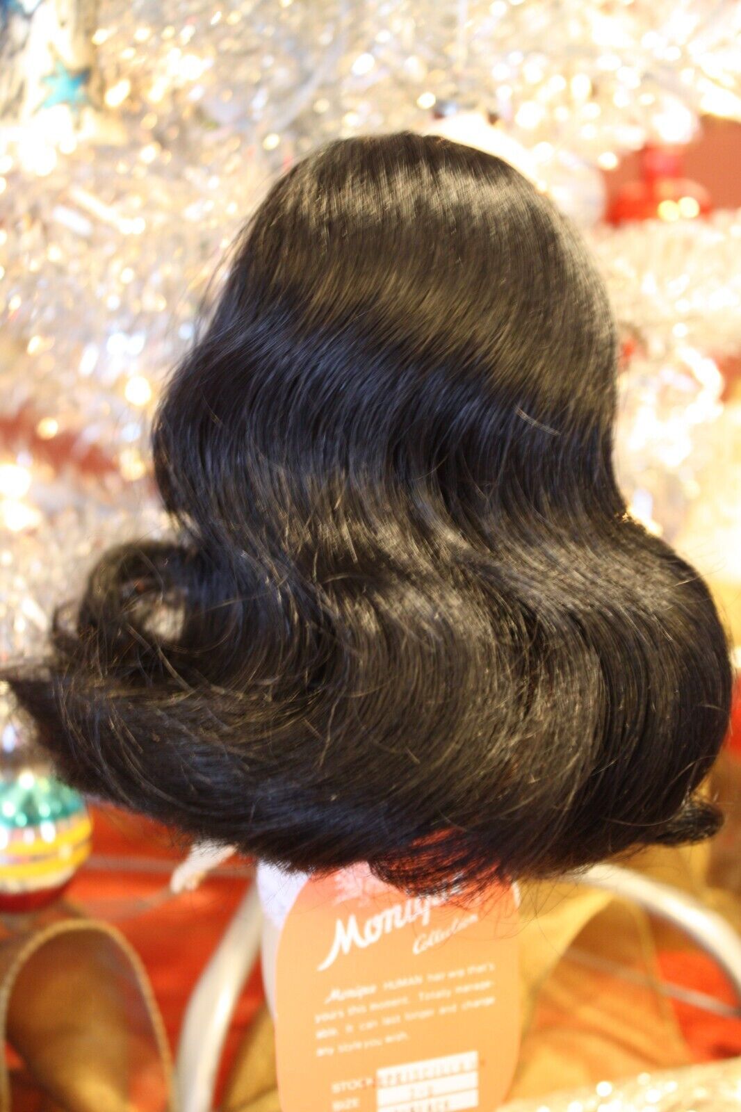 Really nice human hair wig. It has a part down the center and is long as the pictures show. Nice soft human hair.