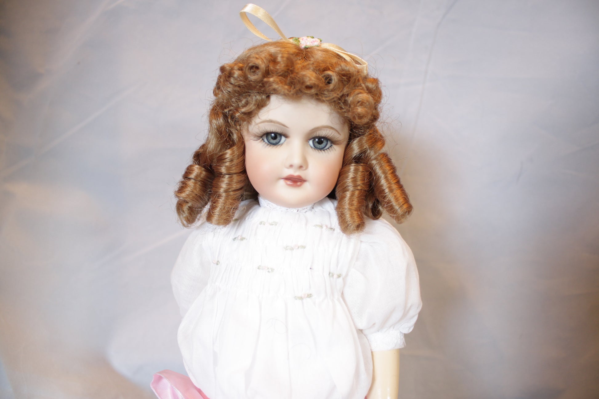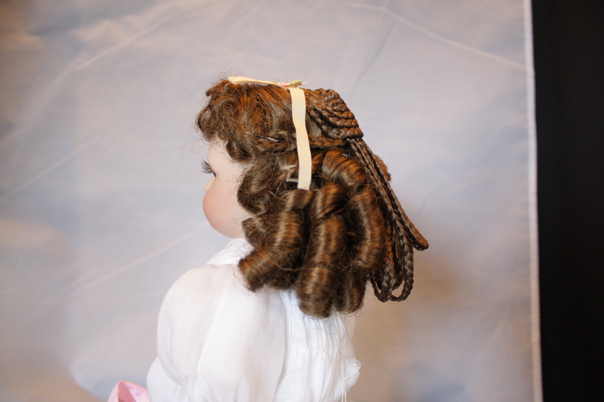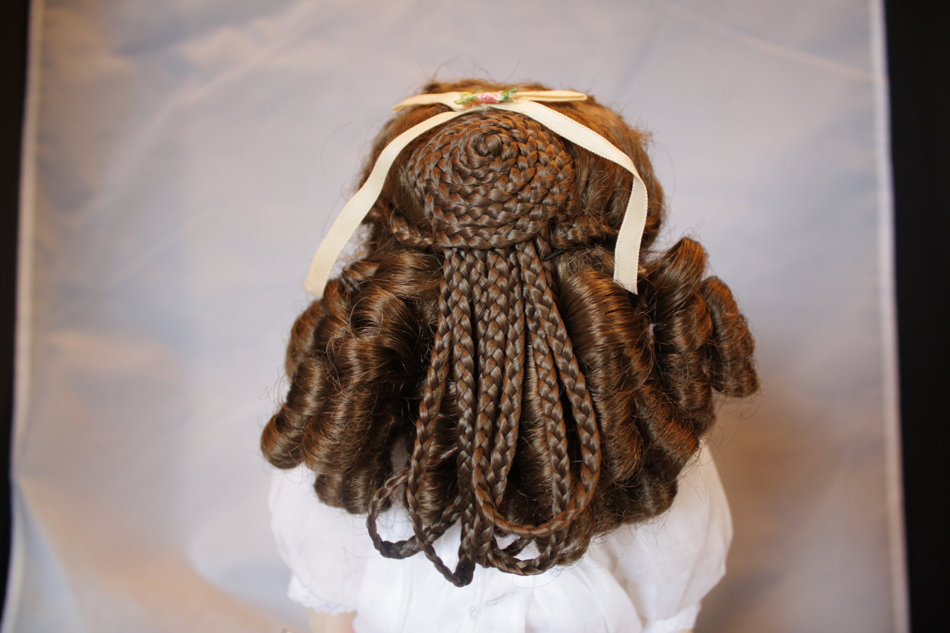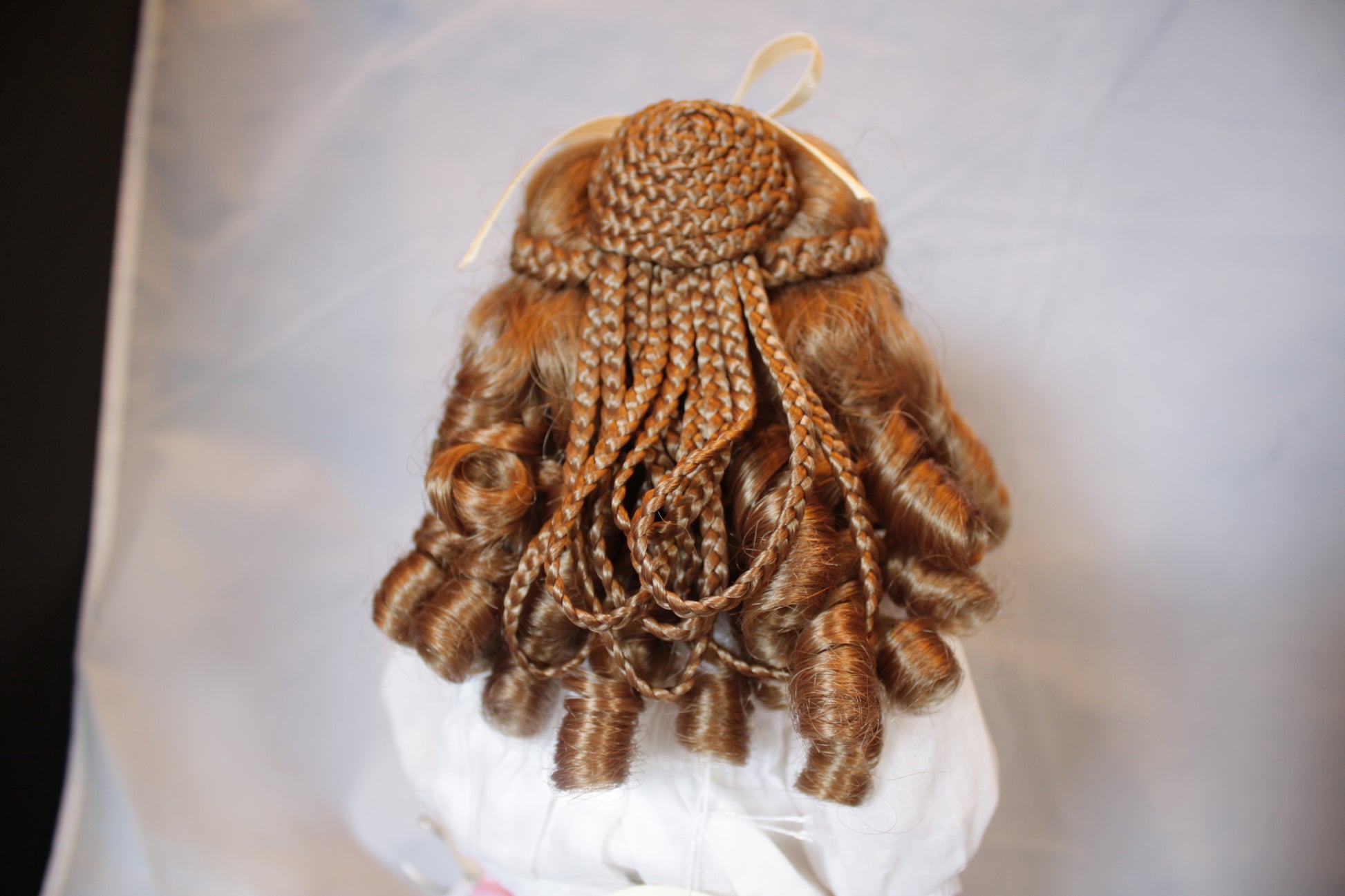 This synthetic hair wig is an antique reproduction style wig with ringlets and a braided crown.