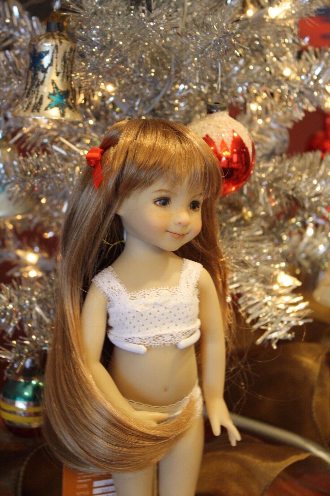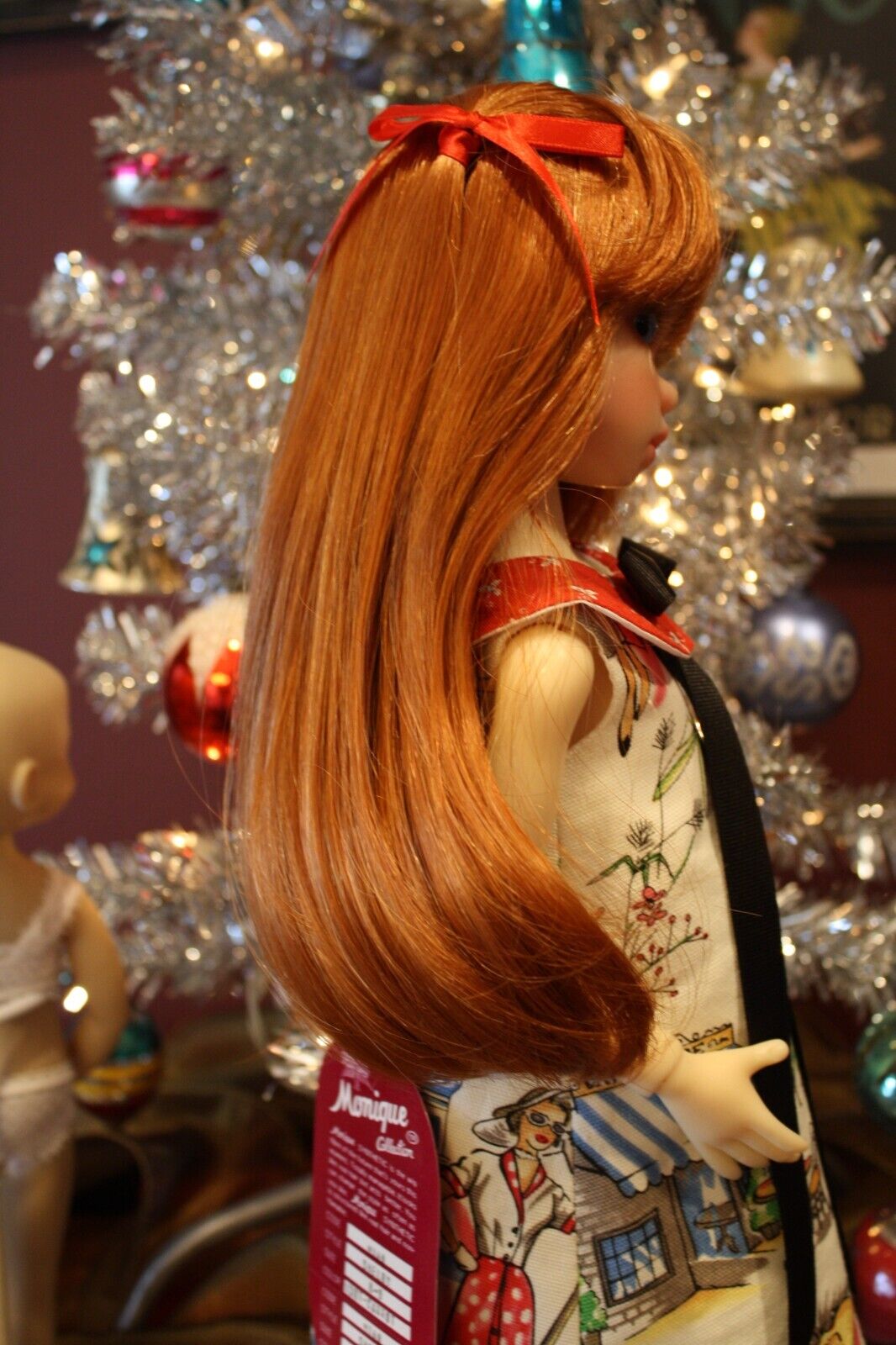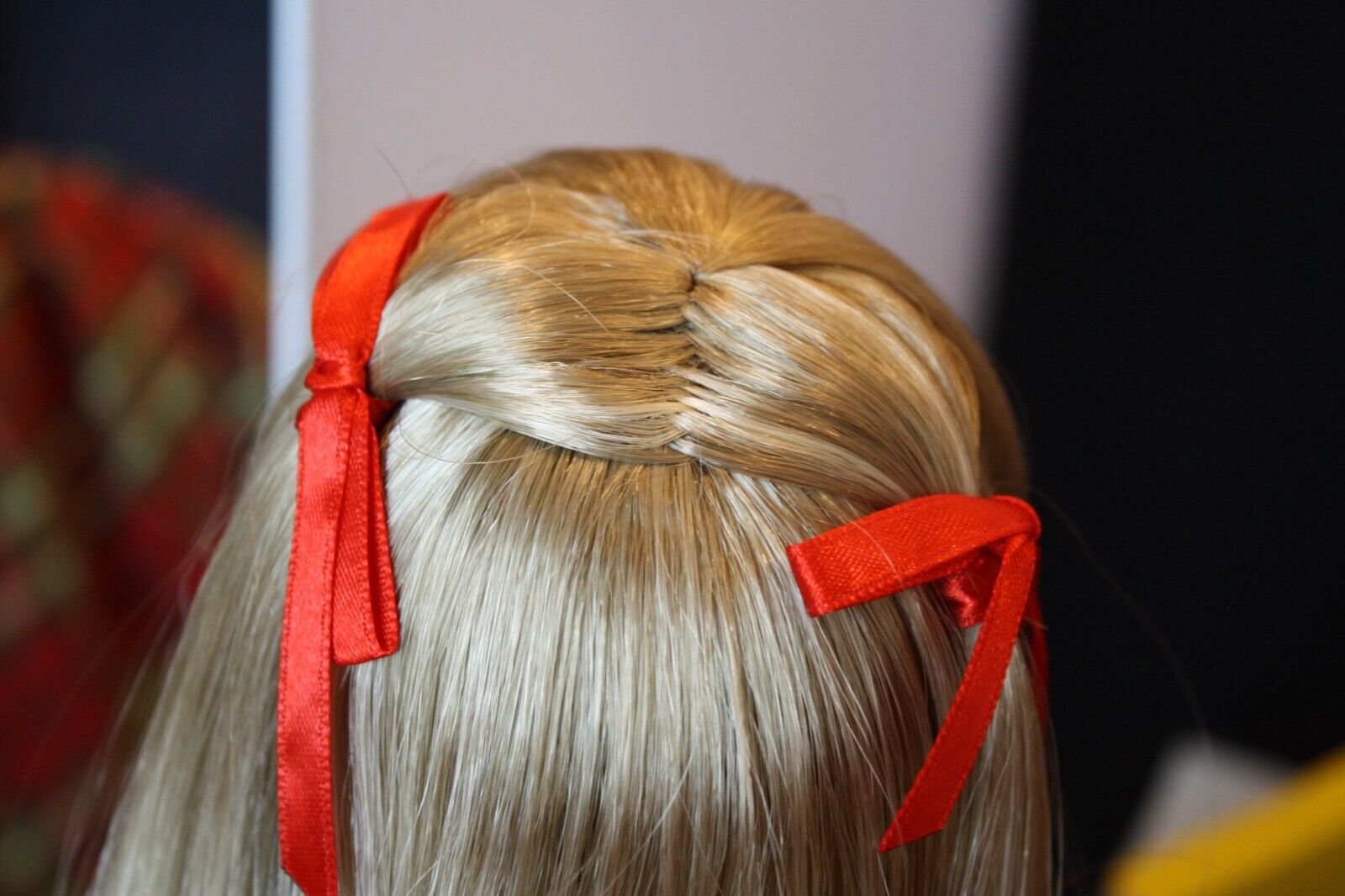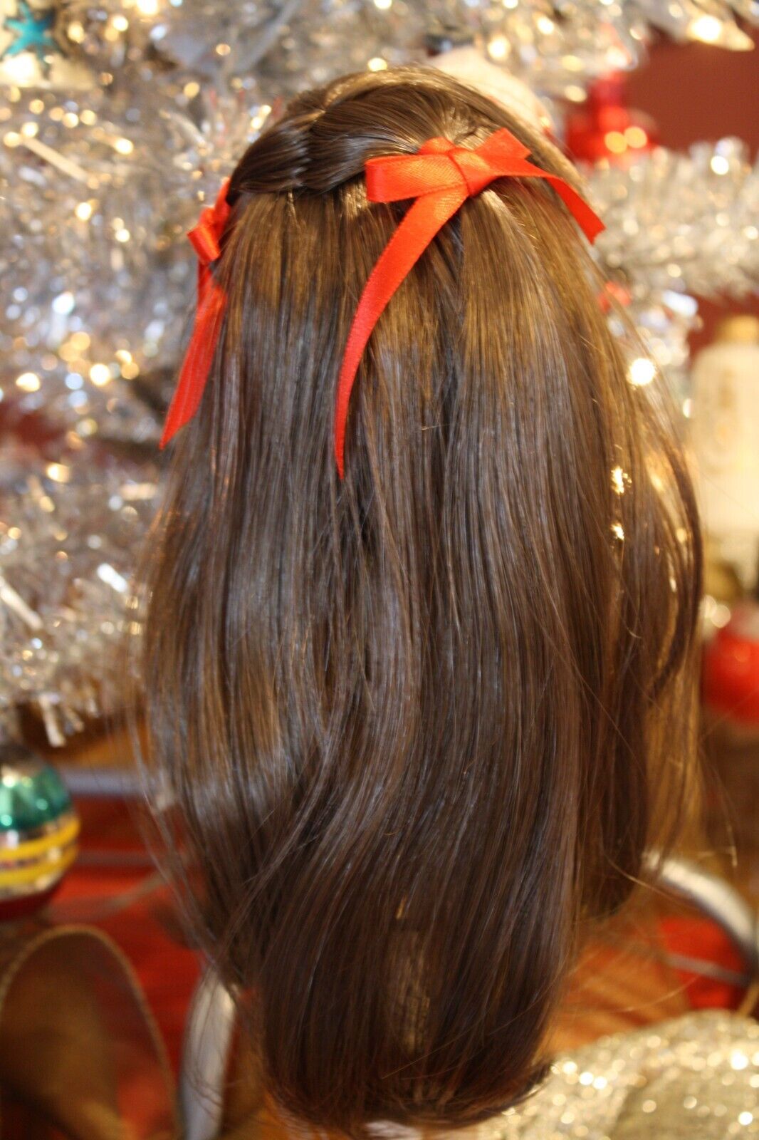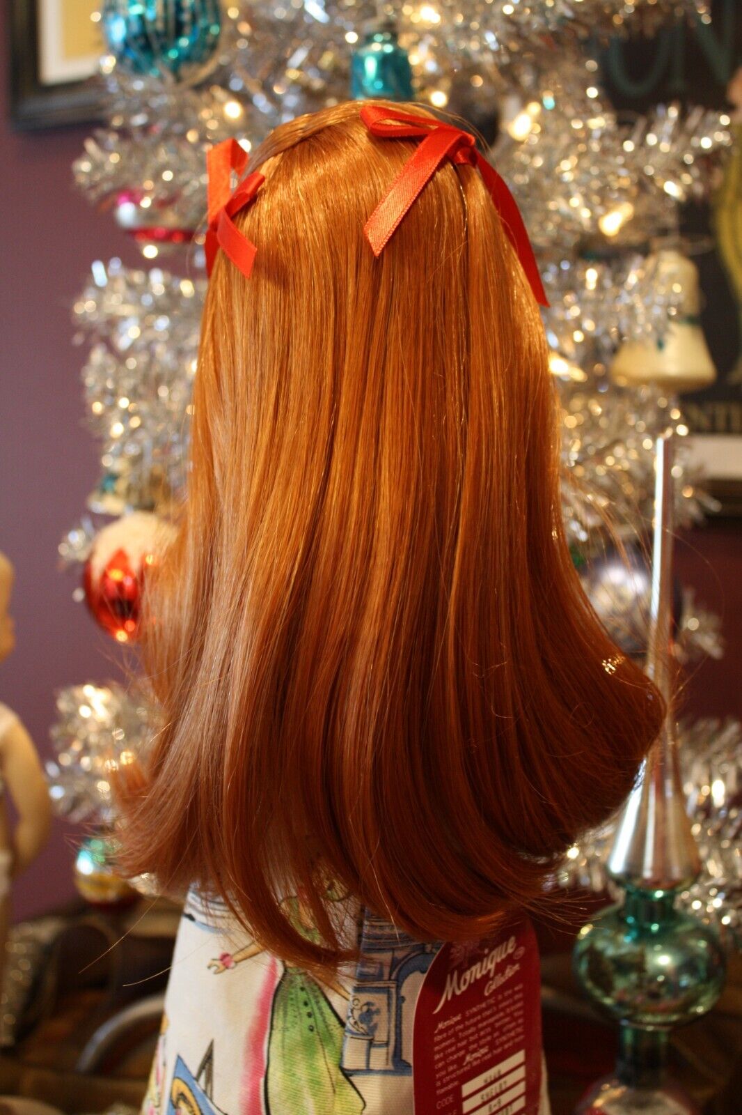 This sweet Shelby style synthetic wig has bangs and a center part. It comes with tiny bows on each side that pulls up just a small amount of hair.