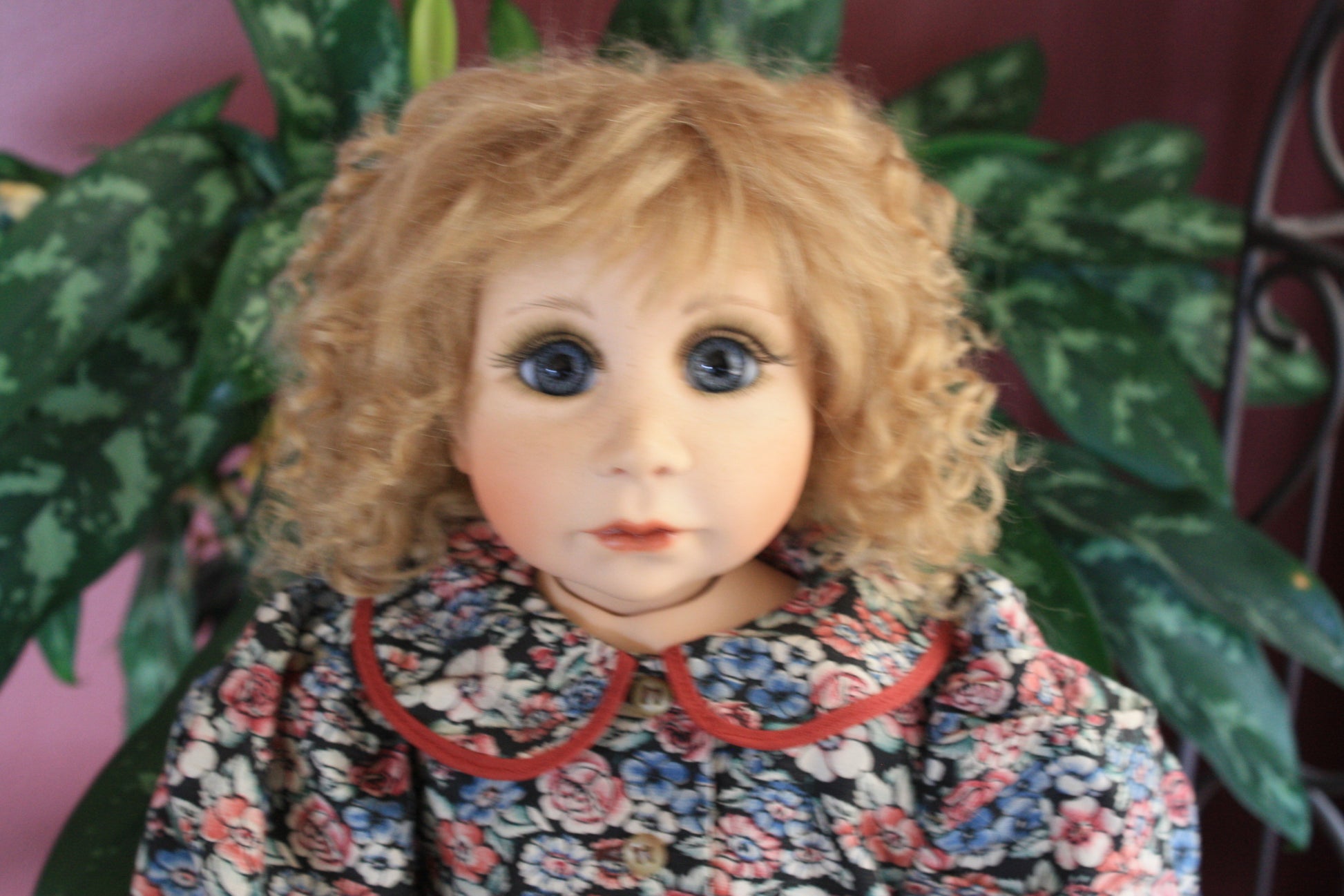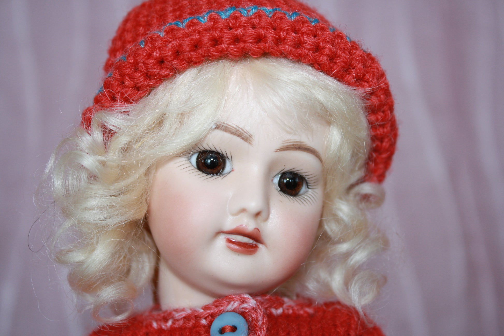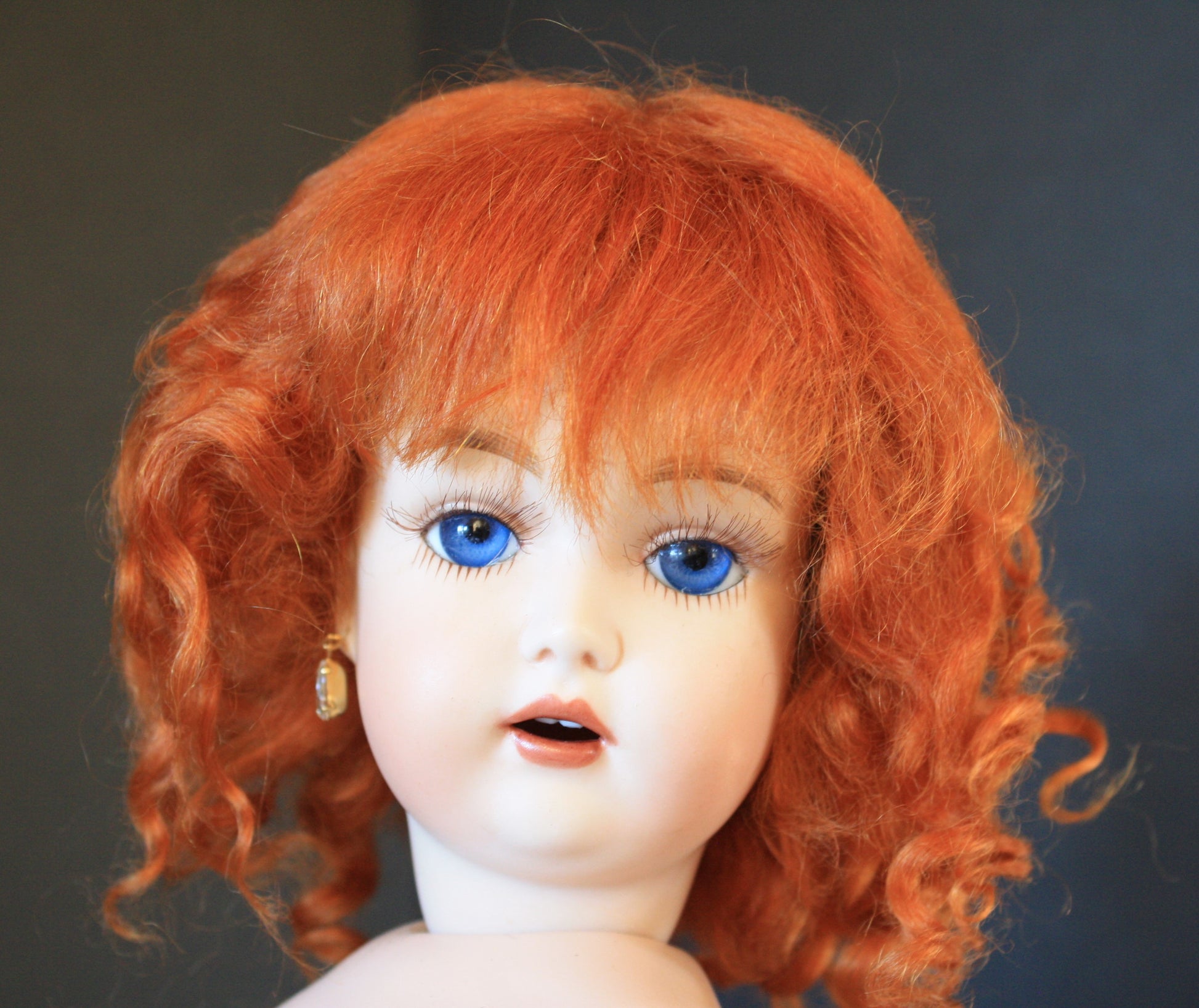 This Mohair wig has a shorter cut with thick curls reaching the shoulders with straight bangs that will adorn the forehead of your favorite doll.