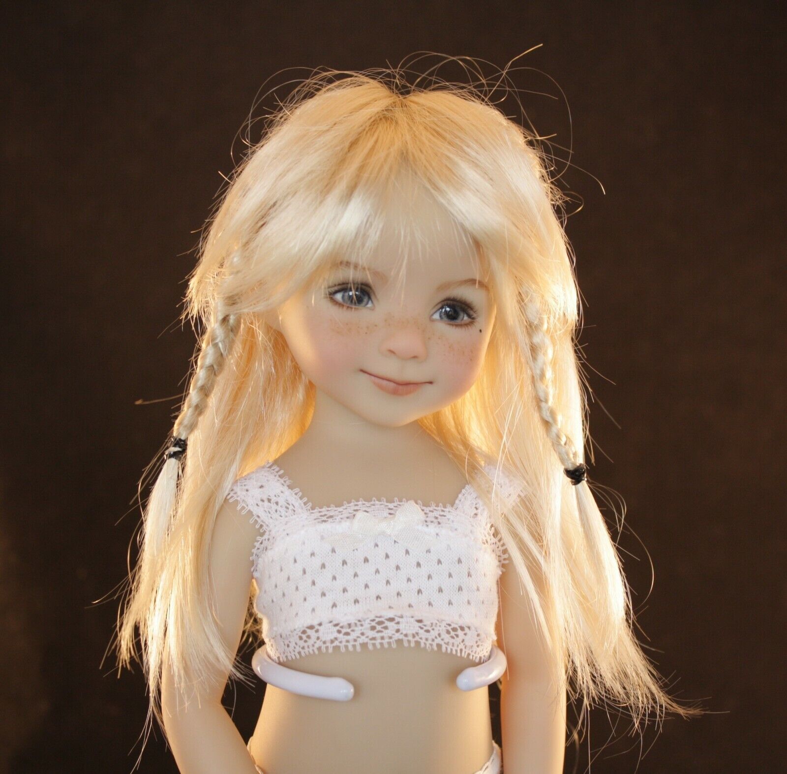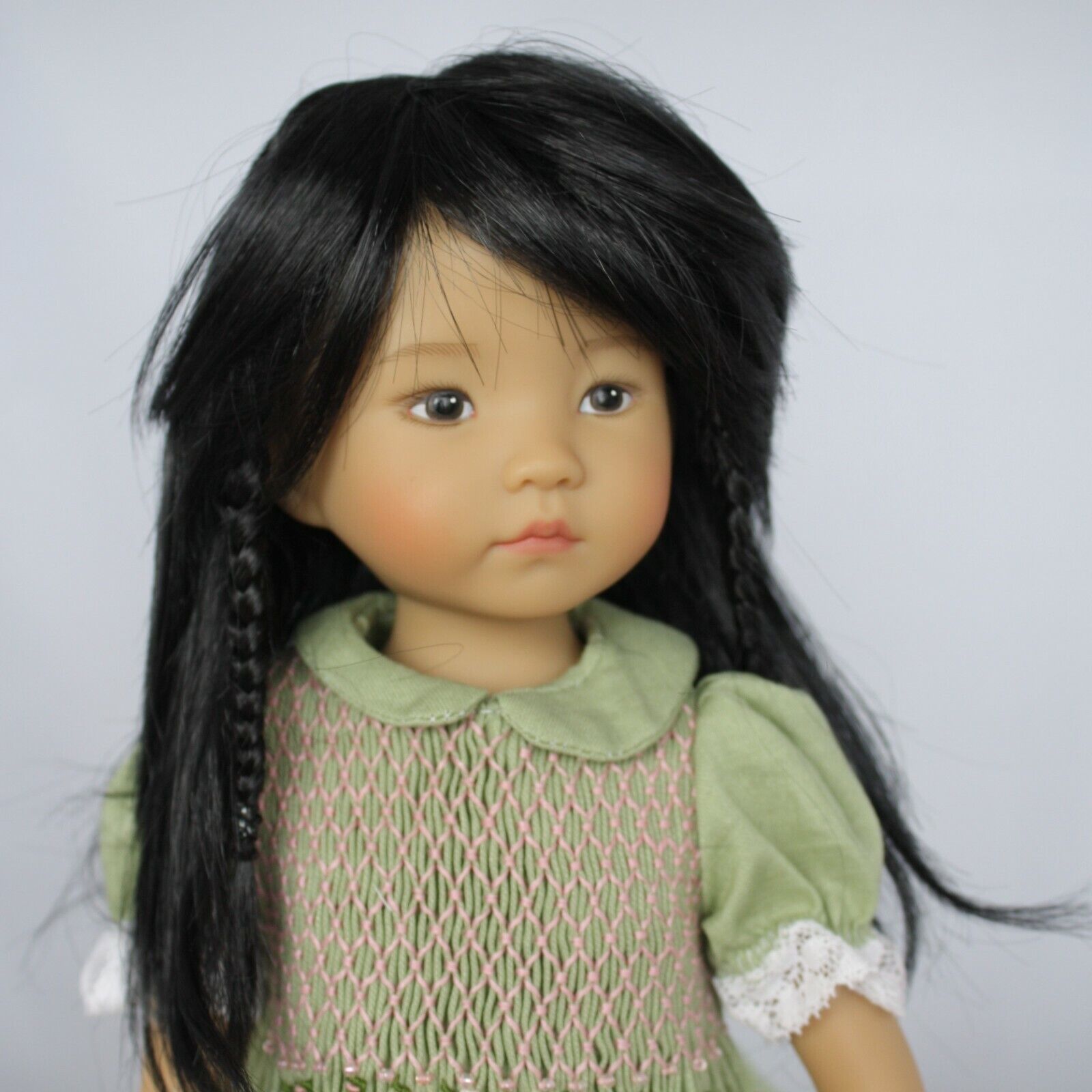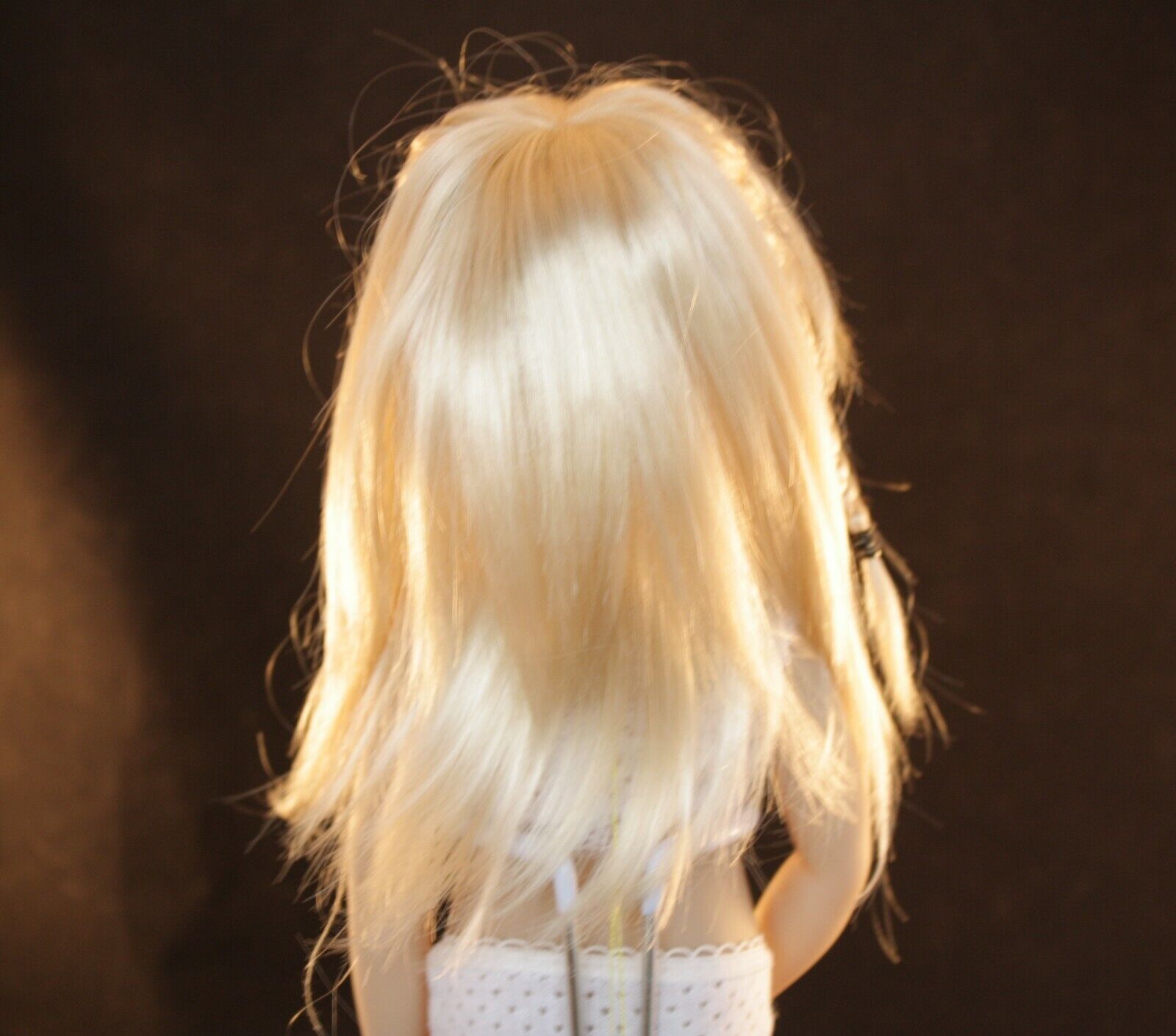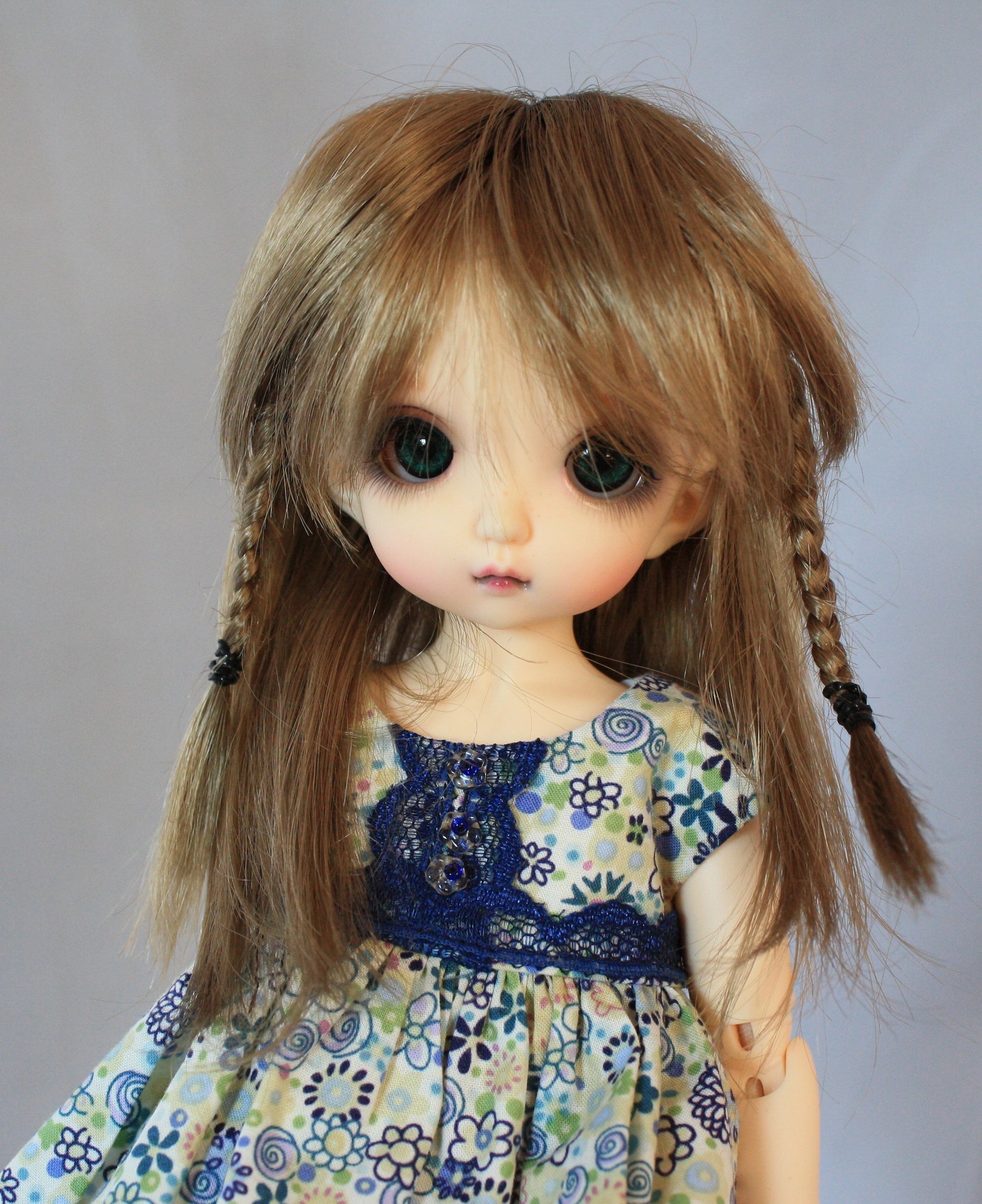 Adorable little wig its shaggy with bangs and a braid on each side.