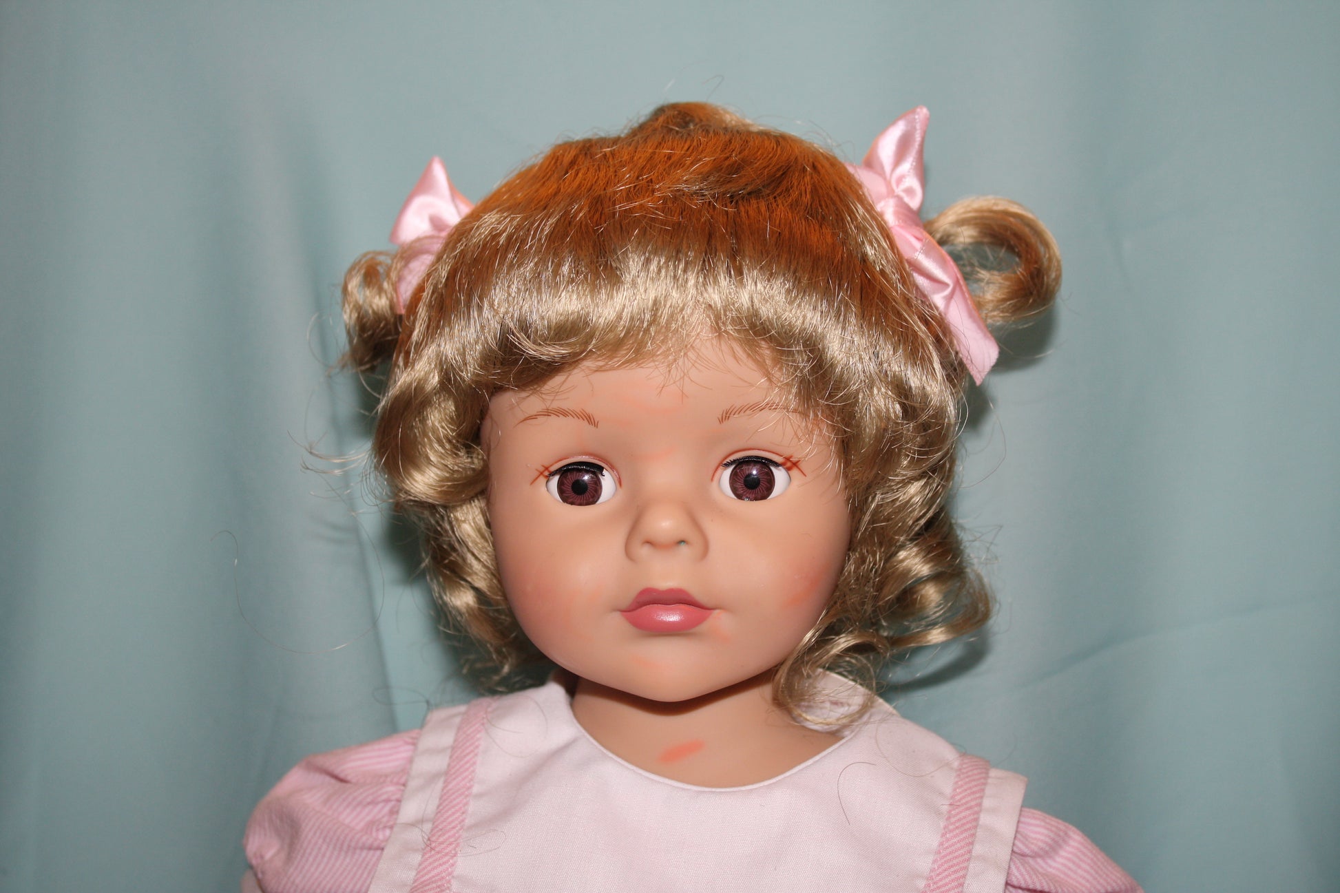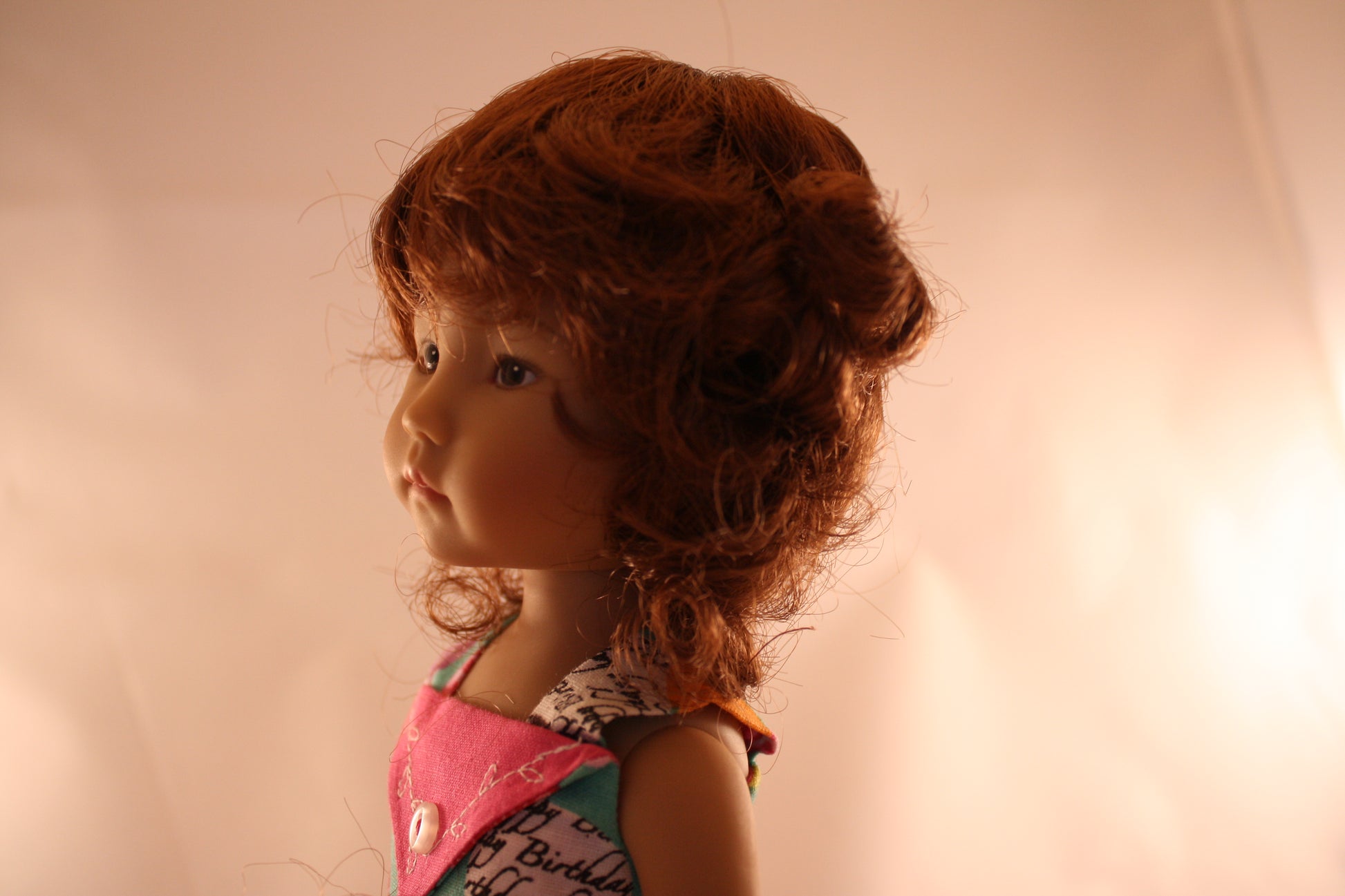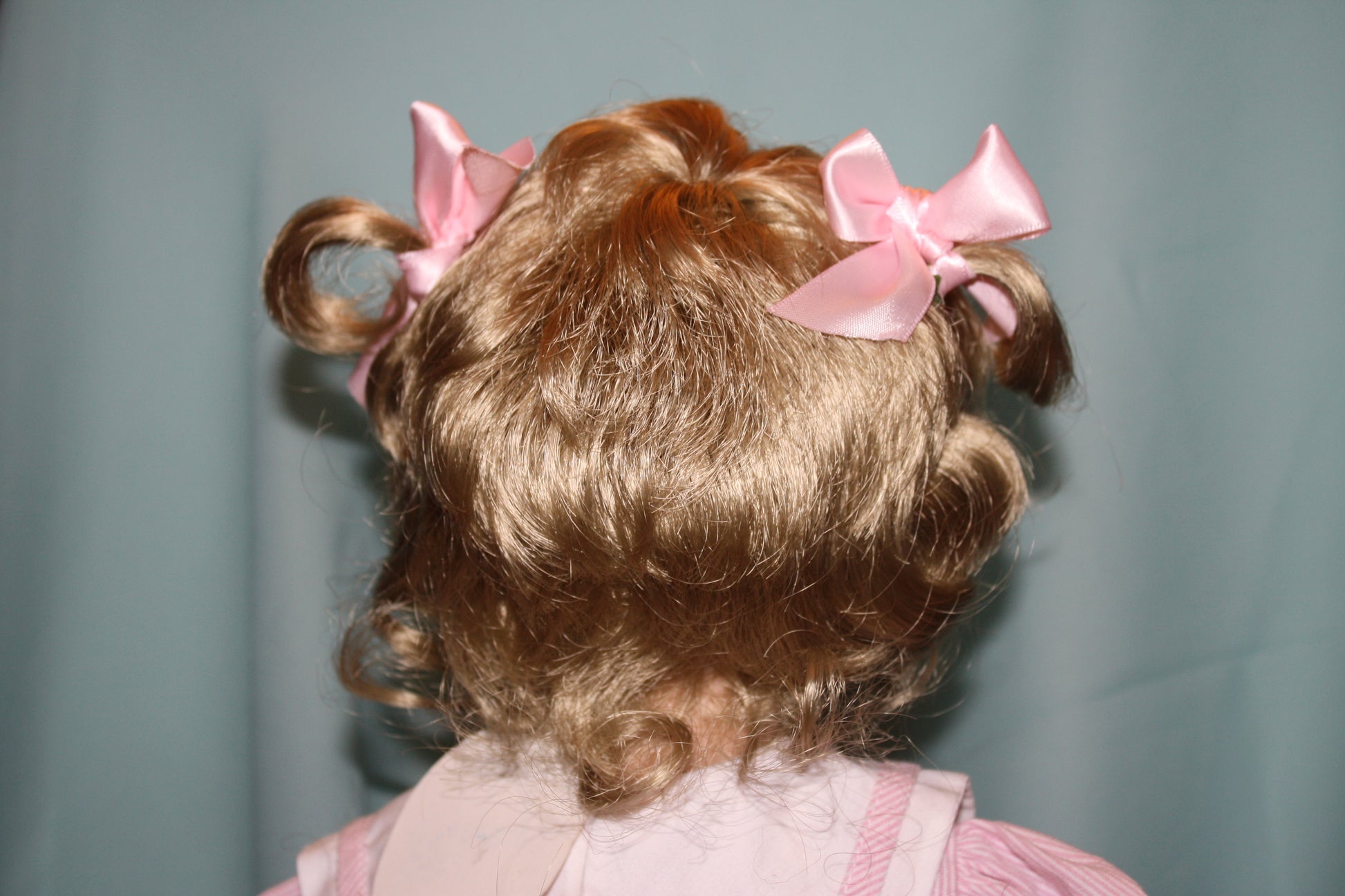 Sweetie is a short styled wig with 2 tiny ponytails on the side of the head. It has little wispy curls around the neck. Bows no included.