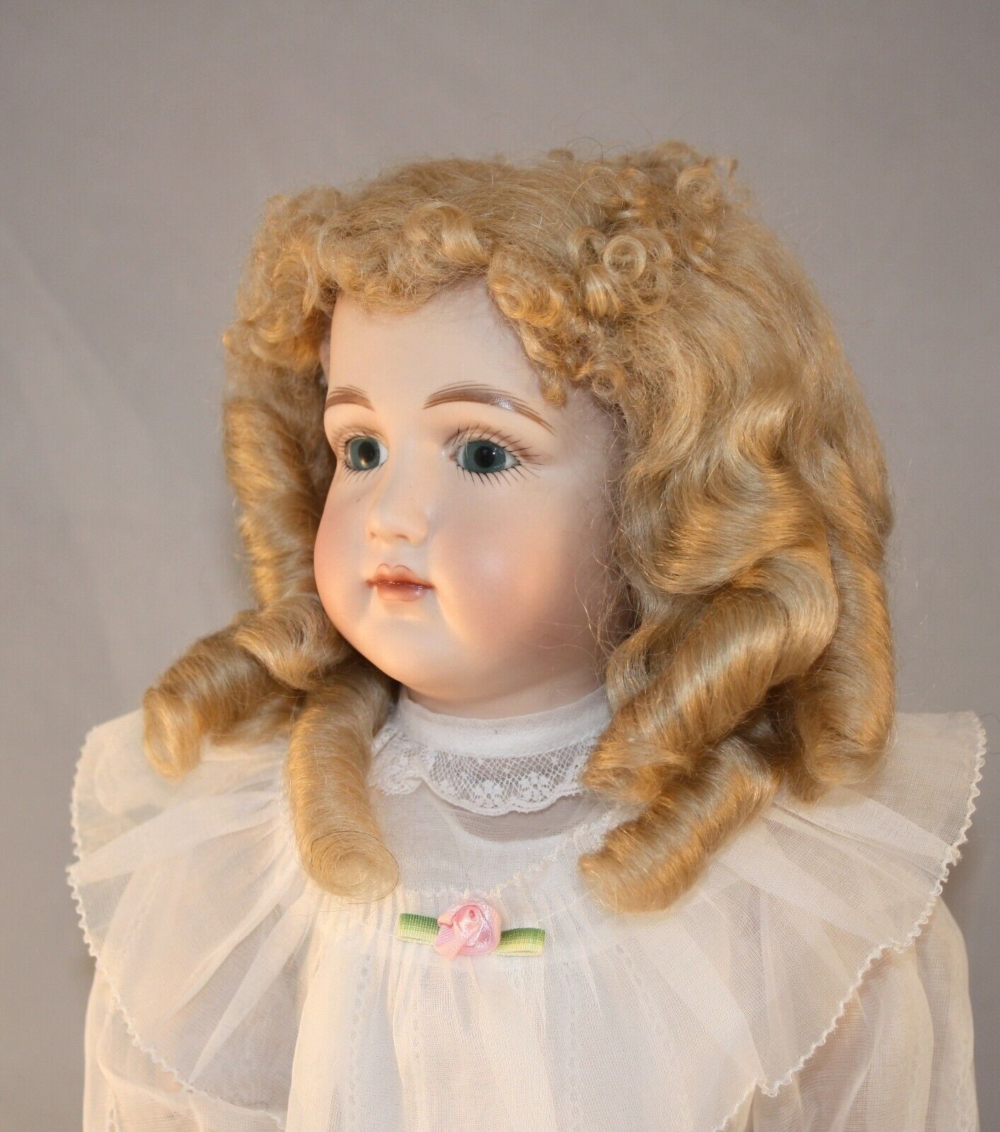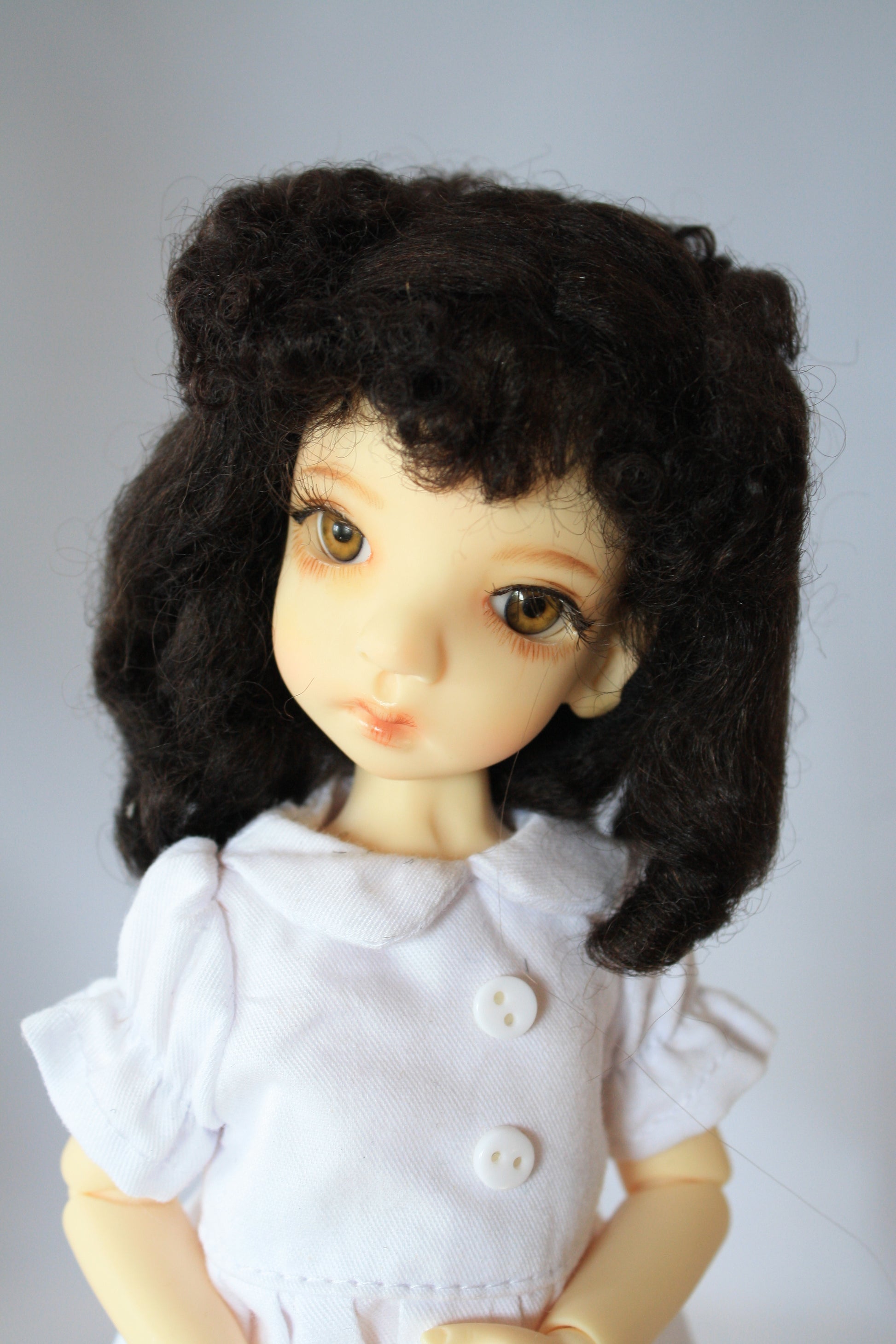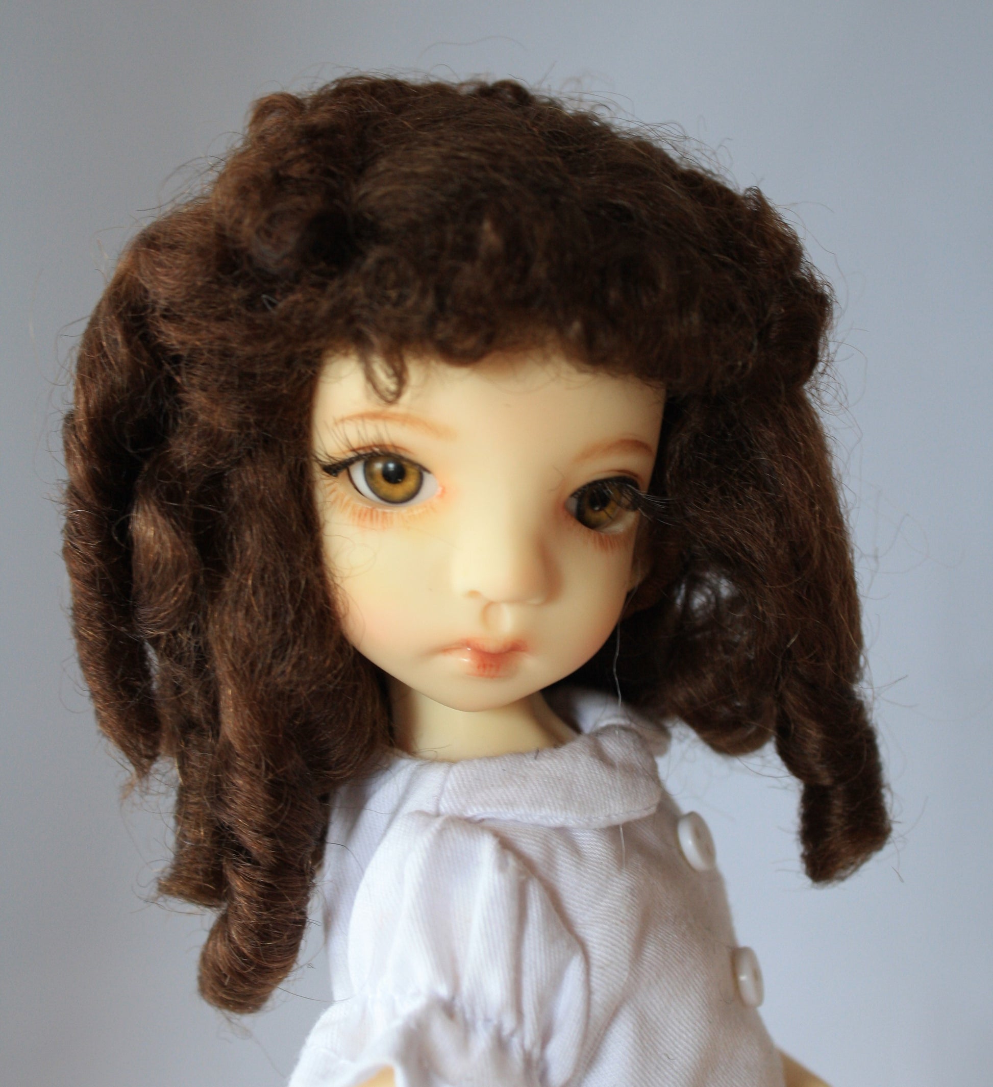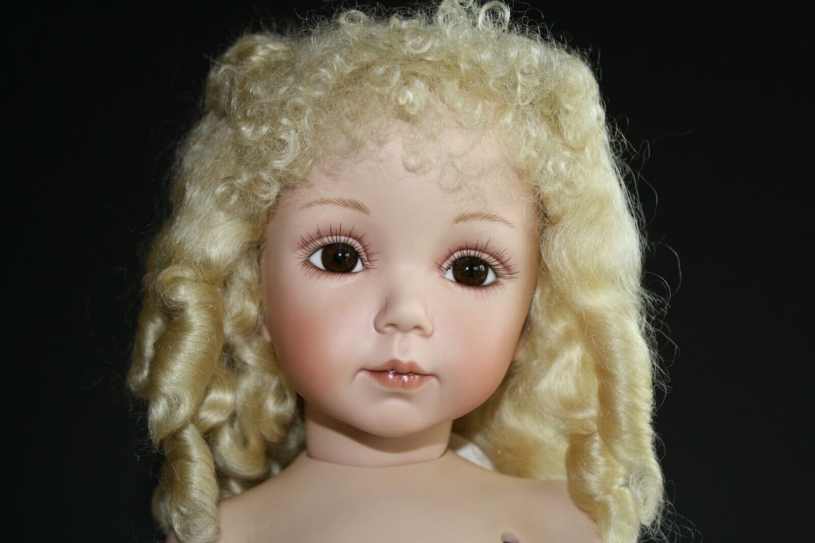 The Trisha wig has a small center part with a circle of tiny curls around the crown. The longer hair is all in ringlets. Perfect for any doll!
