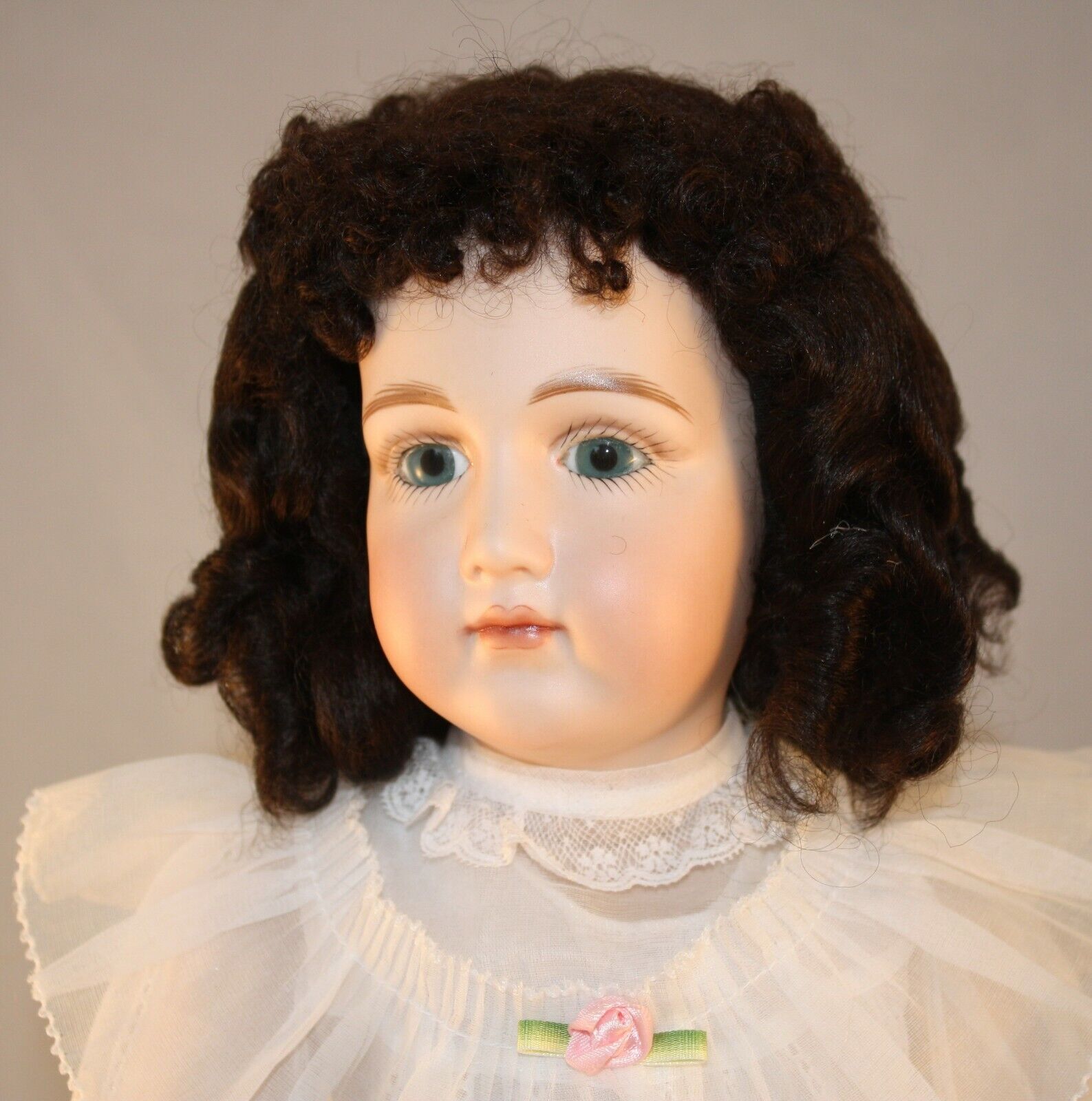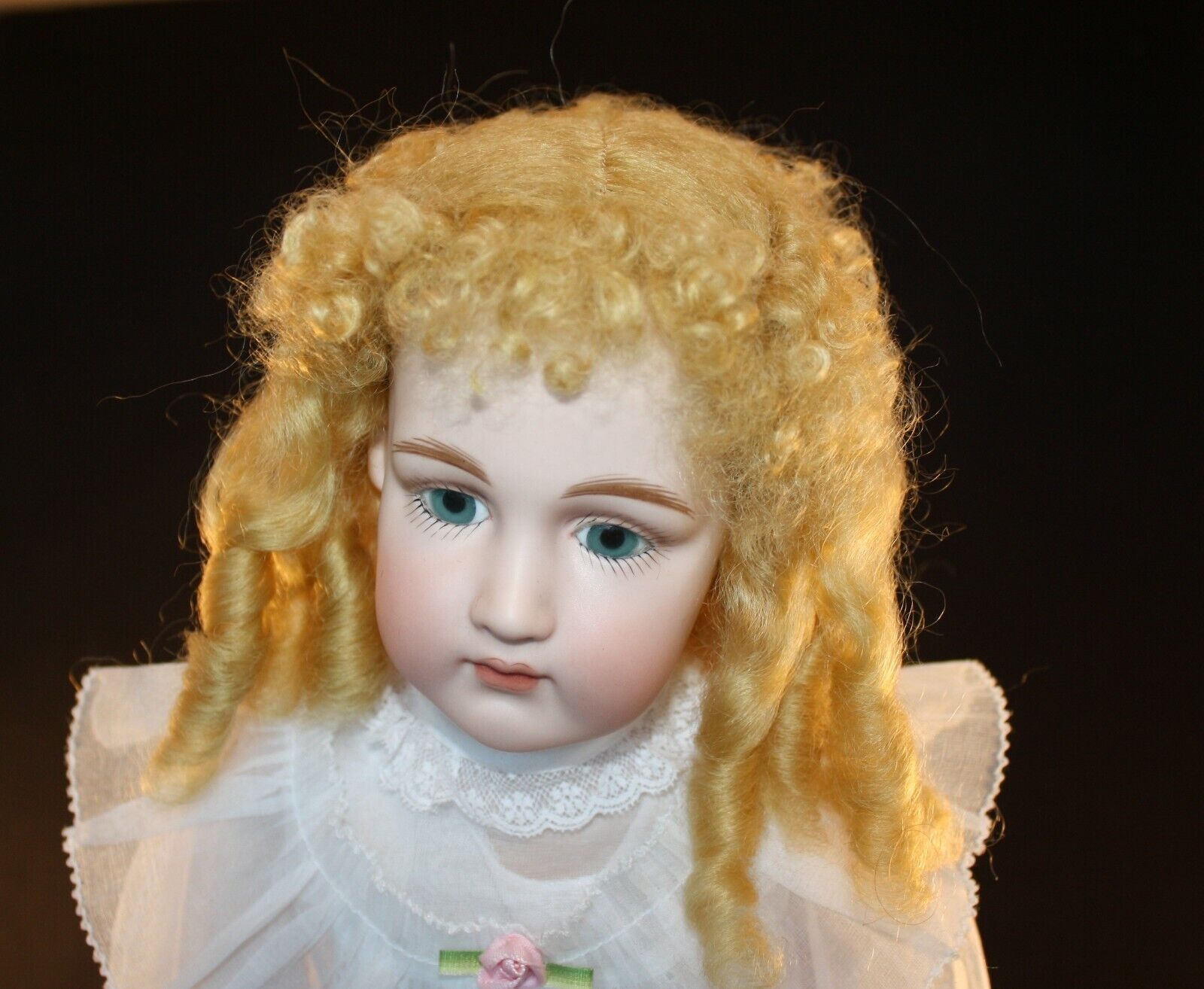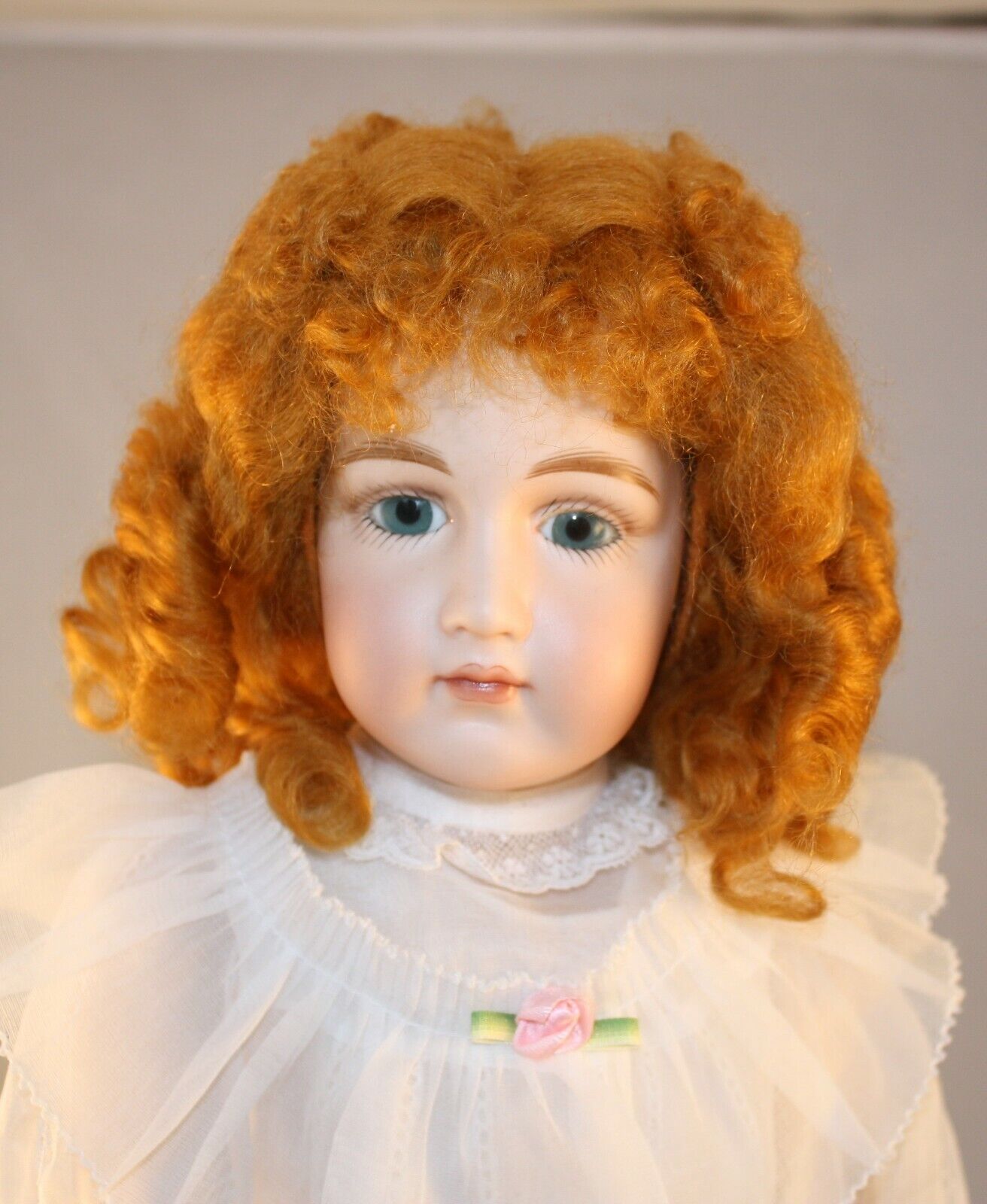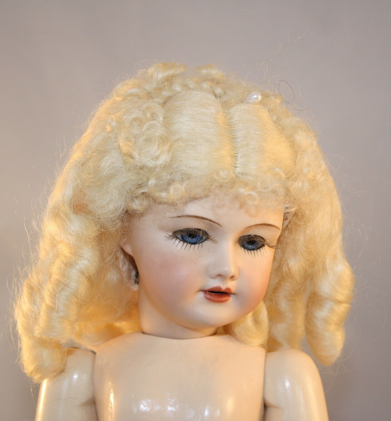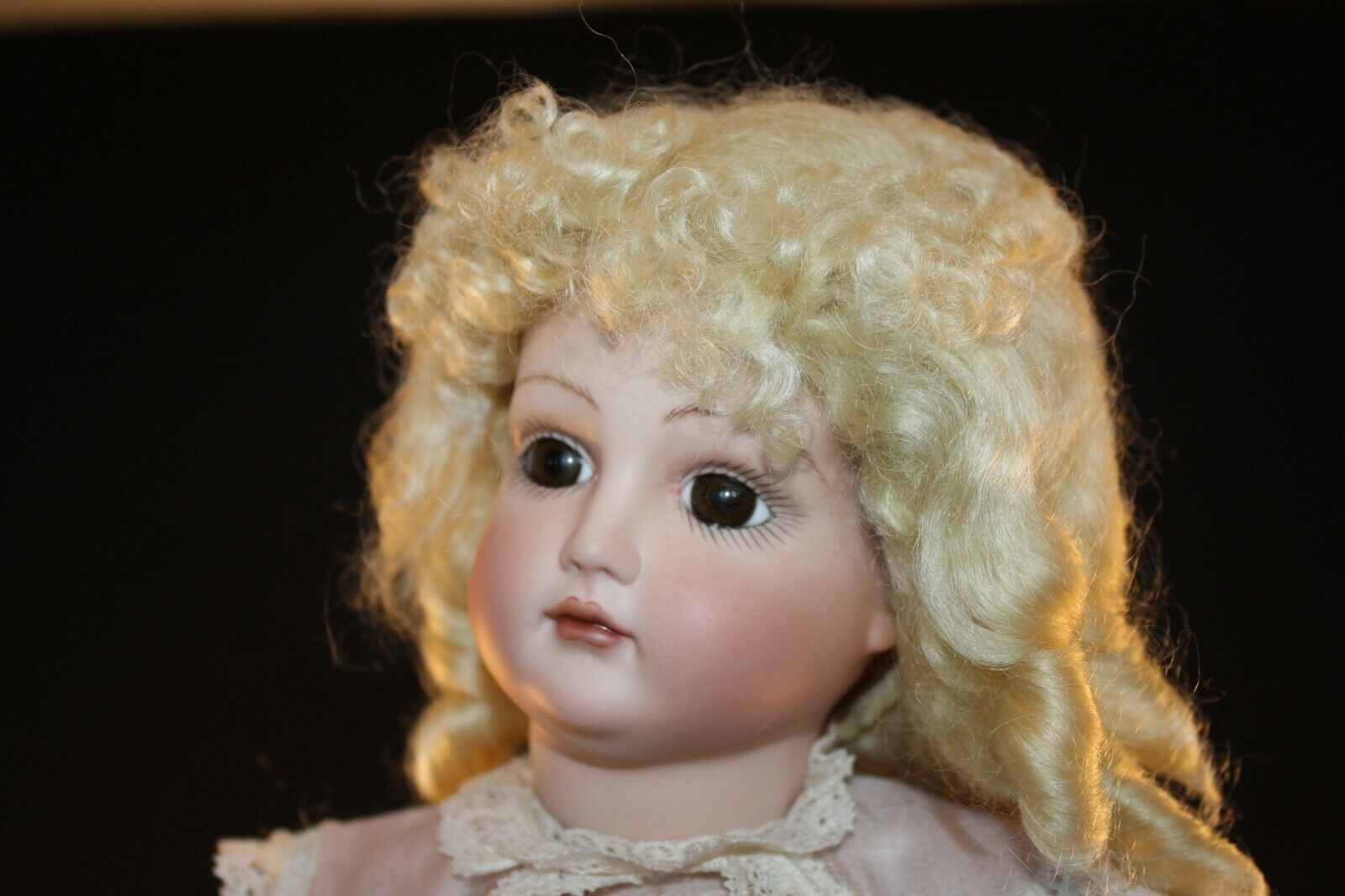 The Trisha wig has a small center part with a circle of tiny curls around the crown. The longer hair is all in ringlets. Perfect for any doll!